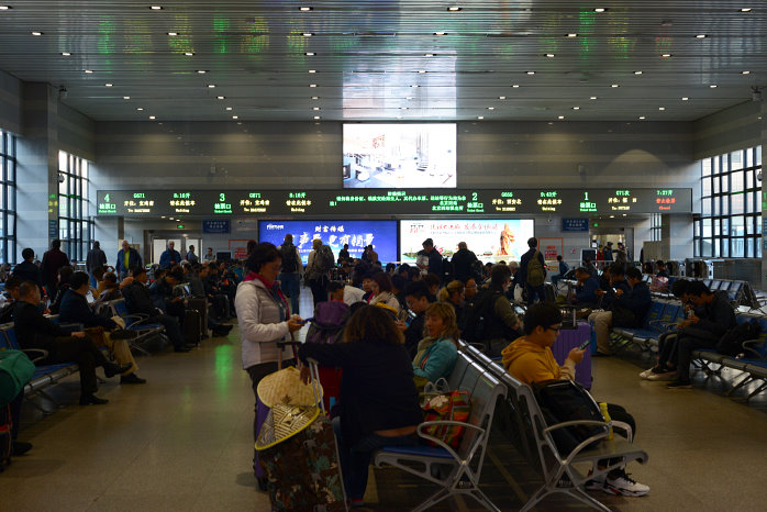 Heute geht es per Hochgeschwindigkeitszug nach Luoyang. Er startet um 8:17. Trotz früher Abfahrt am Hotel um 6:15 gibt es schon Stau. Der Bahnhof gleicht einem Flughafen. Das Gepäck und man selbst wird am Eingang gescannt. Dann geht es mit der Rolltreppe hoch auf einen ewig langen Flur von dem links und rechts große Wartesäle abgehen. Der Zug ist ein echtes Massenverkehrsmittel. Wir fahren etwa 4Stunden mit 300km/h. Also fahren wir auch eine ganz schöne Strecke. Die Fahrt kostet 368¥ - etwa 40€. In der Wartehalle gibt es Geschäfte mit Lebensmitteln. Interessant sind die vielen Instantsuppen. Da es an Bahnhöfen und in Zügen kostenlos heisses Wasser gibt, ist das echt praktisch. Natürlich gibt es überall die beliebten Snacks wie Hühnerfüße zum knabbern und so was.
