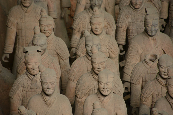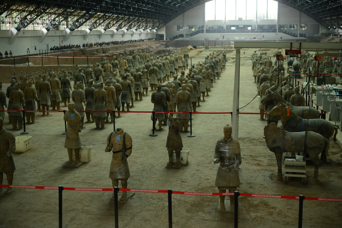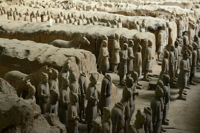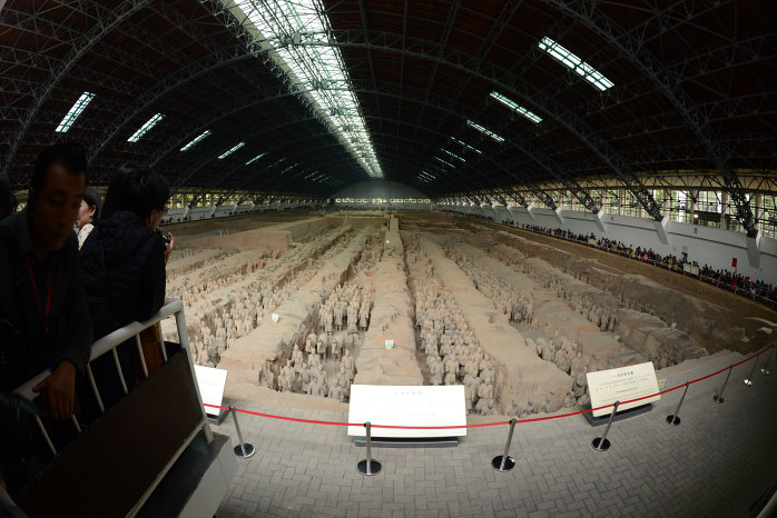 Vollgefressen fahren wir nur noch ein paar Kilometer bis zur Ausgrabungsstätte. Schon auf dem Parkplatz sieht man, dass wir nicht alleine sind. Liegt es am Samstag oder am schlechten Wetter? Man muss ein kleines Stück laufen, durch 2 Kontrollen und schon steht man vor der ersten von 4 Hallen. Alles was in China Stäbchen halten kann steht vor uns. Wir sehen nur Hinterköpfe. "Aktives Anstehen" muss man erst lernen. Wir ergattern tatsächlich einen kleinen Platz an der Balustrade um auf die berühmten tönernen Krieger zu schauen. Es werden über 7000 auf dem Gelände vermutet. Das Licht ist grauslich zum fotografieren. Gott sei Dank ist die Sprachübertragung per Funk schon erfunden sonst wäre es bei den vielen chinesischen Guides ein Höllenlärm. Verteidigt man seinen Platz nicht mannhaft genug stehen flugs mehrere Chinesen vor einem.