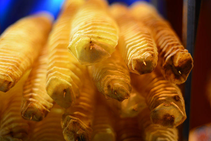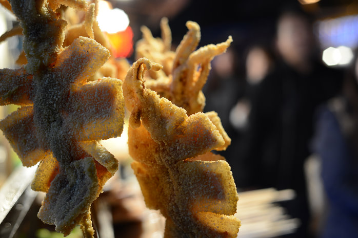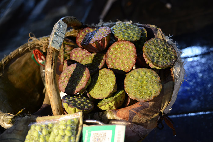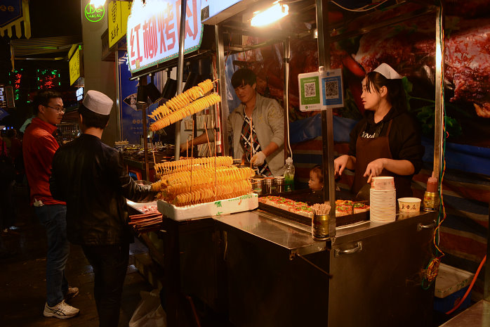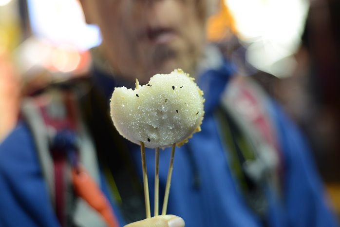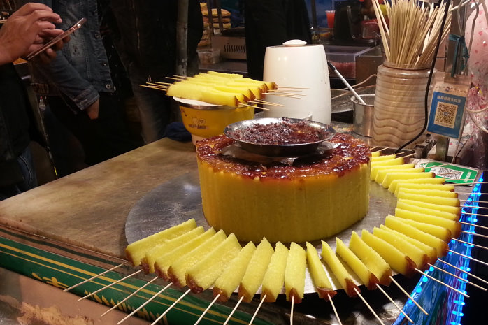 Nach dem opulenten Mahl heute Mittag sind wir immer noch satt, aber so eine Kleinigkeit ... Wir gönnen uns einen Granatapfelsaft, denn die werden hier großflächig angebaut. Danach gibt es ein, tja, keine Ahnung was. Irgendwas mit Reis und Zimt auf einem Stöckchen, wie fast alles hier. Lässt sich so leichter essen. Ausserdem Fettgebackenes mit Feige drin und ein Reisküchlein was uns schon gestern aufgefallen ist. Komisch nur das die Chinesen alle lachen als Elke reinbeisst!?