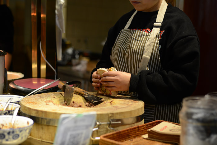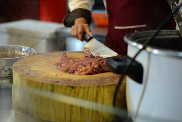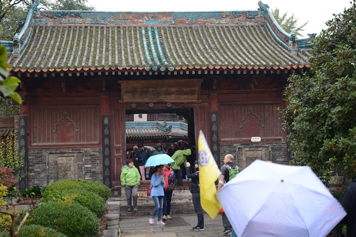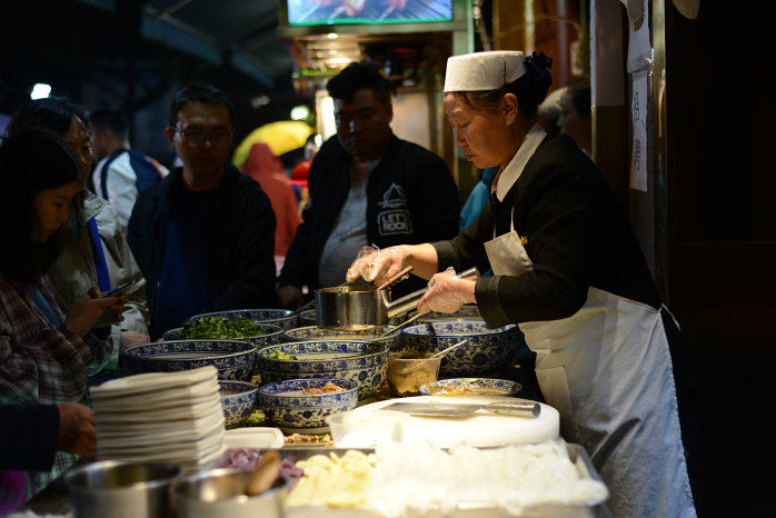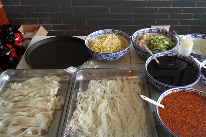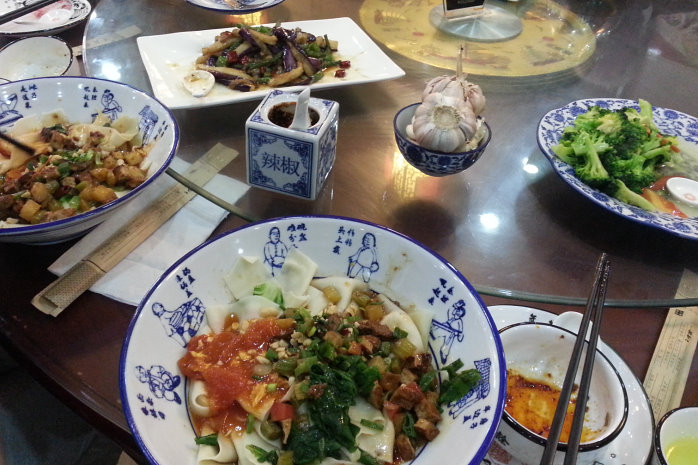 Dann, es ist kurz vor 12, geht es in ein Restaurant - wir könnten ja verhungern. Die Spezialität von Xi’An sind Nudeln – und die kriegen wir jetzt. Jeder bekommt eine Suppenschüssel voll selbstgemachter Nudeln. Ausserdem darin Gemüse und eine sehr leckere Brühe. Klasse. Genau das richtige für mich. Das alleine wäre schon genug, aber zusätzlich gibt es noch eine Schale gebratenes Gemüse, Fleisch mit Zwiebeln, süßsaueres Schweinefleisch und mit Fleisch gefüllte Nudeln. Zu guter Letzt auch noch ein riesiger Pott Suppe. Ich gebe mir echt Mühe und schaffe wenigstens meinen eigenen Nudelpott und noch ein paar Gefüllte, aber es ist wie eigentlich immer viel zu viel.