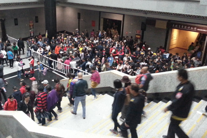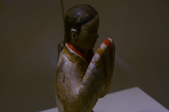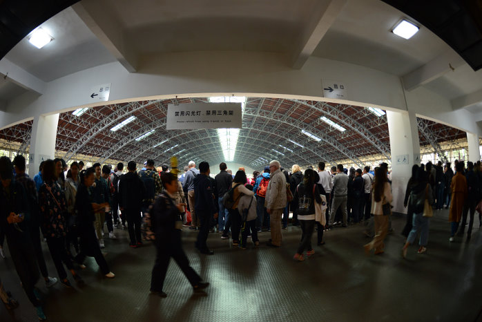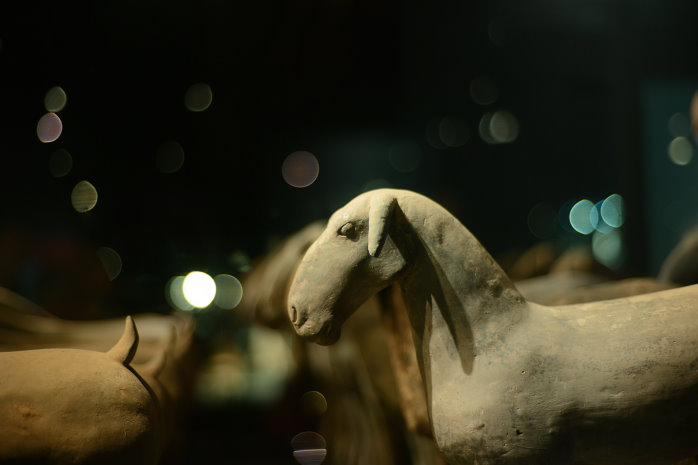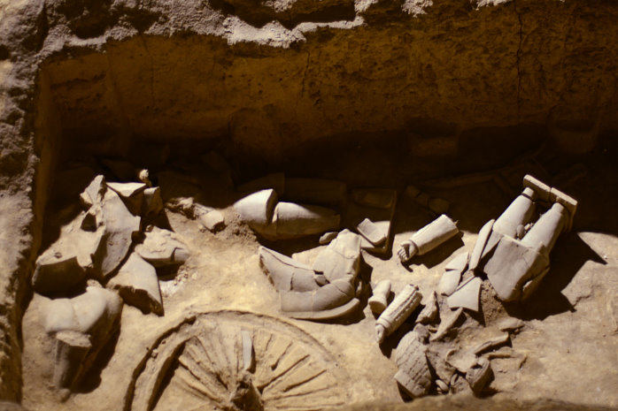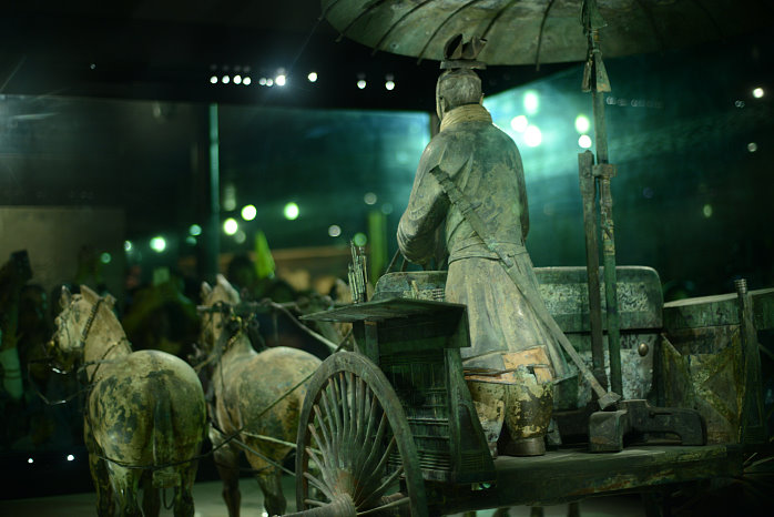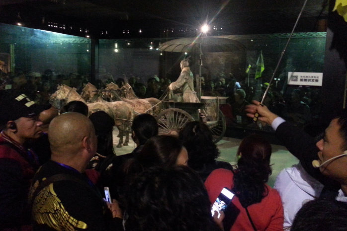 Nach der ersten kommt die 2. und 3. Halle. Die sind weniger spektakulär und daher auch weniger voll. Jetzt gönnen wir uns einen Kaffee. Der ist nicht nur der schlechteste bisher sondern auch der teuerste. Derart gestärkt laufen wir zu Halle 4. Hier im Museum wird der absolute Höhepunkt ausgestellt – der "Bronzewagen". 4 Pferde ziehen eine Kutsche. Schon der Treppenabgang ist irgendwie voll, aber der Ausstellungsraum ist die Hölle. Proppevoll, ein Höllenlärm, die Luft ist zum schneiden und die Art an die Glasscheibe zu kommen gleicht einem Krieg. Jeder gegen Jeden. Wir stürzen uns ins Getümmel und schaffen es bis an die Scheibe heran. Mit Schnappatmung und Platzangstgefühl schaffen wir es auch wieder nach draussen zu gelangen. Mittlerweile regnet es. Schade. Kein Licht zum fotografieren.