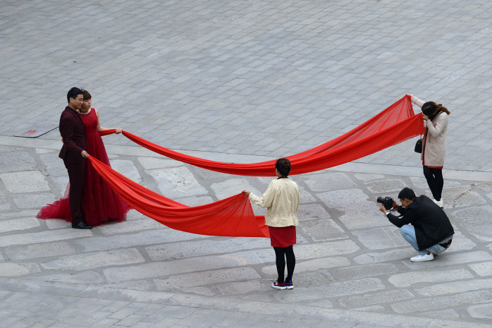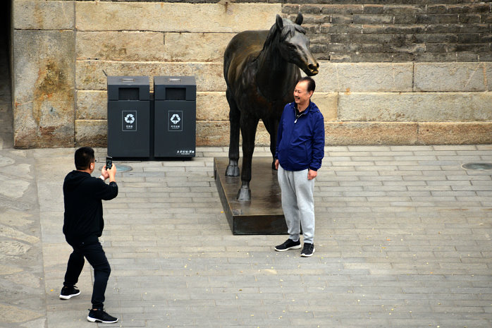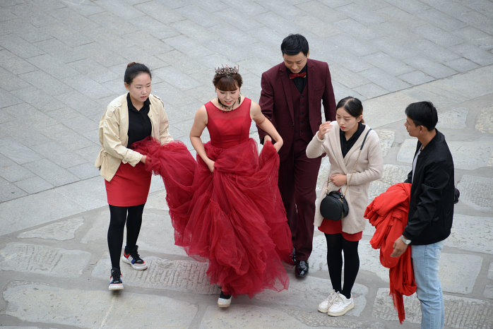 Kun kauft Eintrittskarten und erzählt uns etwas aus der Geschichte der Gebäude und der Stadtmauer. Erst dann dürfen wir auf die 14km lange, 12m hohe und 16m dicke Stadtmauer und haben etwas Zeit zum fotografieren. Leider ist es heute grau in grau. Schade. Hochzeitsfotos sind hier groß in Mode und so sehen wir auch noch ein profesionelles Shooting.