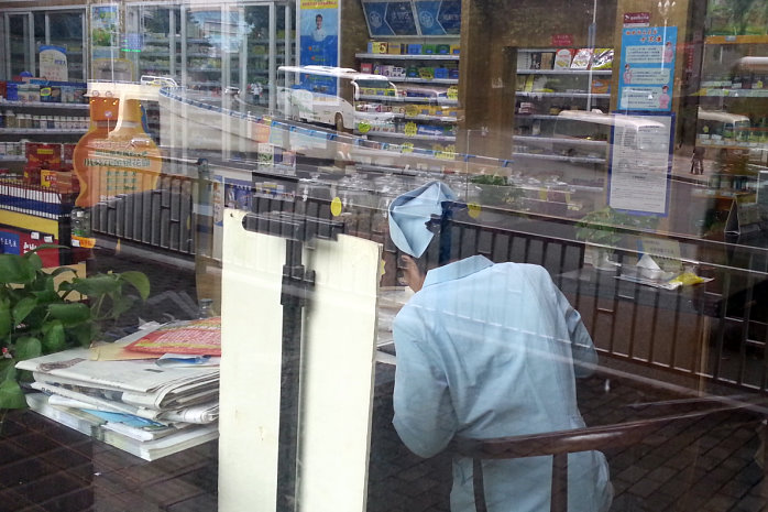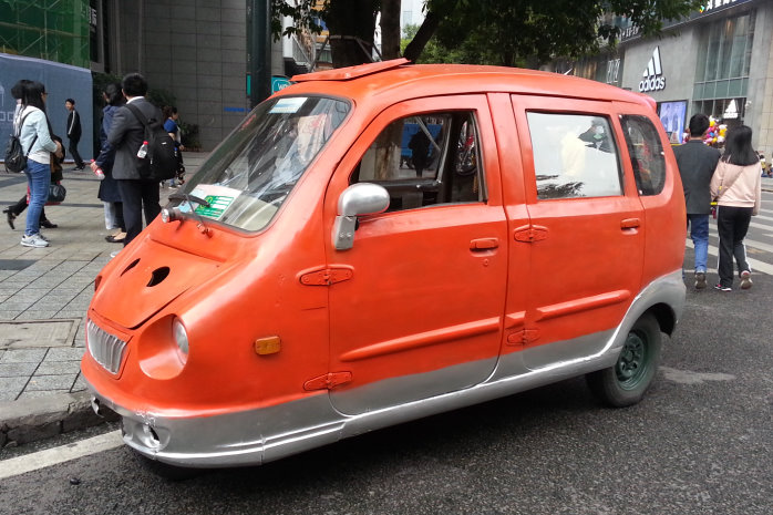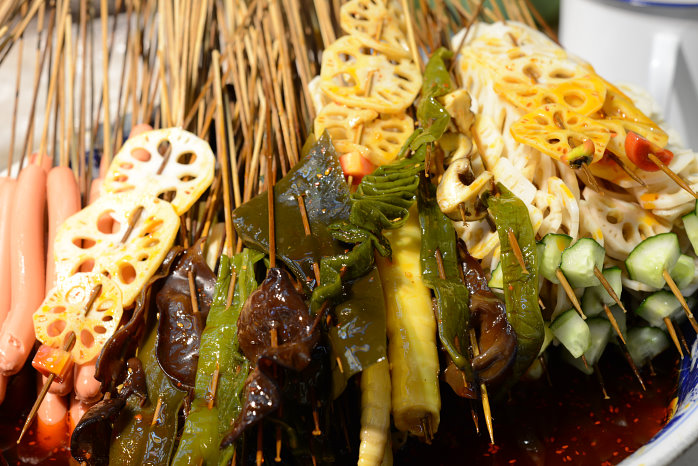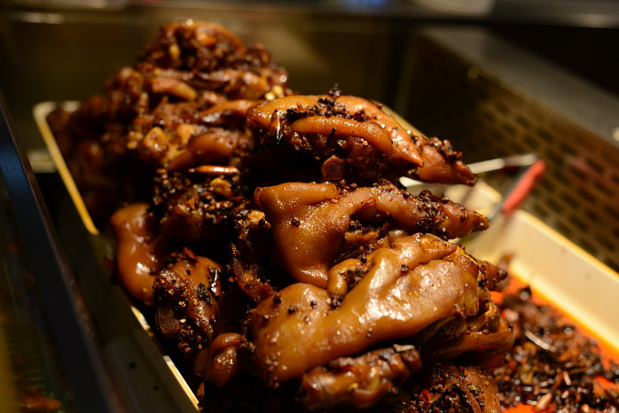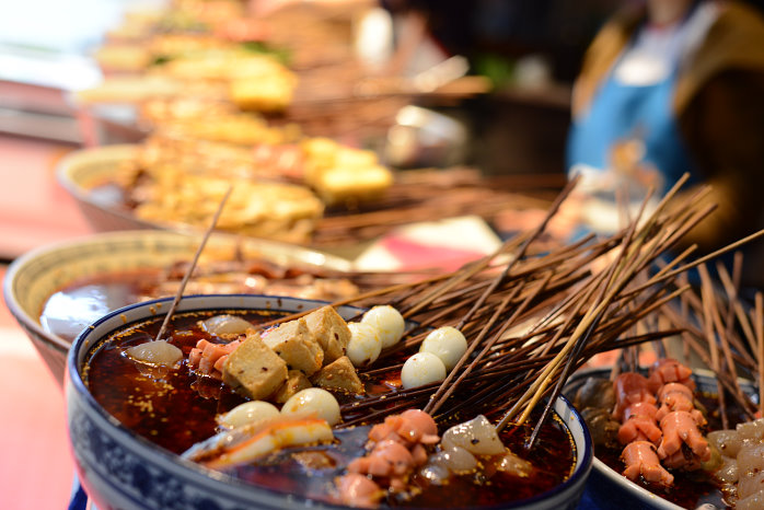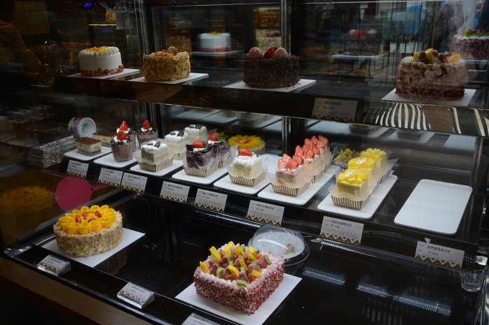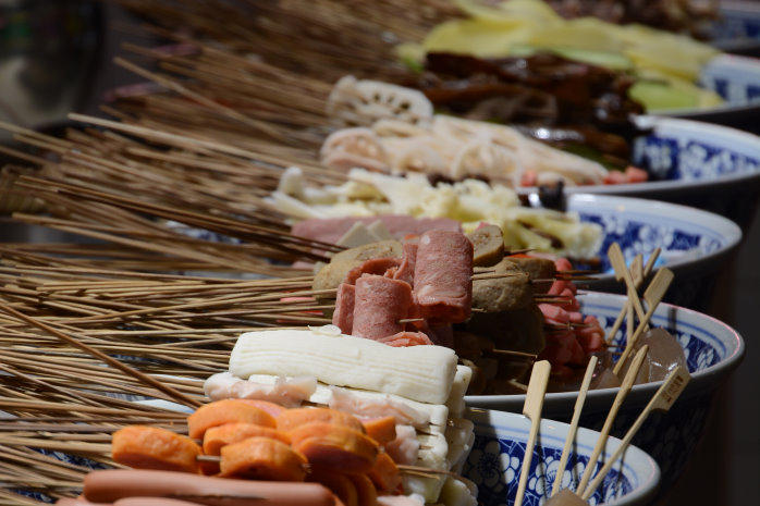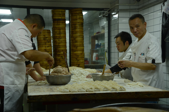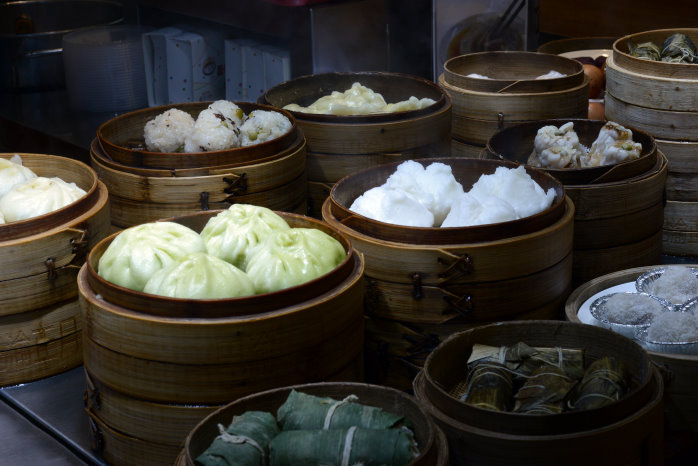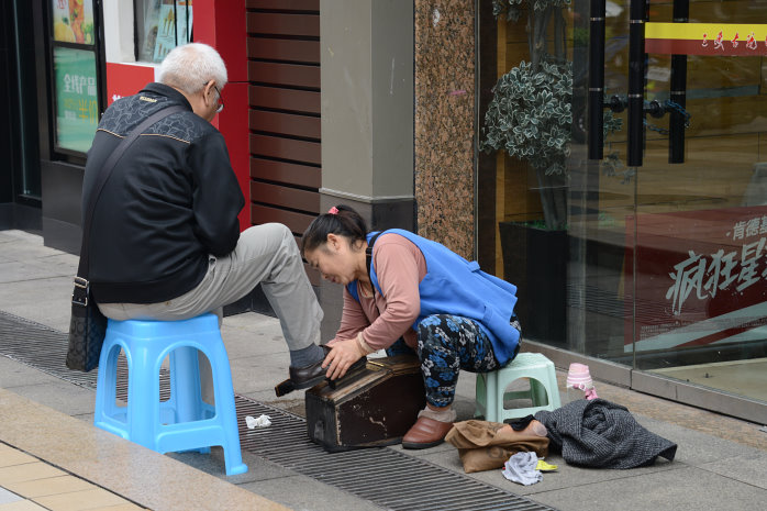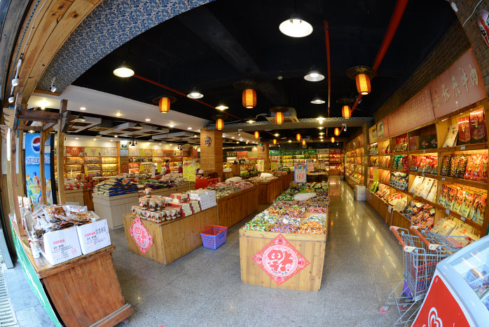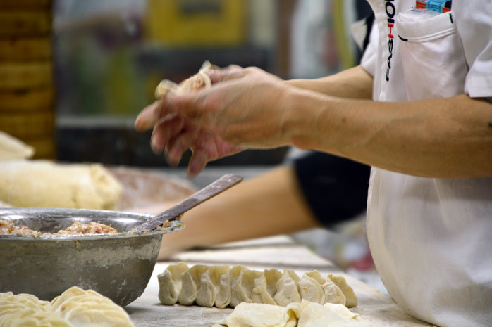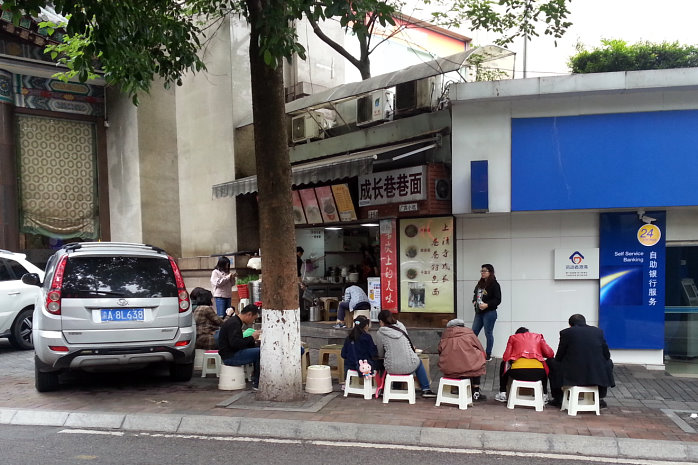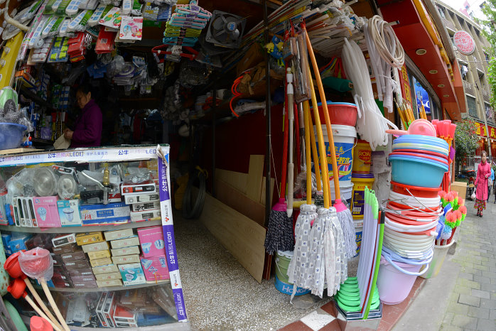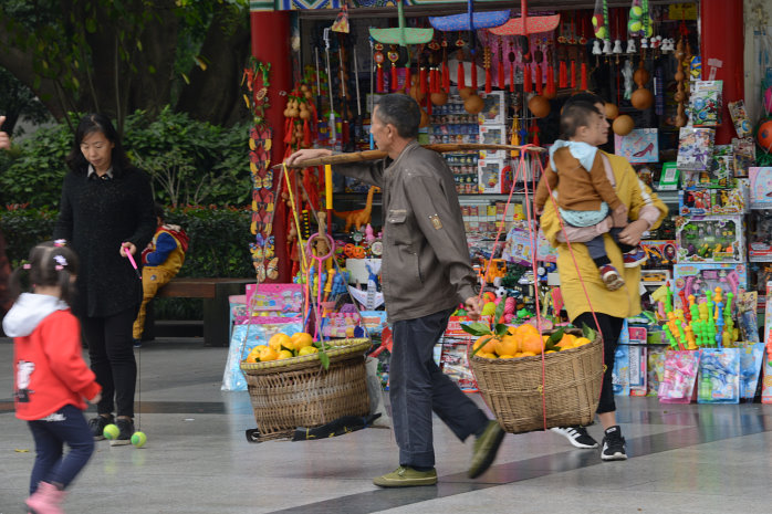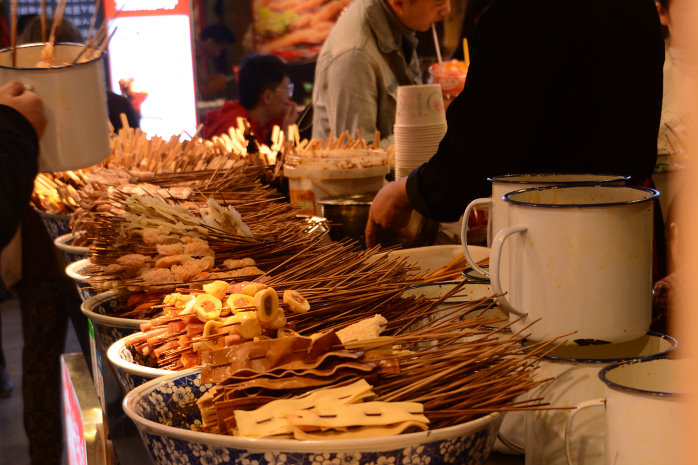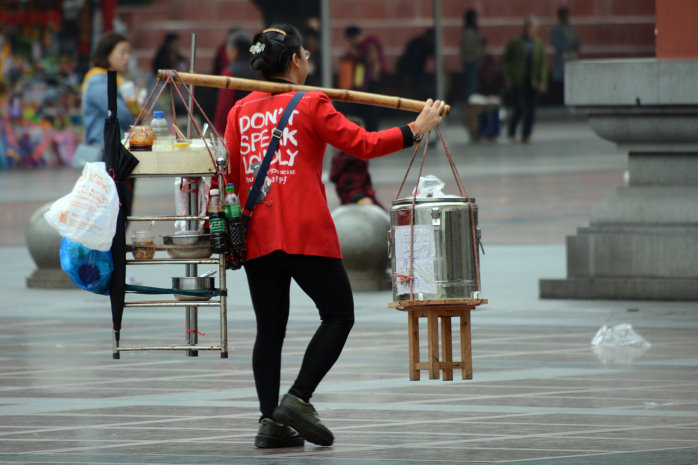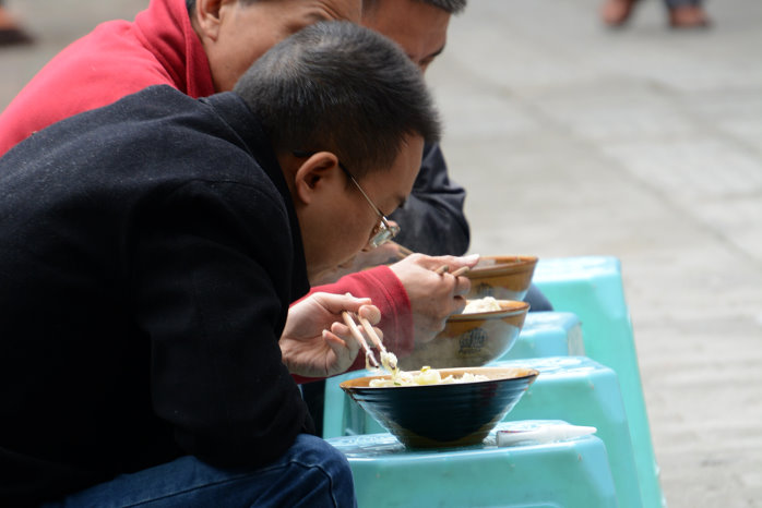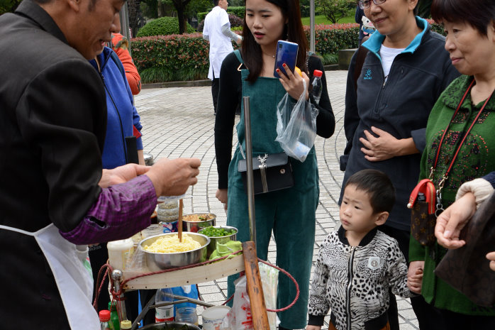 Wir laufen eine Strasse mit vielen Geschäften hoch. Die Chinesen beäugen uns genauso wie wir sie. Es ist gerade Mittag und viele kaufen sich in einer der unzähligen Suppenküchen etwas zu essen. Die Küchen sind offen, extrem klein und die Hygiene entspricht nicht ganz unserem Standard. Die Kunden kauern am Strassenrand auf niedrigen Plastikhockern und schlürfen ihr Essen. Daneben rotzt ein Anderer lautstark auf die Strasse. Bääh. Eklig. Hier leider ganz normal. Interessant ist es hier schon und wir könnten noch länger bleiben. Wir kaufen uns an einer Bäckerei 2 Teilchen ohne zu wissen was es ist. Das eine ist ganz gut, das andere – naja.