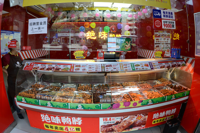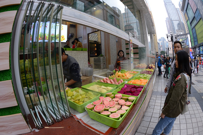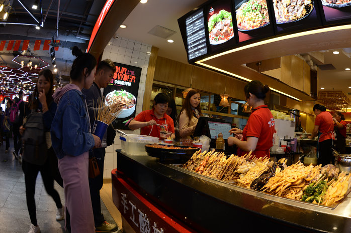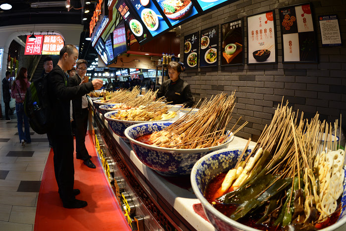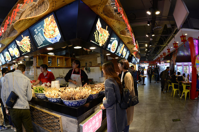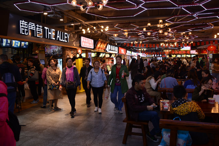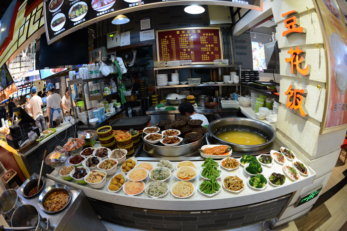 Weiter geht es mit dem Linienbus zum Shopping-Stadtteil. Wieder bekommen wir Freizeit, denn wir können erst um 6 auf das Schiff auf den Yangtze. Die Einkaufshauptstrasse ist eigentlich recht langweilig. Sie sieht aus wie in allen großen Städten. Die Seitenstrassen haben es aber in sich. Riesige Hallen mit verschiedenen kleinen Restaurants. Überall wird gegessen und die Köche plärren ihr Angebot teils über Lautsprecher über die Köpfe tausender Kunden. Man kann sich das nicht vorstellen. Das muss man erlebt haben. Wir sind Stunden nur am Staunen. Das ist zwar echt anstrengend, aber irgendwie auch schön. Vielleicht können die Bilder es ein bisschen wiedergeben.