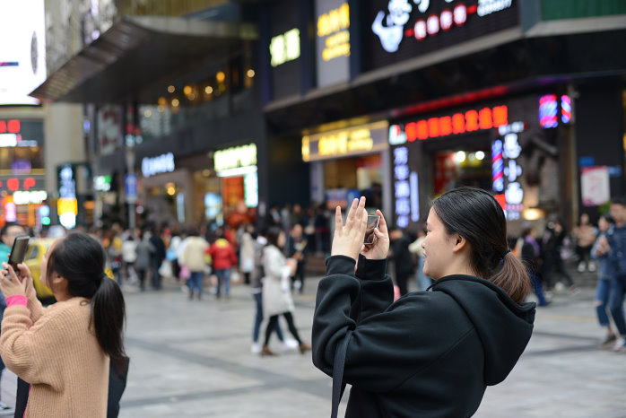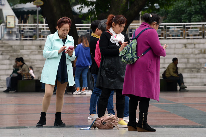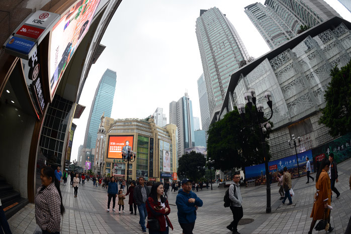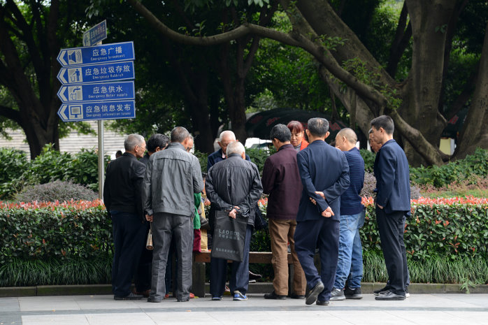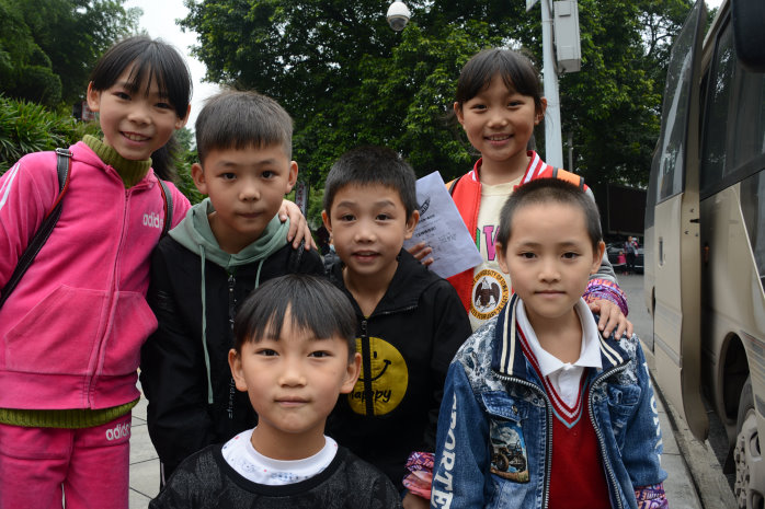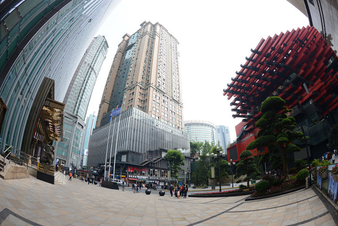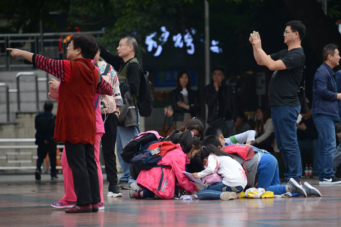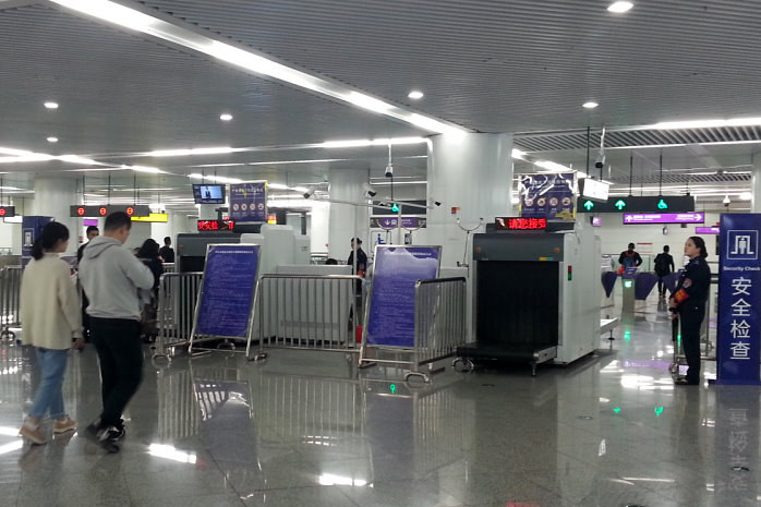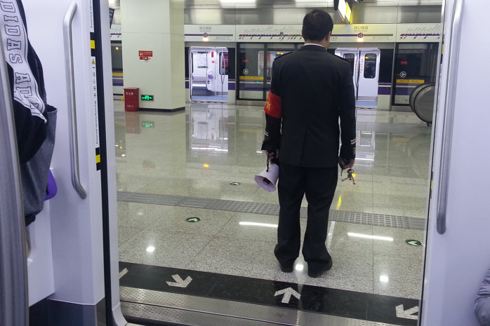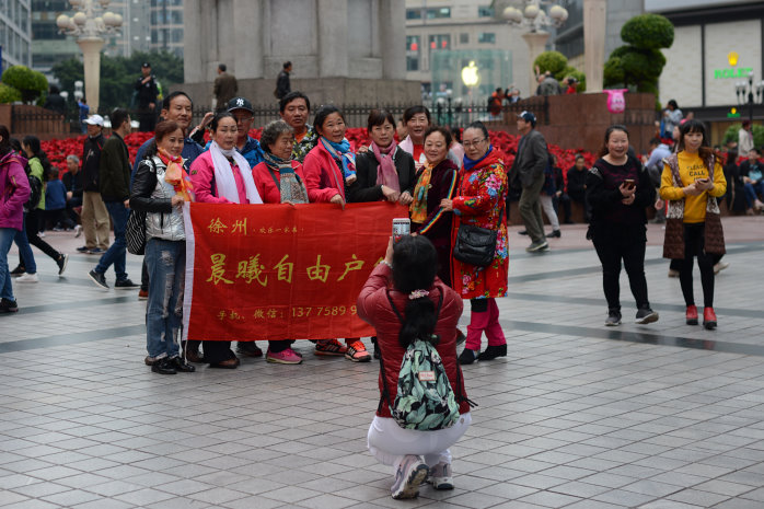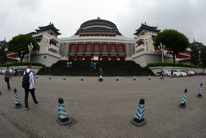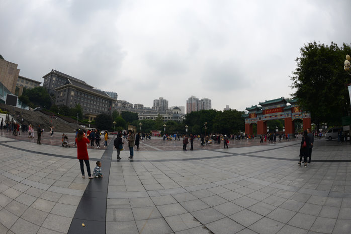 In Chongqing, nach nur 60 Minuten Flug, laden wir unser Gepäck in einen Bus. Wir selbst steigen in die U-Bahn stadteinwärts. Nach den vielen Kontrollen am Flughafen dachten wir dass das nun ein Ende finden würde. Weit gefehlt. Selbst in der U-Bahn wird man gecheckt! Nach 6 Stationen steigen wir aus. Danach bringen uns 5 sehr lange Rolltreppen ans Tageslicht. Dort steigen wir in den Linienbus 421. An der "Großen Volkshalle" steigen wir aus und können uns endlich etwas bewegen.