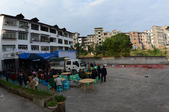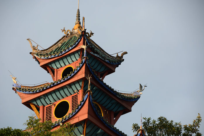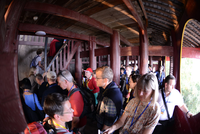 Gegen 16:30, der Puls ist so langsam wieder im grünen Bereich, legen wir in Shi Bao Zhen an. Dort gehen alle von Bord und besuchen eine Pagode. Da diese nicht weit ist gehen die verschiedenen Reisegruppen grüppchenweise von Bord. Eigentlich keine schlechte Idee, nur kumuliert es doch an sehenswerten Stellen. Die chinesischen Gruppen haben Lautsprecher – alle anderen, d.h. genau zwei, mit uns, nicht! Wir laufen durch ein Dorf zur Pagode. Auf einem Platz sitzen viele Menschen. Sie sind laut, Kracher werden angezündet - es ist eine Trauergemeinde!