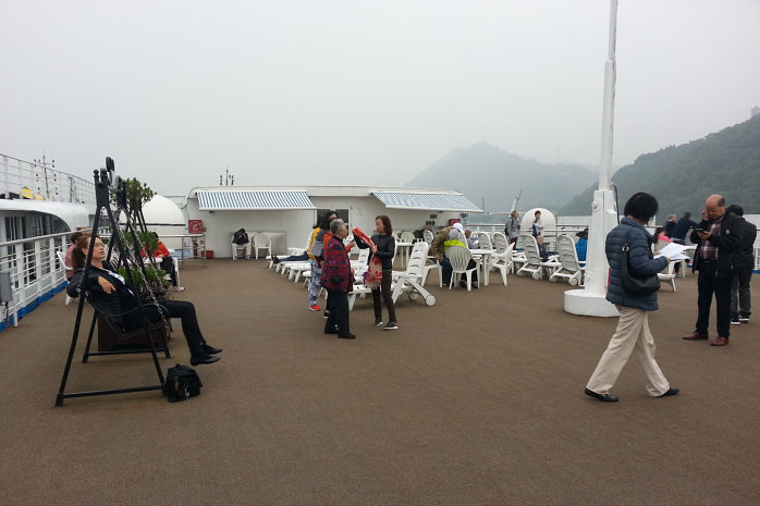 Auch hier ist der Tagesablauf streng getaktet. In der Kabine liegt hierzu ein Infoblatt. Tai Chi, Tanzen, Infofilme, Sicherheitsunterweisung, von wann bis wann gibt es Frühstück, Mittagessen, Abendessen usw. Irgendwie muss es dauernd Animation geben. Wir wollen es etwas langsamer angehen. Nach der Hektik gestern wollen wir mal Karten schreiben und uns durch die Gegend gondeln lassen. Leider ist es sehr smoggy. So hieß das heute Morgen bei der Lautsprecherdurchsage. Das ist echt schade, denn so sieht man von der Landschaft fast nichts. Vielleicht wird es ja noch besser.