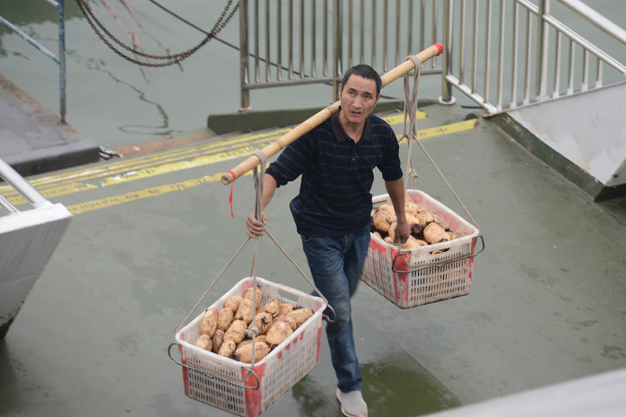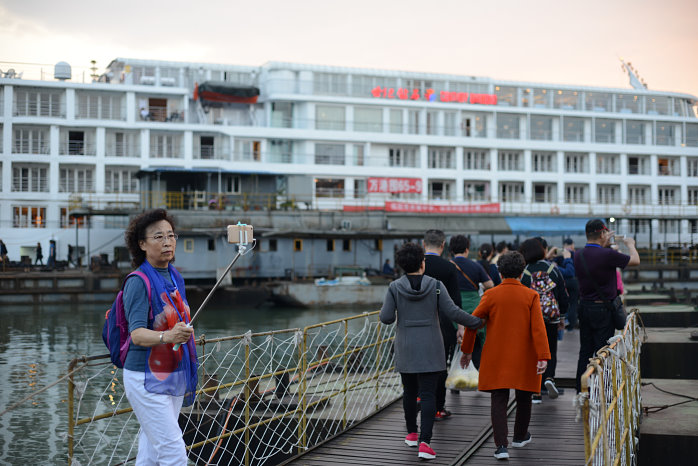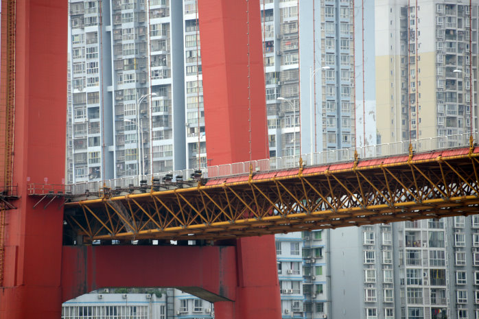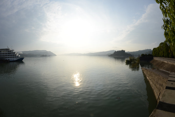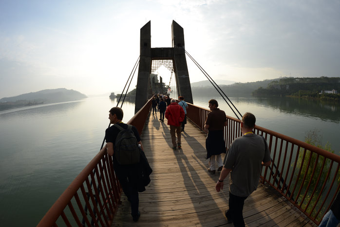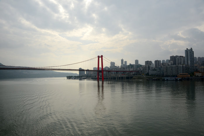 Die Zeit nach dem Mittagessen vertrödeln wir auf dem Aussichtsdeck und auf unserem Balkon. Vorbei geht es an Zhong Xian. Wahrscheinlich eine Kleinstadt mit wenigen Millionen Einwohnern. Aber gerade hier kommt die Sonne etwas heraus und man kann mal ein paar Fotots machen. Eine Brücke, die aussieht wie die Golden Gate Bridge, überspannt den Yangtze. Auch das lässt sich schön fotografieren.