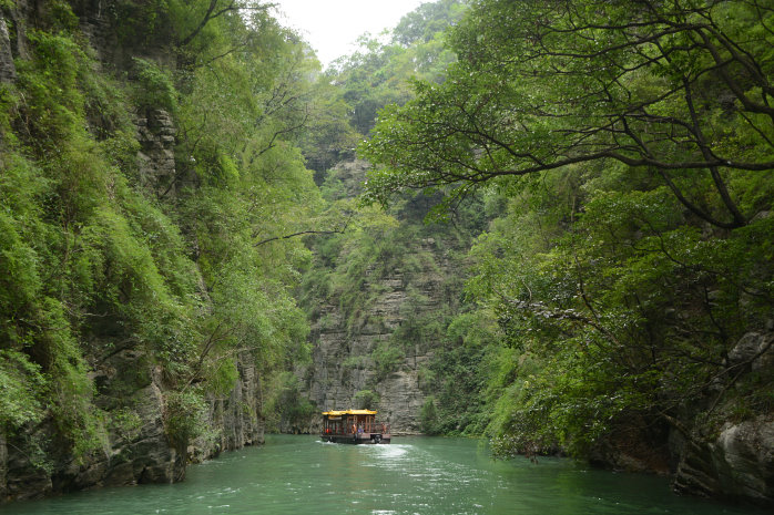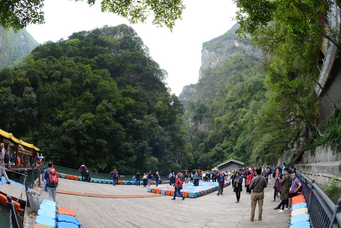 Am Ende dieser Schlucht legen wir an und steigen in kleine Boote um. Dieser Flecken wird von den Chinesen auch die Loreley Chinas genannt, weil ein hoher Felsen ins Wasser stürzt und ein wenig an die Loreley erinnert.