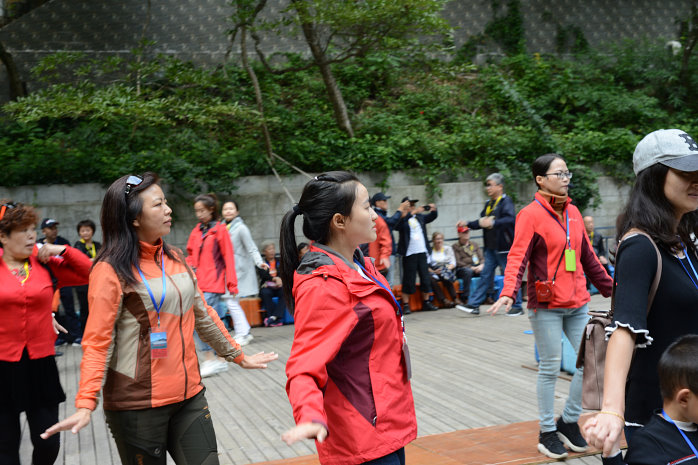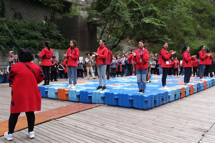 Apropo Ruhe. Am Ende der Schlucht steigen wir auf eine schwimmende Insel aus Plastik. Dort erwartet uns eine besondere Show. Alle Fremdenführerinnen stehen auf einem Podest und singen über ihre Verstärkermikrofone Lieder; begleitet von einer riesigen Box aus der die Musik dazu kommt. Die Umstehenden Gäste werden animiert einen Refrain mitzusingen. Danach gibt es noch eine Polonaise für alle rund um das Podest. Da ist man in einer traumhaften Landschaft, würde diese vielleicht geniessen wollen und dann das! Das hätten sie sich schenken können, aber vielleicht erwarten das die chinesischen Touris?