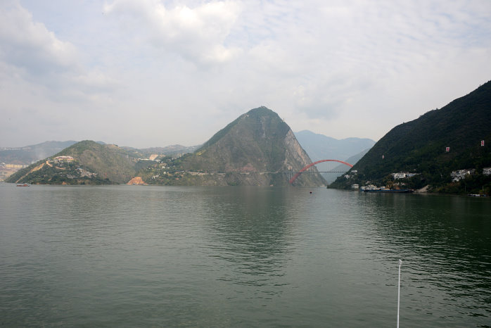 Viel zu schnell geht es weiter, aber die Einfahrt in die erste Schlucht, die Qutang-Schlucht ist auch nicht schlecht. Wir sind rechtzeitig auf dem vorderen Deck und sichern uns einen Platz an der Reling. Wie sich herausstellt vollkommen umsonst. Alle Chinesen scheinen beim Mittagessen zu sein, denn hier sind gerade mal eine Handvoll. Das Wetter spielt auch mit, auch wenn es klarer sein könnte. Bei der Einfahrt in die Schlucht bläst uns der Wind heftig entgegen. Die Schlucht wirkt wie eine Düse durch die der Wind muss.