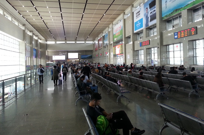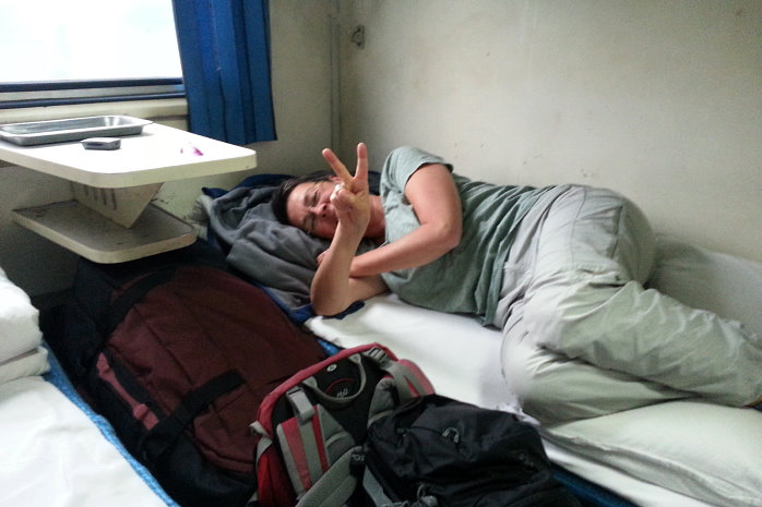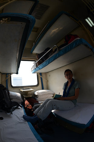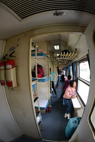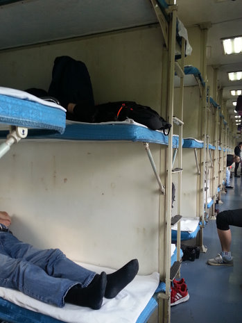 Der Zug hat 20 Minuten Verspätung. Es ist halt kein Hochgeschwindigkeitszug. Endlich geht es los und das übliche Gedränge beginnt. Wir haben Plätze im Schlafwagen! Die Fahrt dauert zwar 5 Stunden, aber Schlafwagen hätte es nicht gebraucht. Die einzelnen Kojen habe keine Türen und es sind 3 Betten übereinander. Wir haben jeder eine Pritsche ganz unten. Die Luft ist ziemlich stickig und man kann kein Fenster öffnen. Mal was anderes als der Highspeedzug!