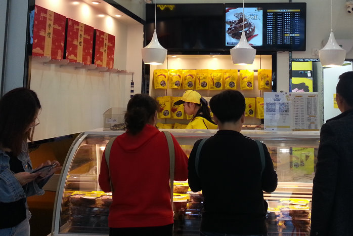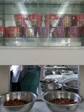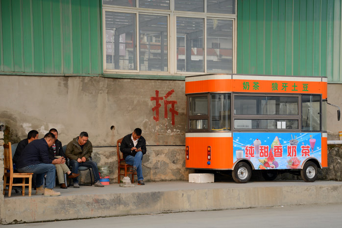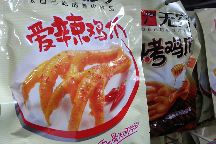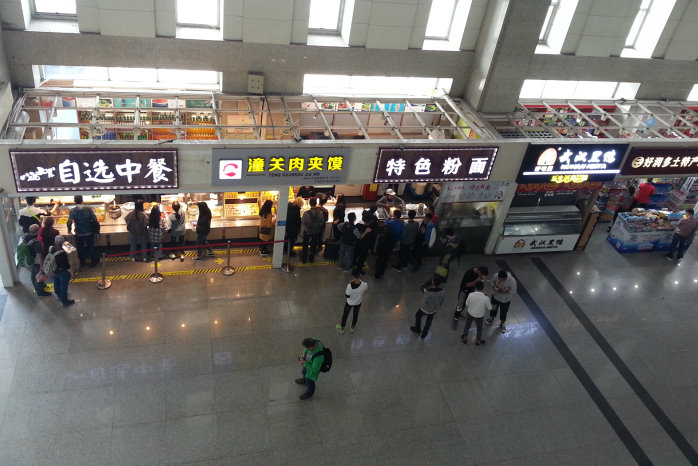 Mit den Chinesen fahren wir noch ein kurzes Stück und steigen dann in einen anderen Bus – diesmal alleine. Wir fahren bis Yichang zum Bahnhof. Wieder eine Sicherheitskontrolle und dann ... keinen Kaffee. Wir haben etwa 1 Stunde Zeit und schlendern rum. An den Ständen steht alles nur auf chinesisch. Mir fallen kleine Päckchen auf, die es an jedem Stand gibt. Irgendwas mit Fisch – aber was? Ich kaufe mal eins. Probieren werde ich es später.