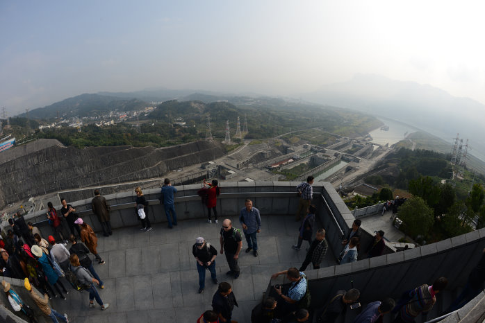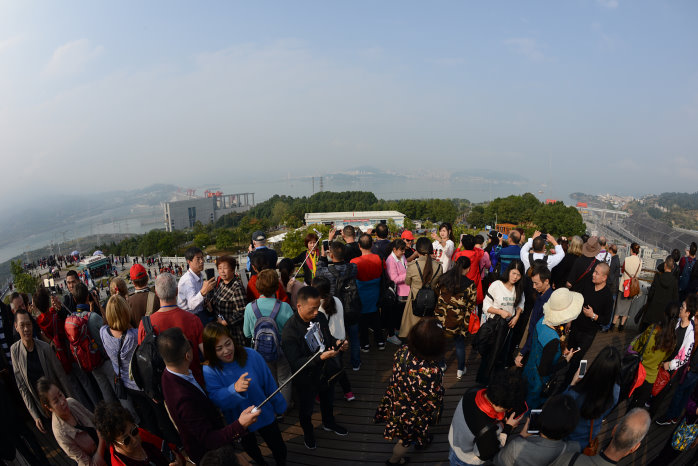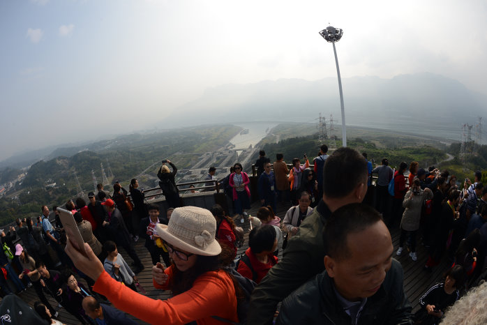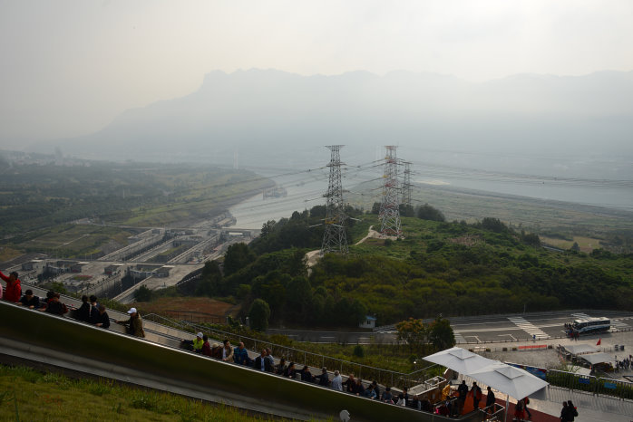 Nach der obligatorischen Sicherheitskontrolle führen uns mehrere Freiluftrolltreppen auf die Aussichtsterrasse. Laufen schadet offensichtlich der Gesundheit oder ist unvornehm. Oben angekommen ist der Teufel los. Das Volk der Selbstdarsteller braucht immer den besten Platz zum fotografieren, auch wenn auf dem Foto ausser Gesicht nix zu sehen ist. Der Staudamm ist schon gigantisch. Das 5-stufige Schiffshebewerk für Schiffe bis 3000 Tonnen braucht etwa 40 Minuten für eine Stufe. Der Damm hat so viel Beton verbraucht wie in eine Röhre von einem Meter Durchmesser einmal um den Äquator passt. Das alles scheint unwichtig in Anbetracht eines Selfies.
