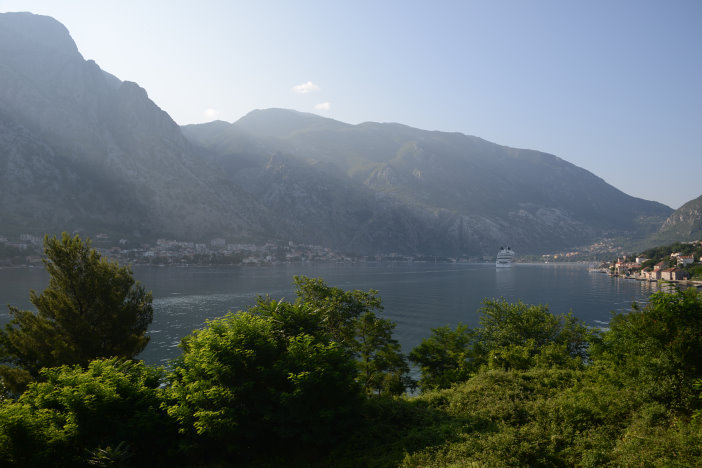 Um 6 Uhr weckt uns die Kirche am gegenüberliegenden Ufer mit Gebimmel. Das ignorieren wir mal. Ne Stunde später schauen wir dann doch vom Balkon. Die „Seabourne Odyssee“ fährt in den Hafen von Kotor ein. Ich schaue im Internet nach und erfahre, dass sie 450 Passagiere hat. Kotor hat 6000 Einwohner!