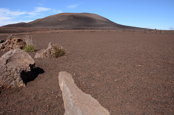 Zuerst müssen wir in die 100m tieferliegende Caldera absteigen und das über unegale Treppenstufen an einer senkrecht abfallenden Steilwand. Wir freuen uns jetzt schon auf den Rückweg. Die Sonne ist noch ganz flach und kommt gerade so in den Krater rein. Man sieht eine riesige Ebene mit einem kleineren Krater darin. Hier lässt es sich dann ganz gut laufen. Es gibt keine Wege, aber die Lavafelder sind gut zu begehen.Die komplette Wanderung ist mit auf die Steine gemalten weißen Strichen markiert. Das ist auch gut so, sonst würde man an unsicheren Stellen laufen und im Nebel total orientierungslos sein. Hie und da gibt es tatsächlich Pflanzen die es geschafft haben sich ihren Lebensraum zu erobern. Die ersten Fotos entstehen von skurilen Lavaverwerfungen und grünen Pflanzen an schwarzer Lava. Phantastisch!