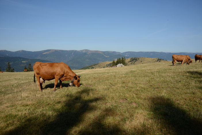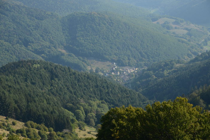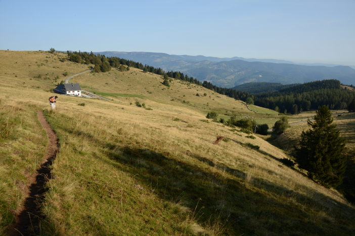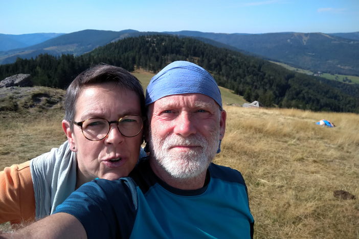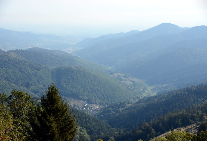 Heute sind wir alleine beim Frühstück. Bei wieder strahlend blauem Himmel fahren wir zur Ferme Auberge Kahlenwasen. Es ist um kurz nach 9:00 auf über 1000m schon sehr warm. Wir steigen ein kurzes Stück über die Wiesen bergauf, danach lange hinab zum Col de Boenlesgrab. Das müssen wir natürlich auch wieder hoch. Am Anfang durch den Wald, sehr steil, dann in Serpentinen auf schmalem Weg. Als wir aus dem Wald kommen sehen wir im Süden den Grand Ballon. Auch die Spitzen des Schwarzwaldes gucken aus dem Dunst heraus. Noch ein weiteres Stück auf dem kahlen Südhang bergauf und wir sind auf dem Gipfel des Petit Ballon auf 1272m. Eine herrliche Aussicht und die Hänge auf denen wir gestern gelaufen sind erkennt man auch ganz gut. Wieder unten in der Ferme Auberge gibt es Tarte aux Myrtilles, Münsterkäse, Café und Milch. Bei 30° in der Sonne auf 1055m Mitte September! Dann fahren wir über Wasserbourg zurück um in Soultzbach-les-Bains den Rundgang durch das mittelalterliche Dörfchen zu machen. Einige Zeit vor dem Abendessen fahren wir nach Munster um die Gassen abzuklappern. Nach einem Panaché in einer Bar gehen wir ins „Stewla“ und es gibt Bibelakas und Lewerknepfla.
