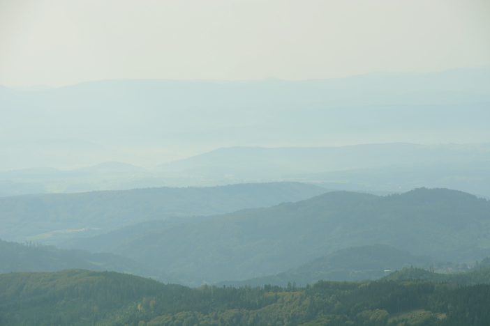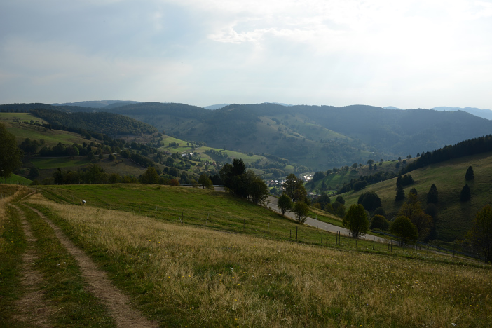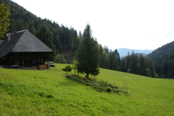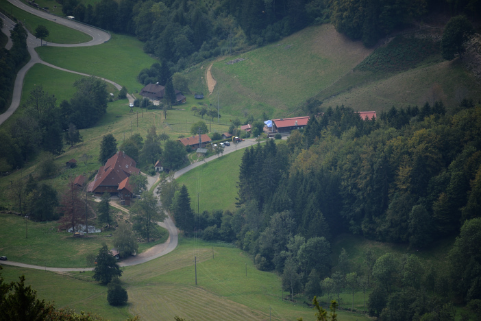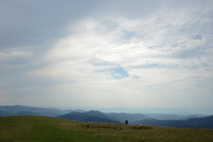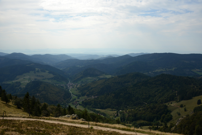 Wir haben gut geschlafen, es ist absolut ruhig und dunkel, sogar die Matratze taugt etwas. Nach dem Frühstück mit leckerem Roggenbrot, Käse und Ei fahren wir zum Wiedener Eck, was eigentlich nicht weit ist, aber die Strecke ist ziemlich kurvig. Heute sind ein paar Schlierenwolken zu sehen und es ist schon morgens 23° warm. Am Wiedener Eck starten wir den Belchensteig, zuerst ein Stück bergauf, dann hinunter in ein Wiesental, vorbei an riesigen Schwarzwaldhöfen bis zur Talstation der Belchenbahn. Hier geht es 2km steil bergauf und wir sind gut am Schwitzen. Oben gibt es am Belchenhaus (Webcam) etwas zu trinken und einen Rundumblick – allerdings im Dunst. Wir freuen uns trotzdem. Der Abstieg geht in Serpentinen einen Steilhang hinunter. Diesen schönen Weg sind wir damals, als wir den Westweg gewandert sind, hoch gekommen. Das letzte Stück runter durch den Wald zieht sich ein wenig.