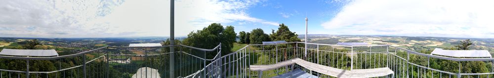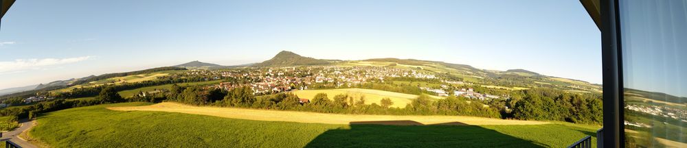 Zuerst müssen wir auf den Hohenhewen. Das sah auf dem Höhenprofil schon beachtlich aus. Die Wirklichkeit ist aber noch besser. Es geht schnurgerade im 45°-Winkel den Berg hoch! Keine Stunde unterwegs und schon klatschnass. Die Aussicht vom Turm oben ist toll. Da wäre ich gerne mal mit Fernsicht. So wie es hoch ging, geht es auch fast runter - sehr steil, aber auf etwas besseren Wegen.