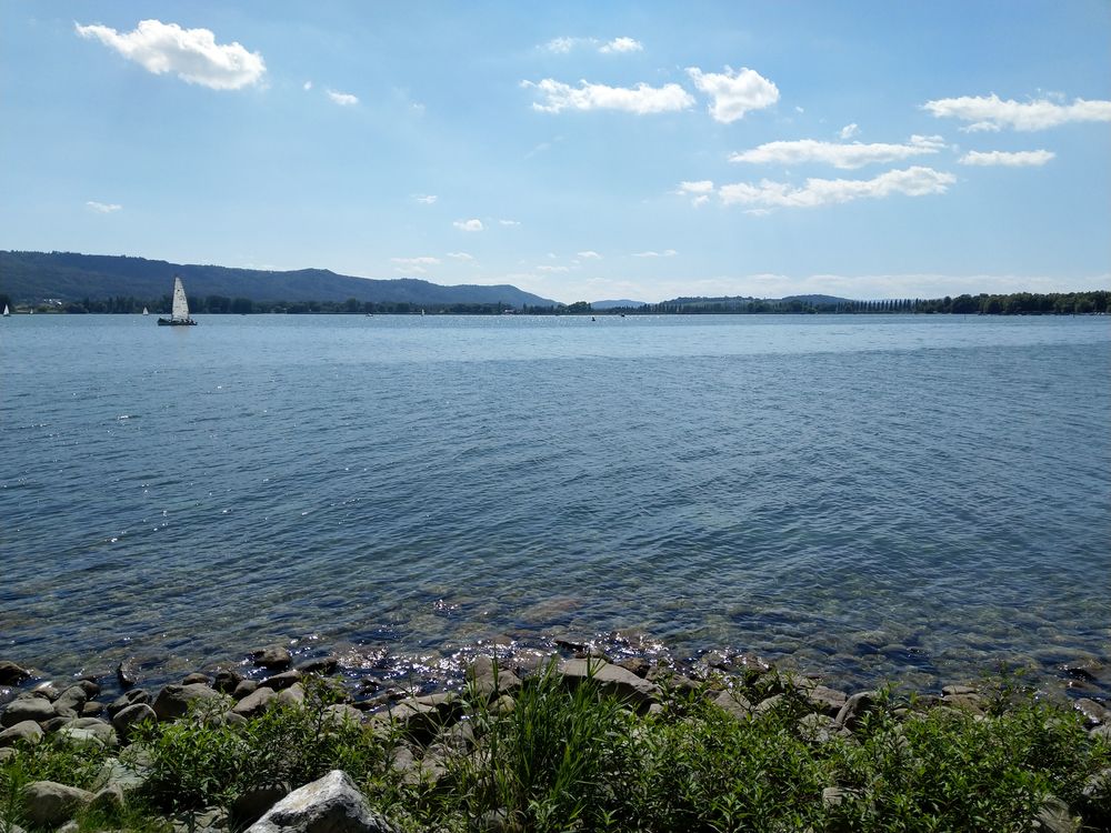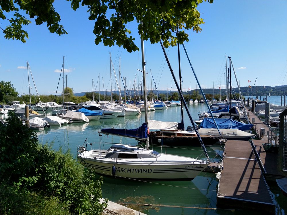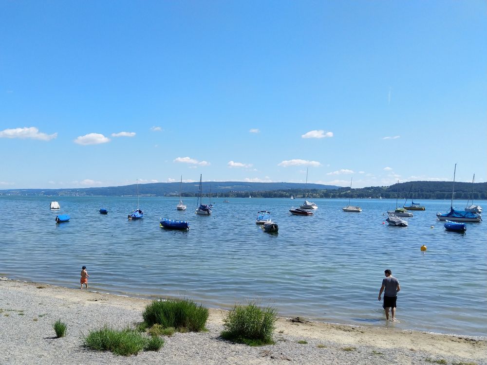 Wir schauen uns Radolfzell an, indem wir mäanderförmig die Gassen durchschlendern. Später gehen wir östlich des Bahnhofs an den See. Überall gibt es Biergärten. In einem gönnen wir uns eine Pause und eine Erfrischung. Wir flätzen uns in Liegestühlen und schauen aufs Wasser. Im Schatten ist es mit dem Wind vom See her schon fast zu kühl.