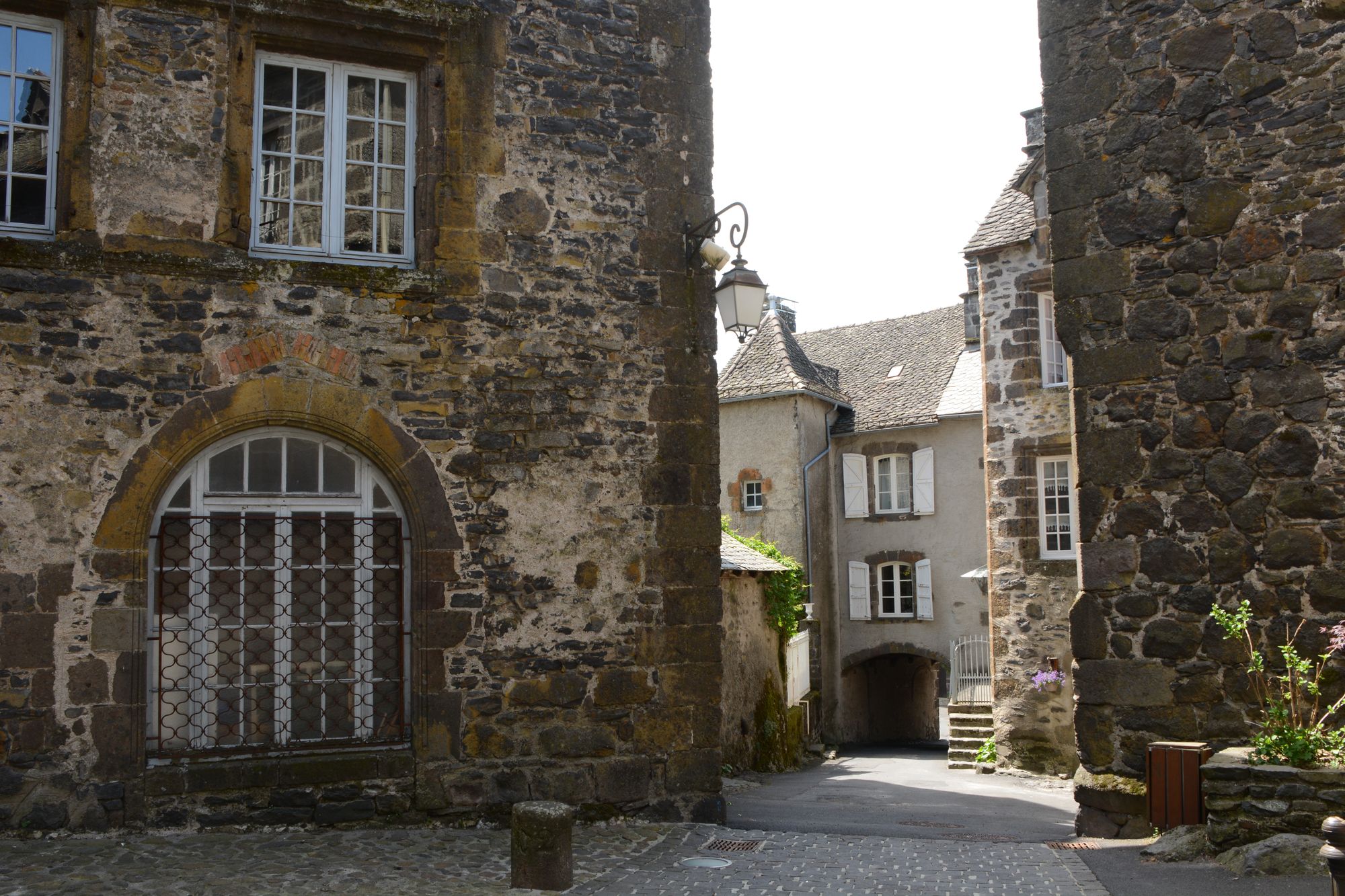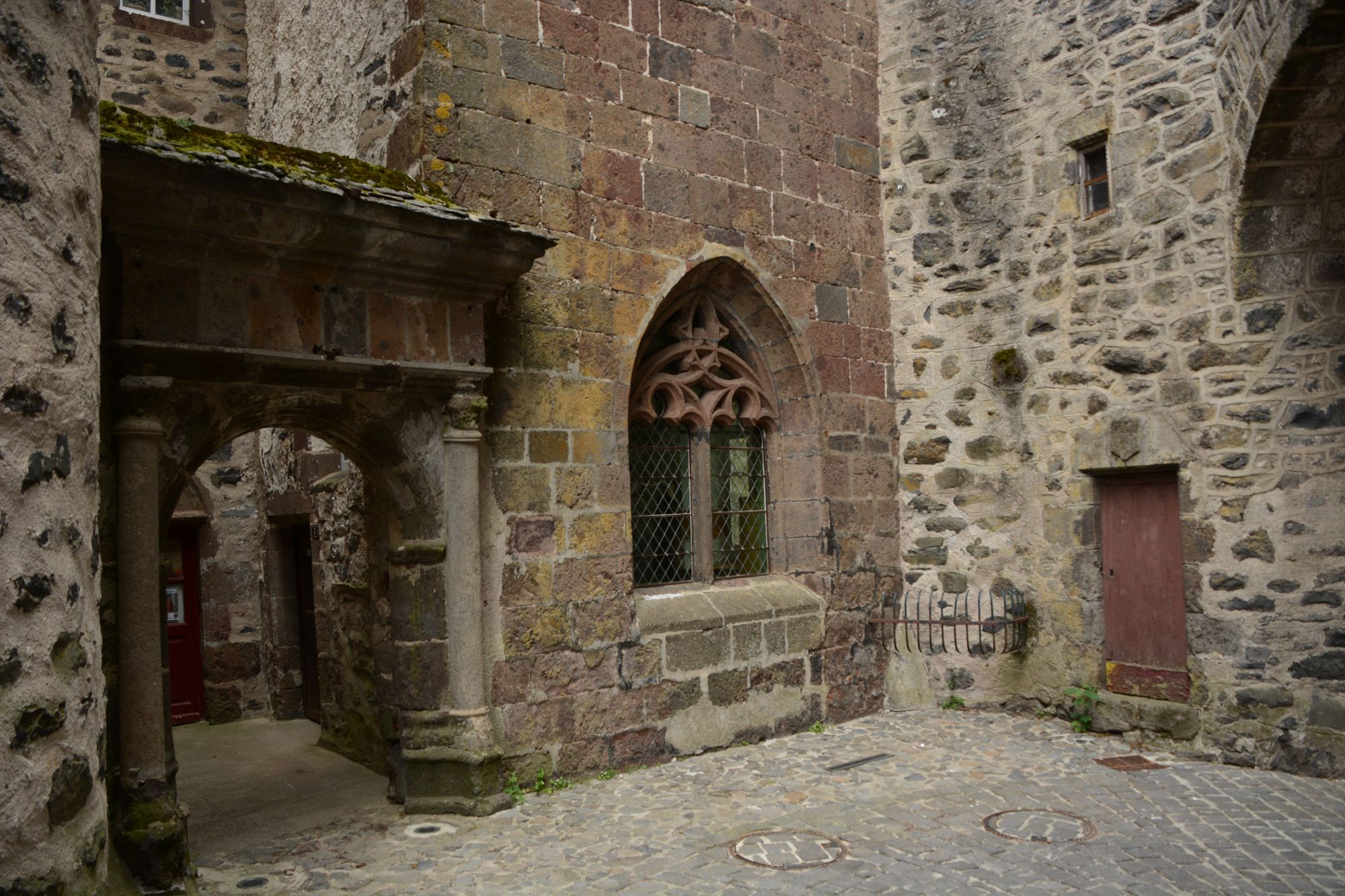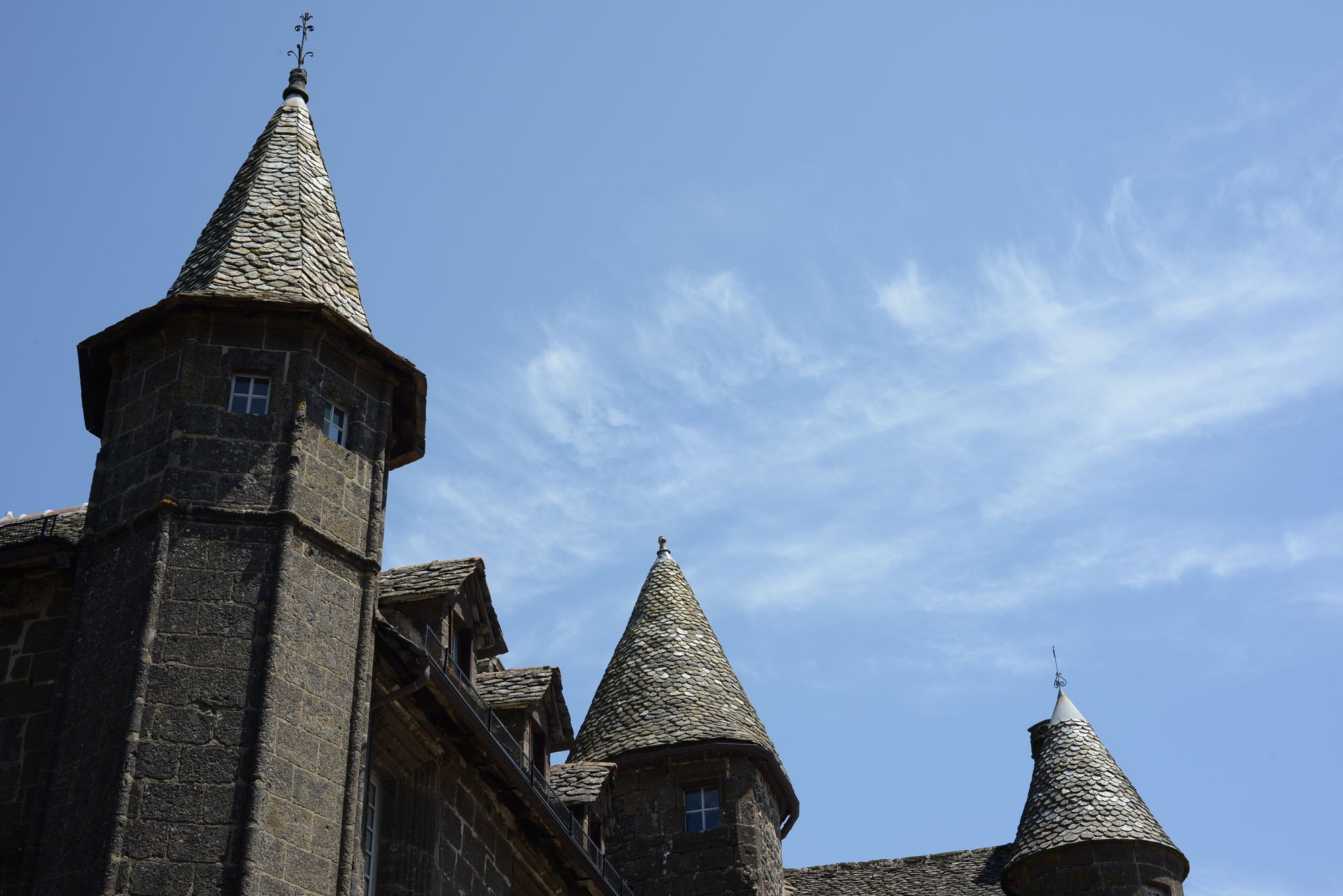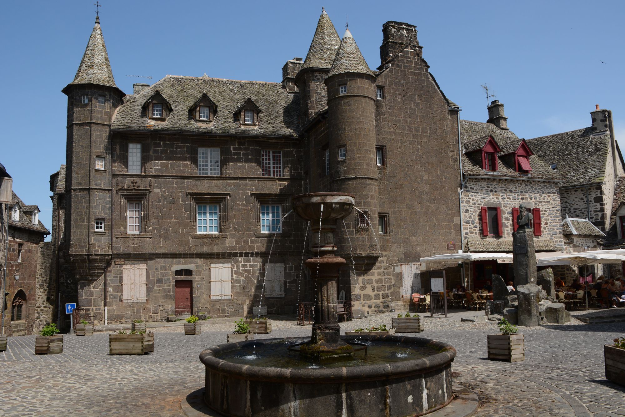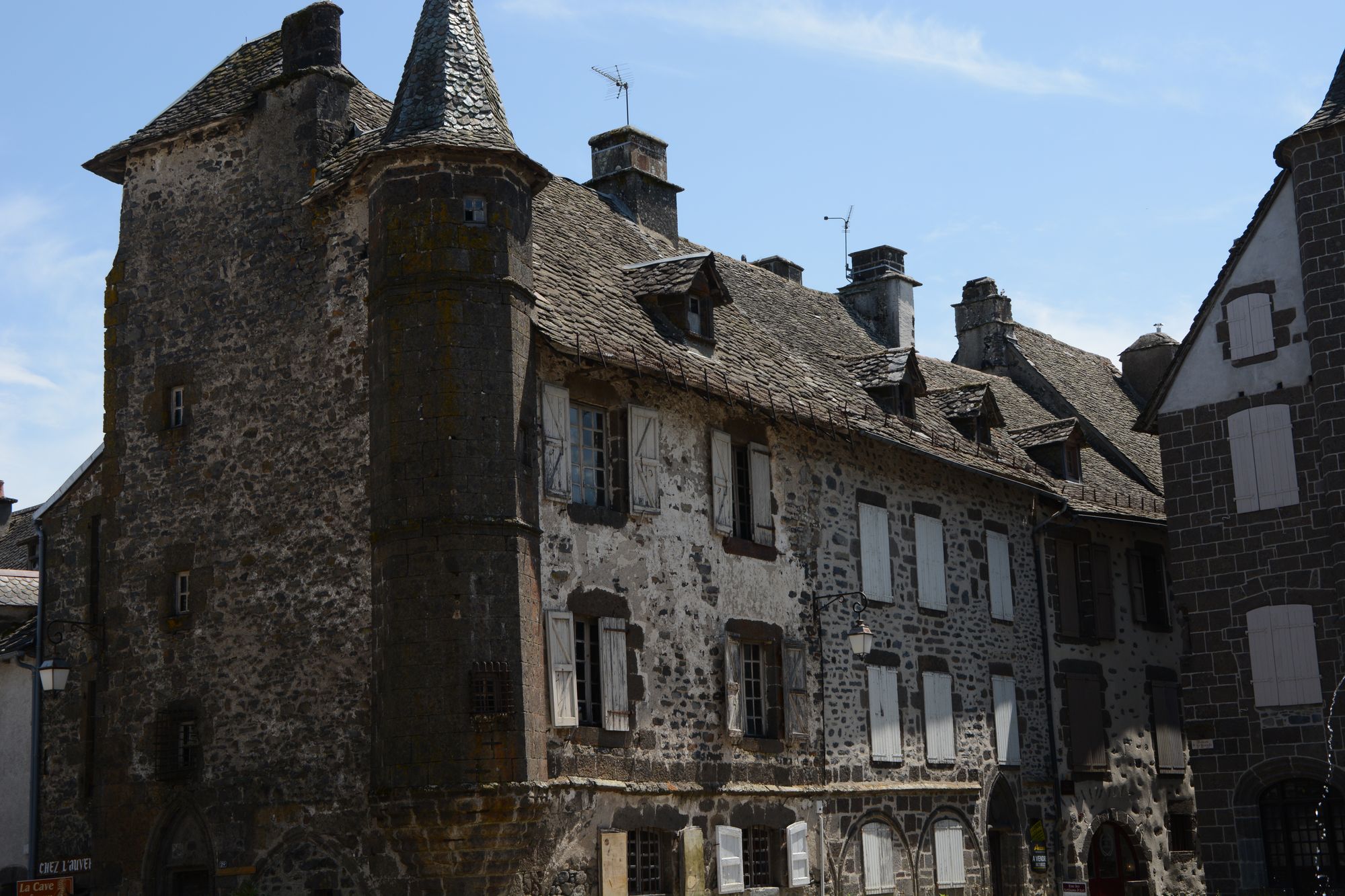 In Salers selbst sind die meisten toll restaurierten Häuser aus dem 17.Jhdt.. Viele Türmchen, eine Kirche mit einem imposanten Eingangsportal und viele massive Türeinfassungen gibt es zu bestaunen. Es gibt doch tatsächlich ein paar Tropfen Regen. Deswegen gönnen wir uns einen Café unter einem Vordach sitzend.