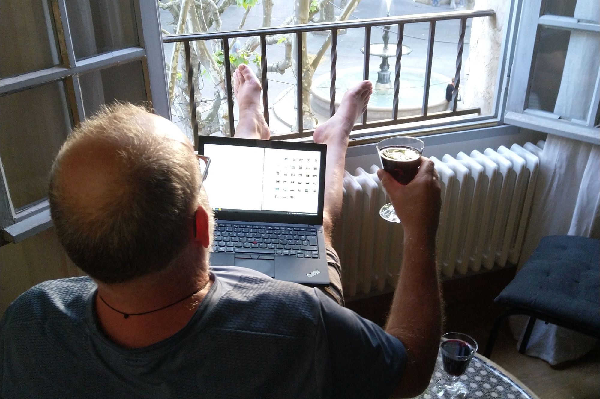 Sonntagabend und Montag ist es in Frankreich so eine Sache mit den Restaurants. Auch hier in einer Touristenhochburg muss man schauen was offen hat. Auswahl gäbe es genug. Natürlich sind ausgerechnet die, die wir uns ausgesucht hatten, geschlossen. Sur la Place gibt es aber ein Restaurant in dem Moules-Frites angeboten werden. Da fällt mir die Wahl nicht schwer. Nach dem Essen verziehen wir uns allerdings, holen uns einen Roten im "La Terroirs" und sitzen bei uns am Fenster im TV-Modus.