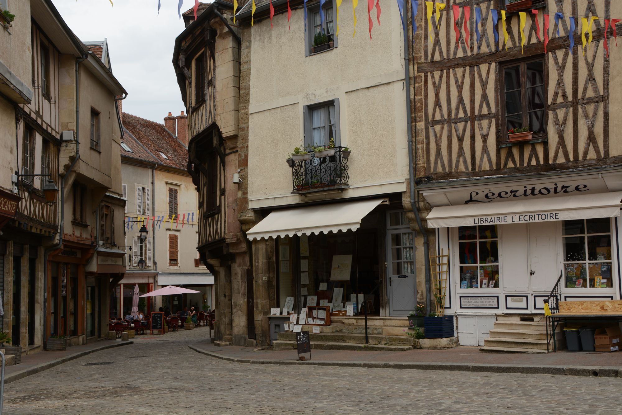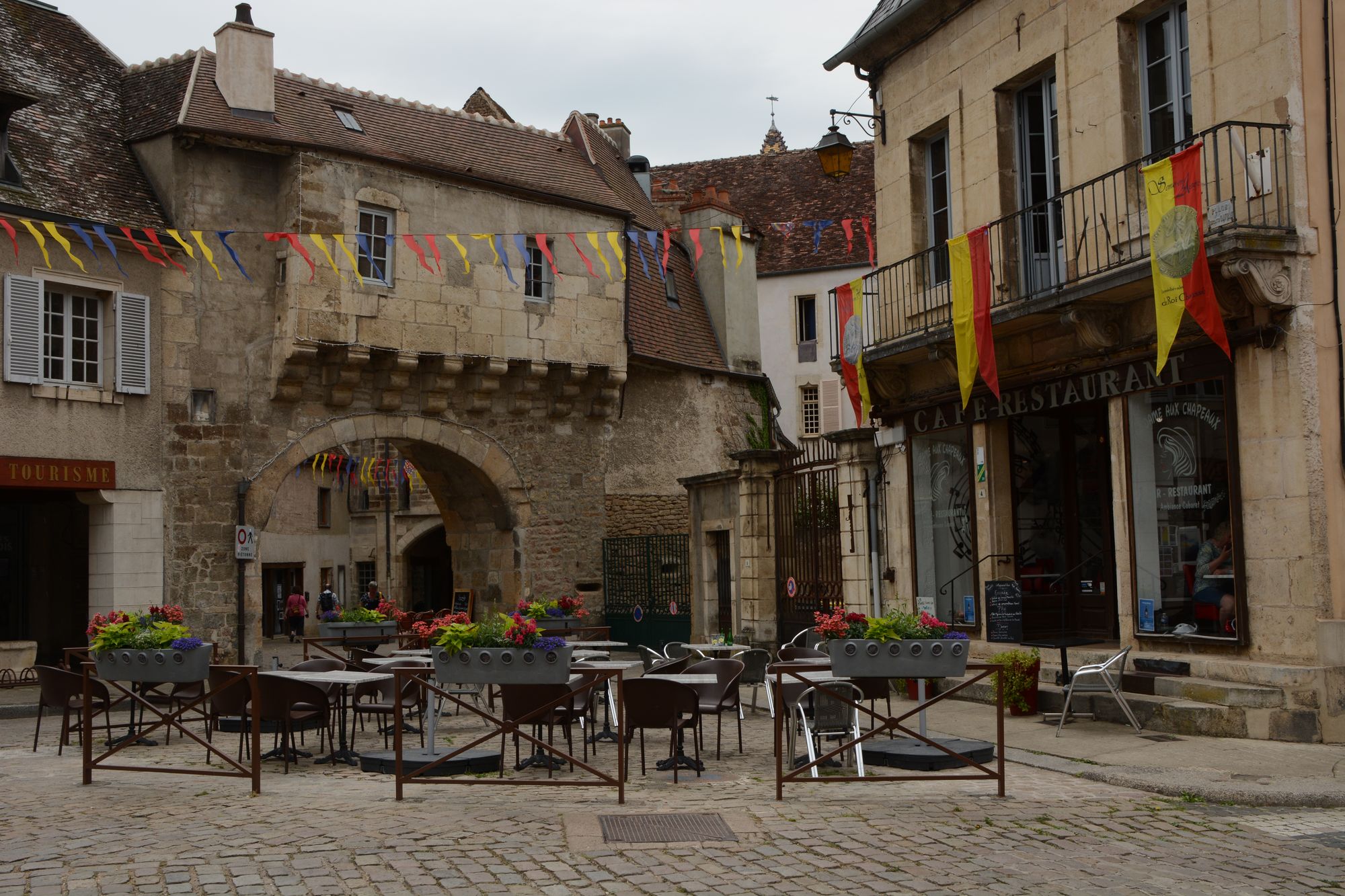 Die Fenster des Hotels sind richtig schön schalldicht und deshalb haben wir gut schlafen können. Das Frühstück nehmen wir draussen "sur la Place" zu uns. Es gibt sogar Käse, Rührei und Wurst!! Alles andere als selbstverständlich in Frankreich.