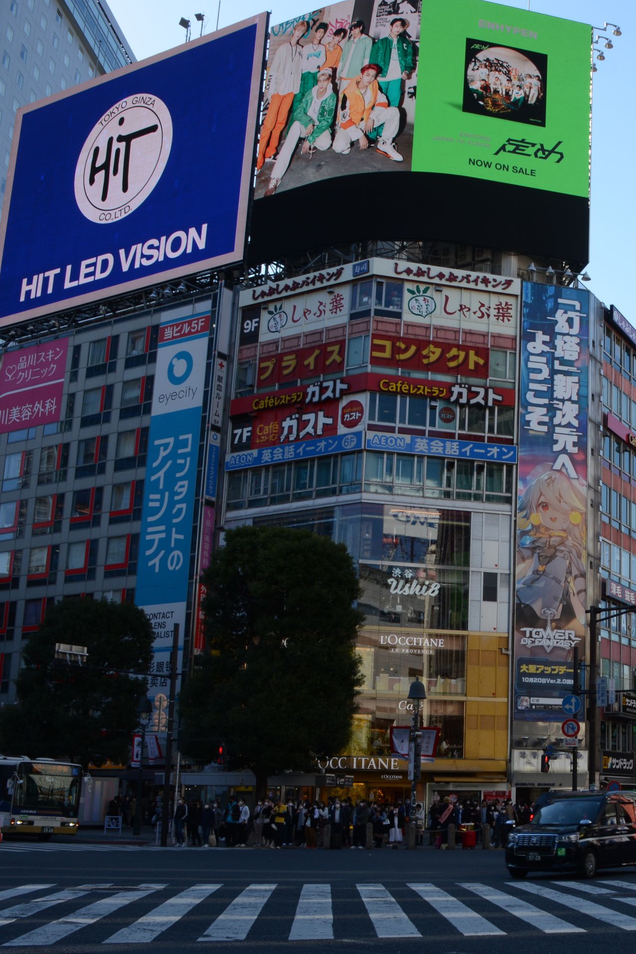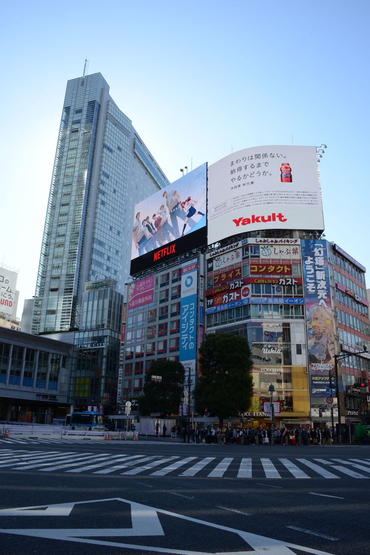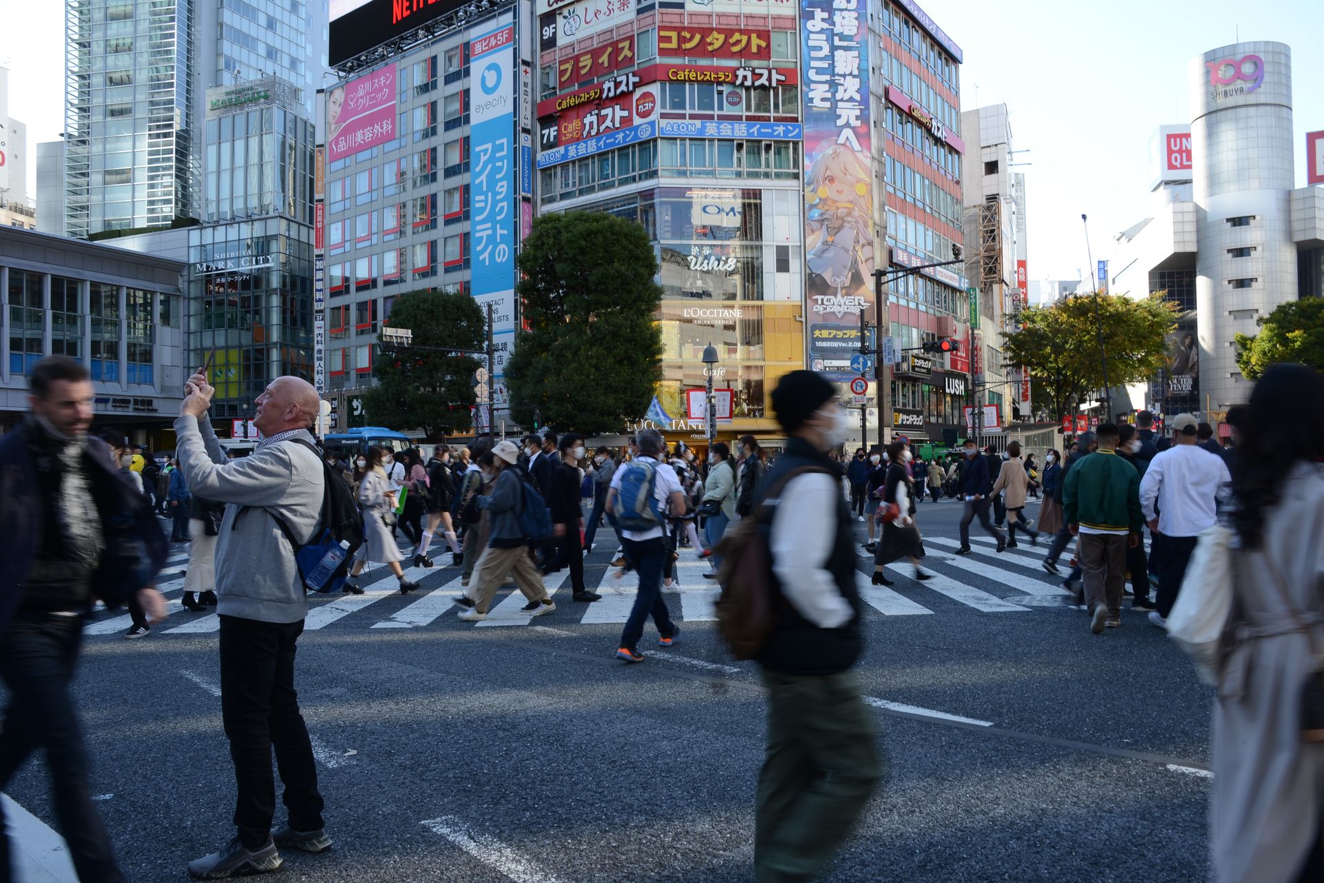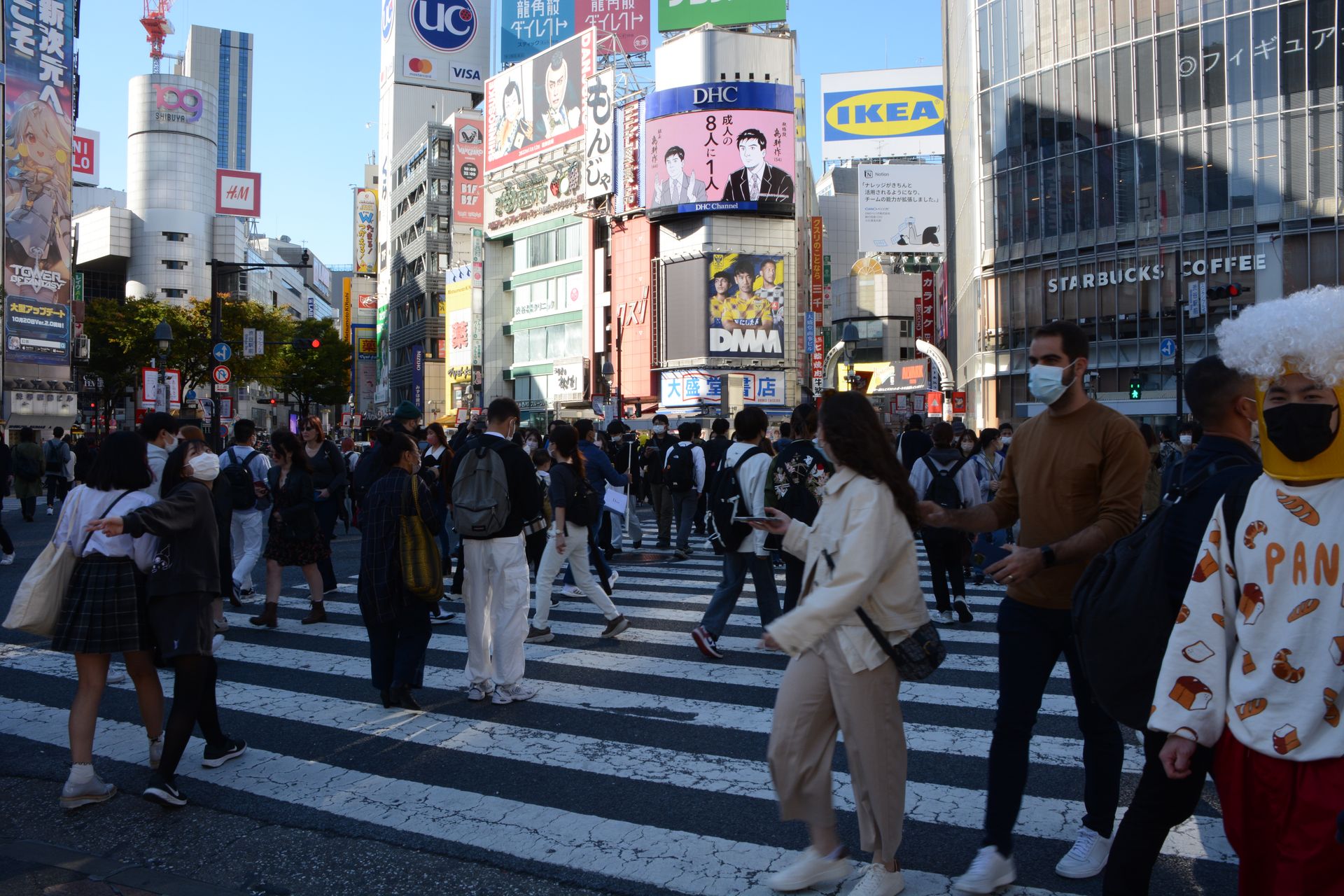 Kreuzung mit Diagonalquerung im Stadtteil Shibuja. Diese ist weltberühmt, weil dort mehrere Strassen zusammenkommen und alle Autos gleichzeitig rot haben und dadurch die Kreuzung für die Fussgänger komplett frei ist. Ein ziemliches Gewusel. Leider sind die Aussichtspunkte wegen Halloween gesperrt oder zugehängt - aus Sicherheitsgründen. Da muss ja echt was los sein!