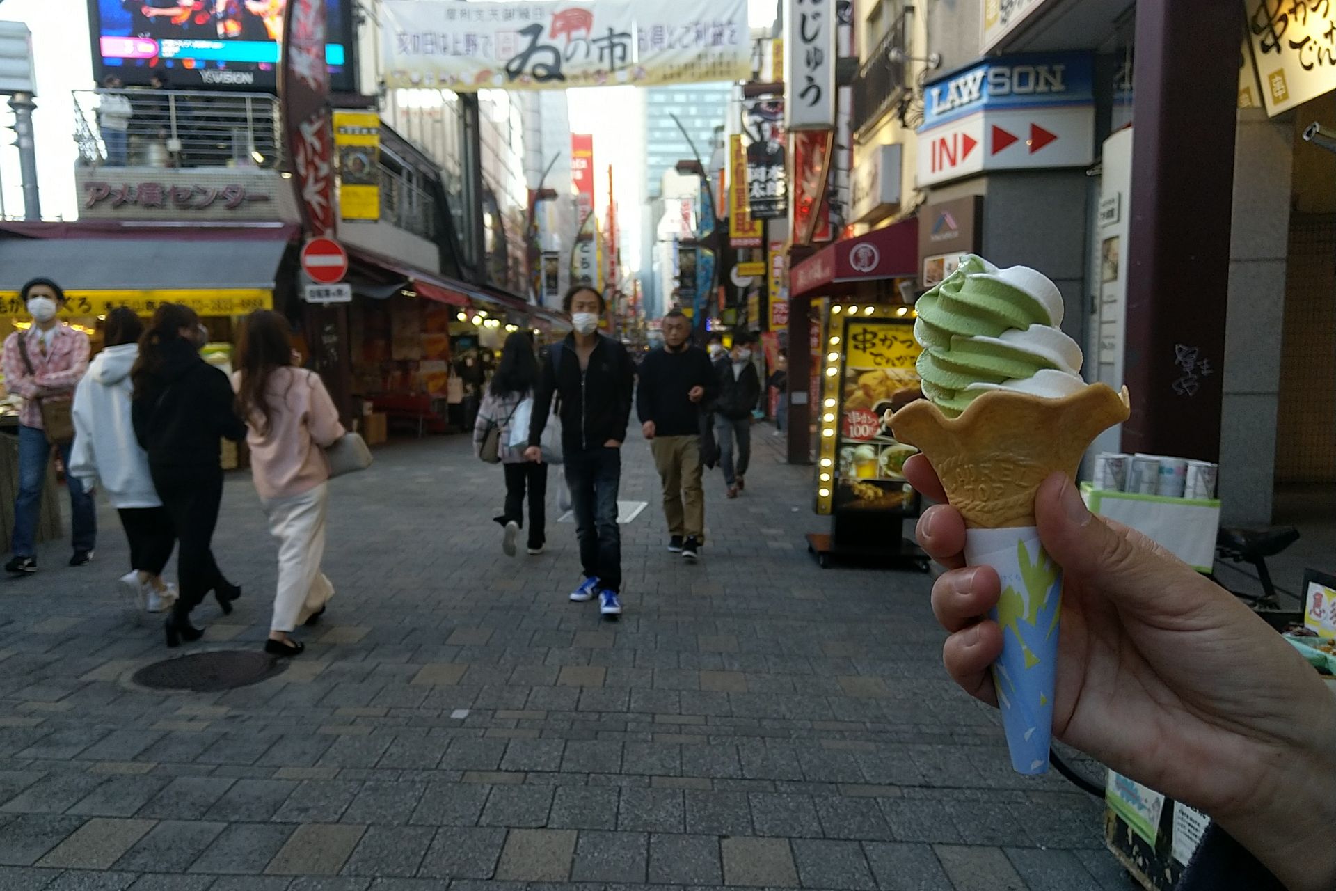 Ameya-Yokochō-Markt. Hier probieren wir ein Matcha-Eis - lecker. Allerdings haben wir hier nur wenig Zeit. Es ist wirklich etwas hektisch heute. Einfach zu vollgepackt der Tag!