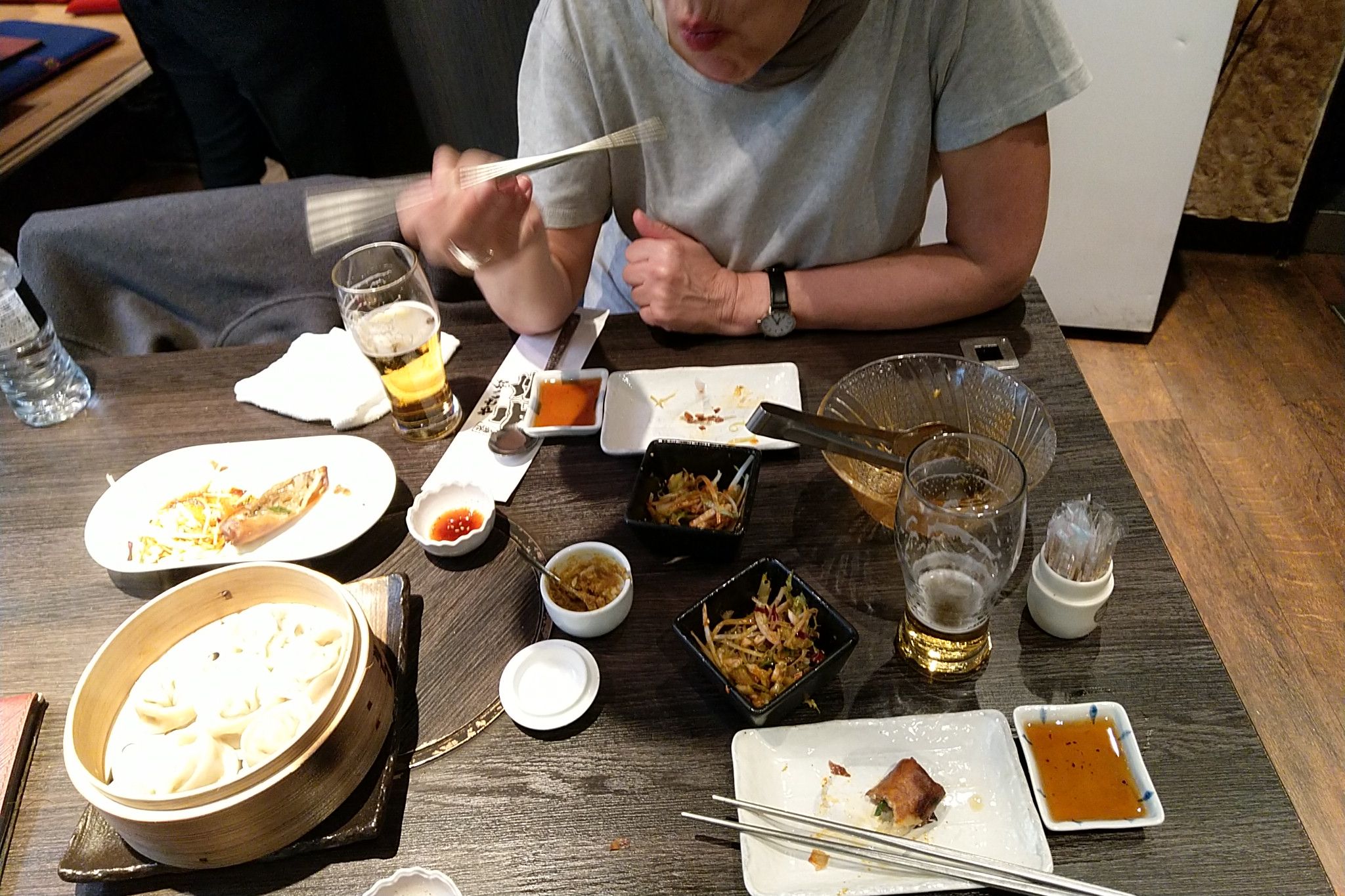 Auf der Suche nach einem Restaurant müssen wir auch hier feststellen - kein englisches Menue. Es gibt aber eins mit Zeigebildchen. Das nehmen wir. Im 2.Stock treten wir ein, es ist recht klein, und fragen nach einer englischen Karte. Schwupps ist die Bedienung verschwunden, kommt zurück und weist uns einen Tisch zu. Eine weitere Nachfrage - Nein, keine andere Karte. OK. Eine der 4 wirklich jungen Bedienungen holt das Handy raus und Tante Google übersetzt so einiges. Mit Händen und Füßen geht aber besser - bis auf spezielle Spezialworte😃. Senf zB., oder die Frage nach der Toilette geht nur mit Google-Übersetzung. Wir sind einigermaßen überrascht.