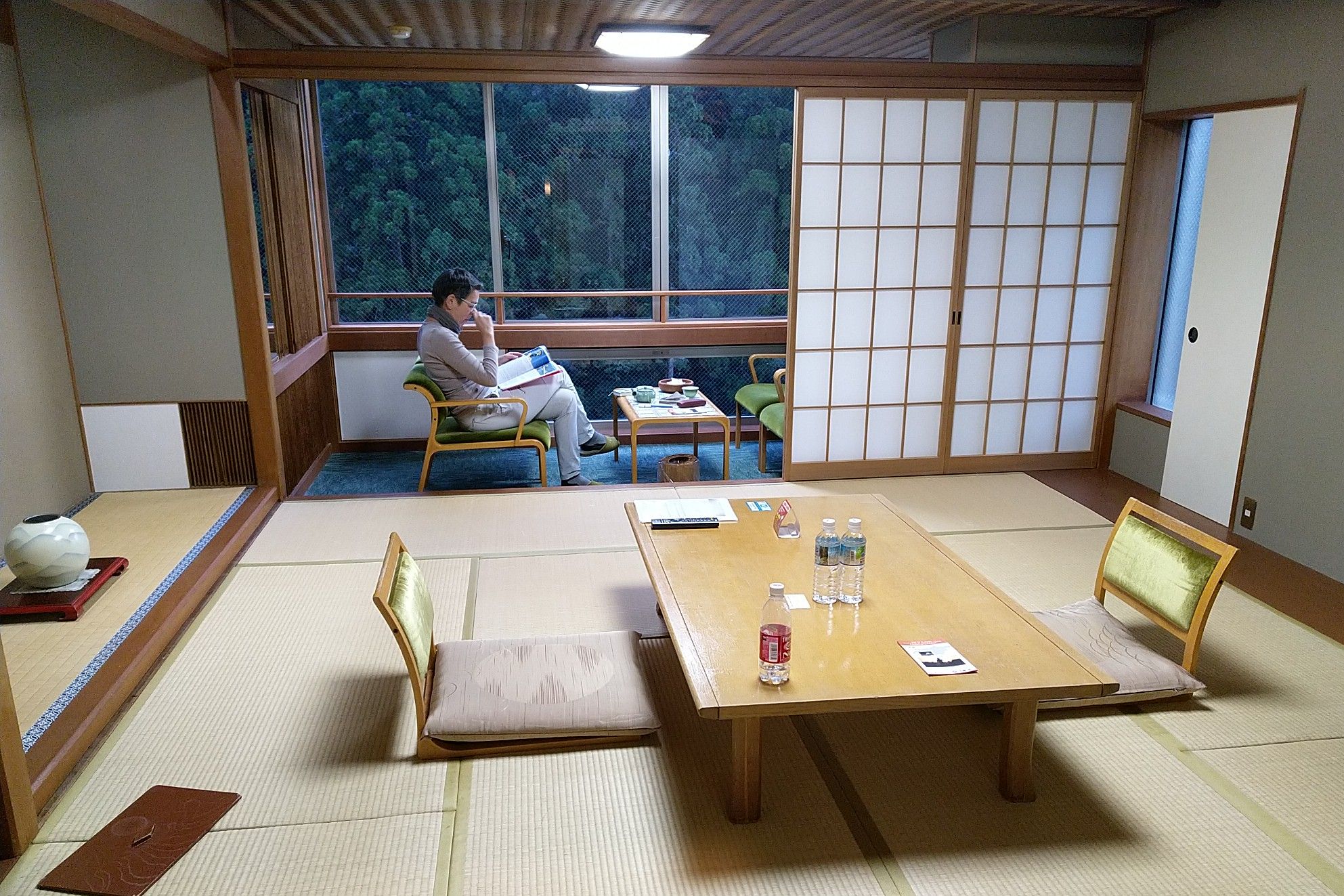 Hotel Kawayu Midoriya. Das Zimmer im 6.Stock hat einen Blick auf den Kumanofluss und ist meines Erachtens stylisch eingerichtet. Dummerweise gibt es auch hier Futons die wieder während des Abendessens aufgebaut werden. Wir kochen uns einen Tee/Instantkaffee und genießen ihn in unserem Wintergarten sitzend mit Blick auf den Fluß und die untergehende Sonne. Direkt unter uns können wir auf die Aussenanlagen des Hoteleigenen Onsen schauen.