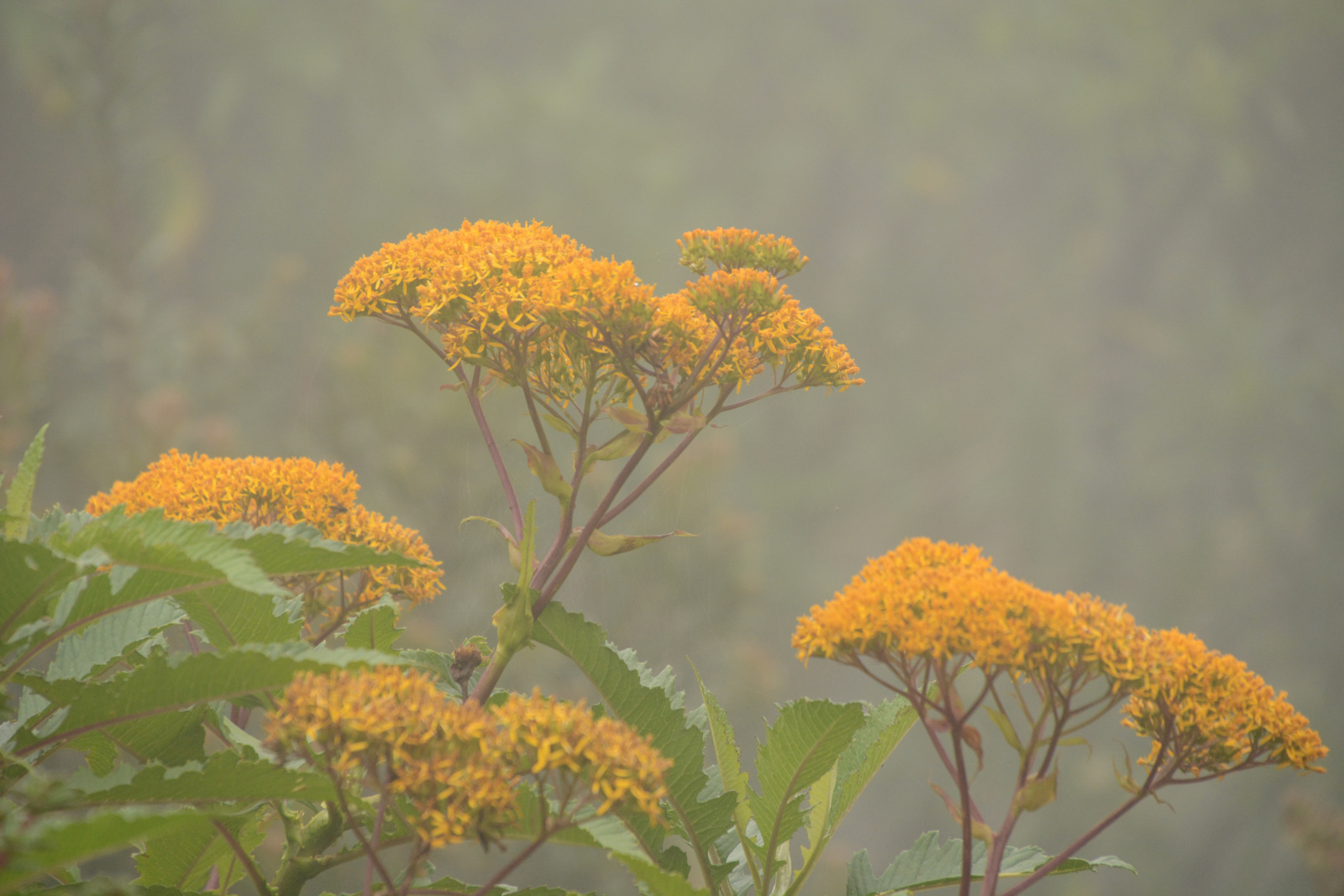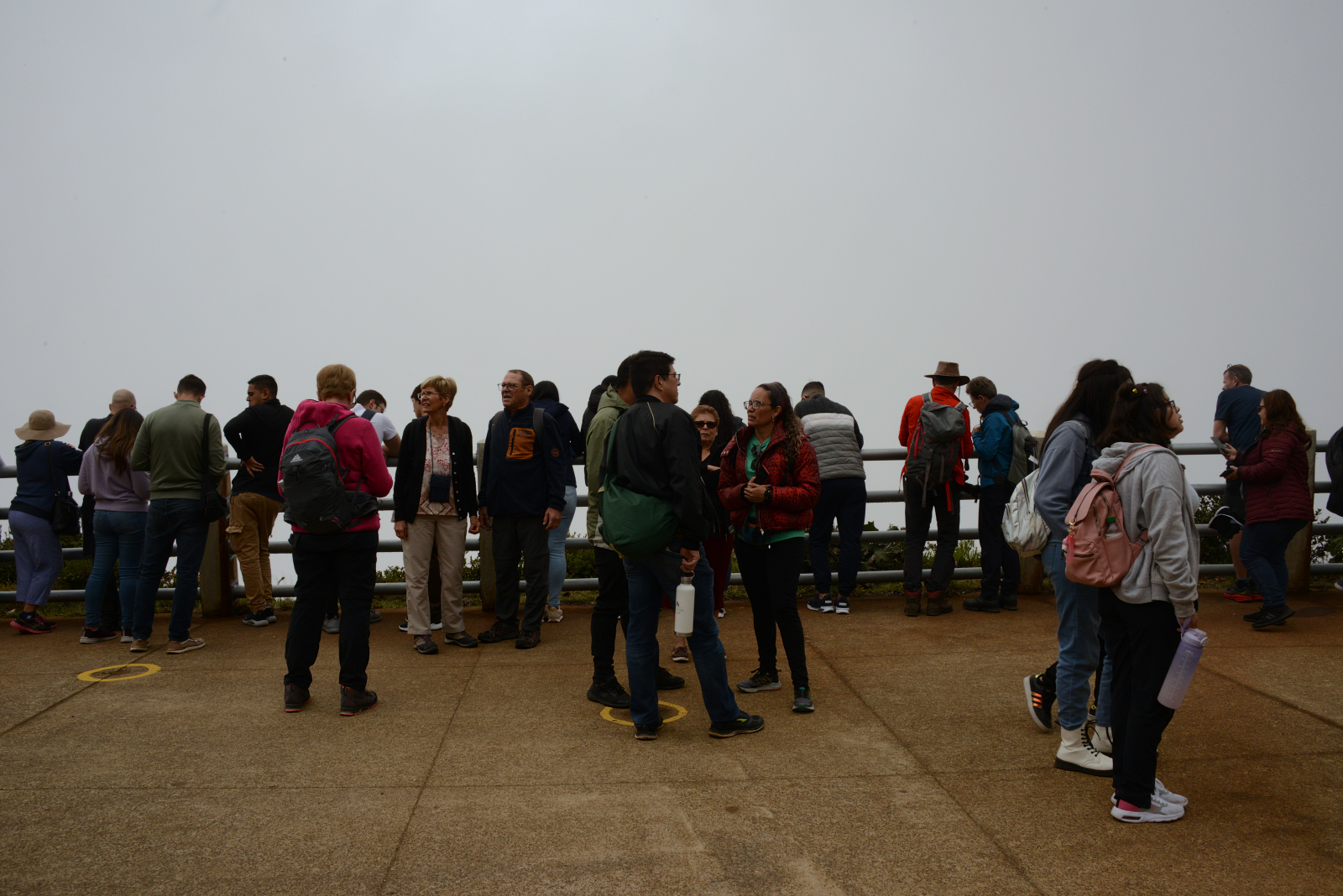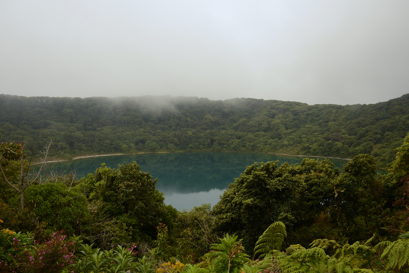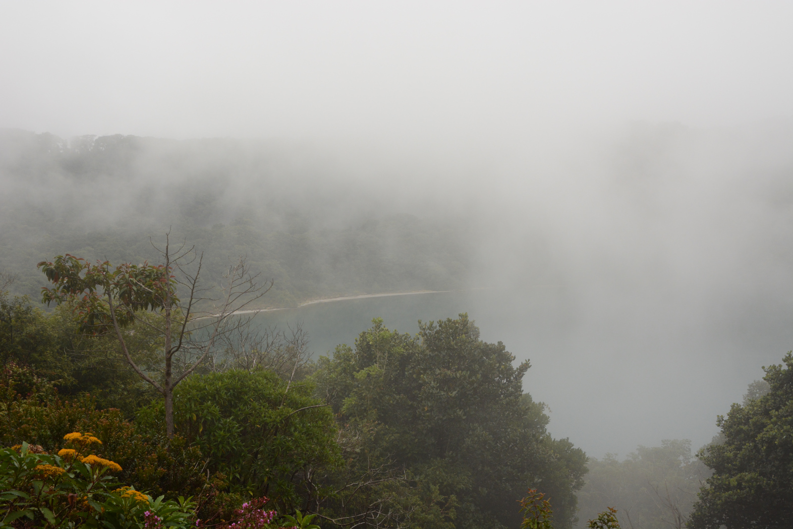 Am ersten Aussichtspunkt sehen wir – nix. Dichter Nebel hüllt den Kratersee in weisse Watte. Nach 15 Minuten entscheiden wir uns eine Etage höher zu einem weiteren See zu gehen. Auch dort ist zunächst alles dicht, aber dann reißt es auf und wir können kurz auf diesen schönen Kratersee schauen.