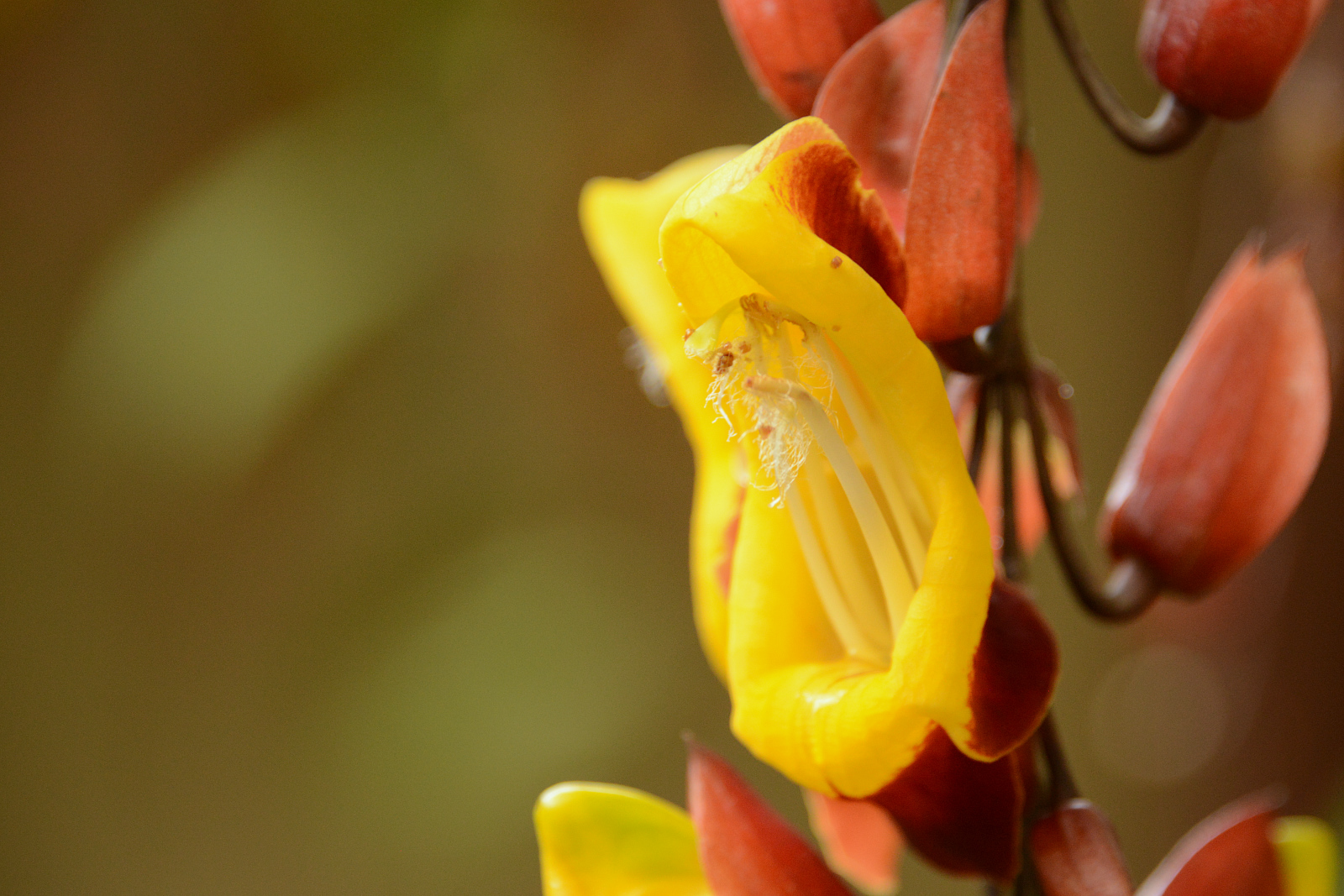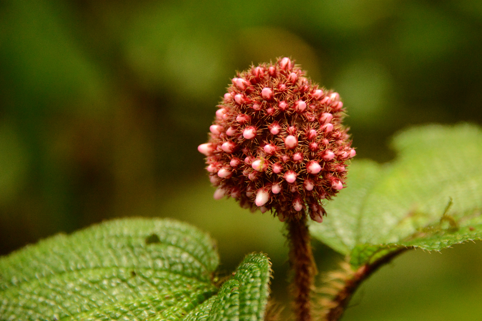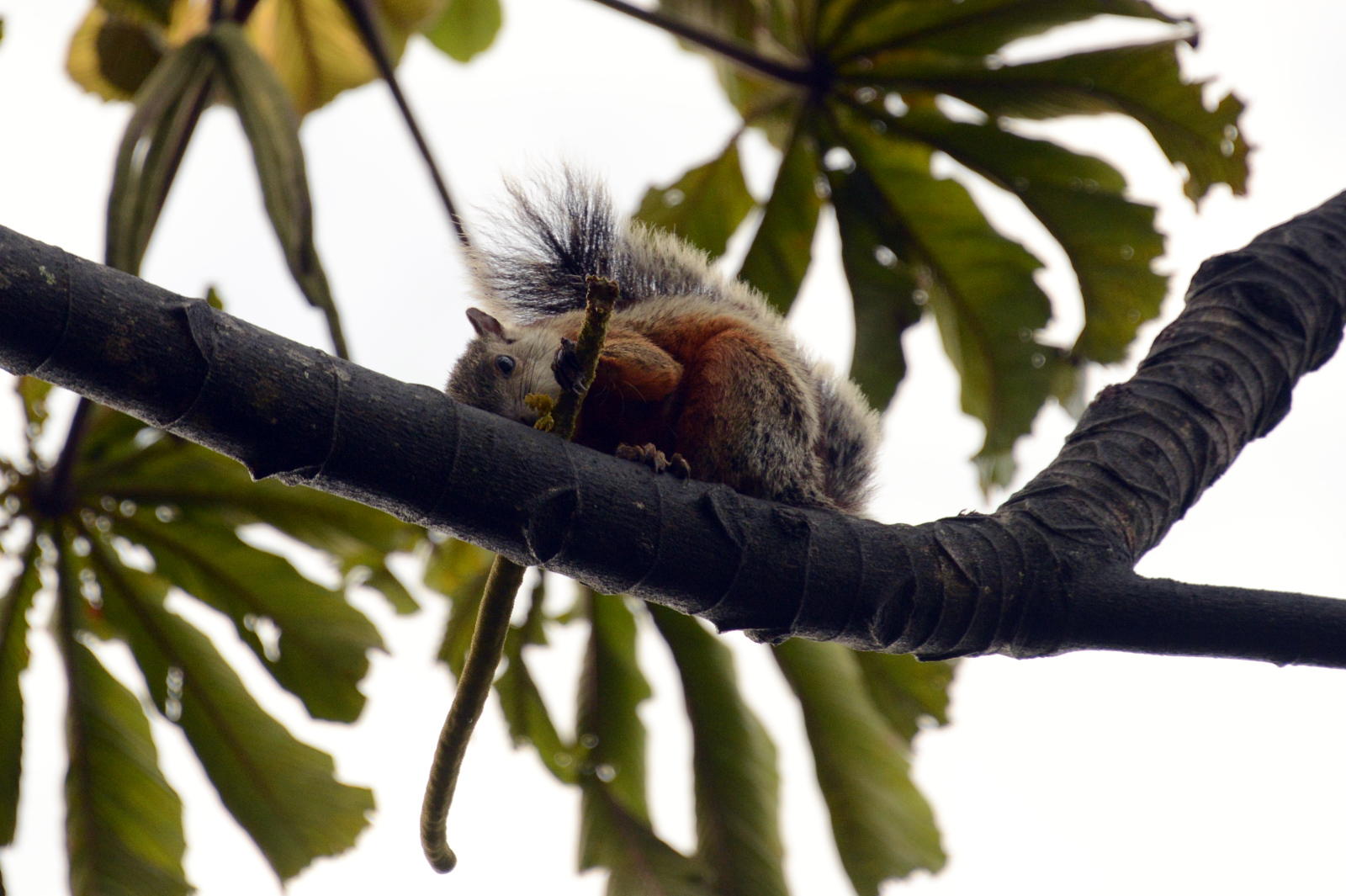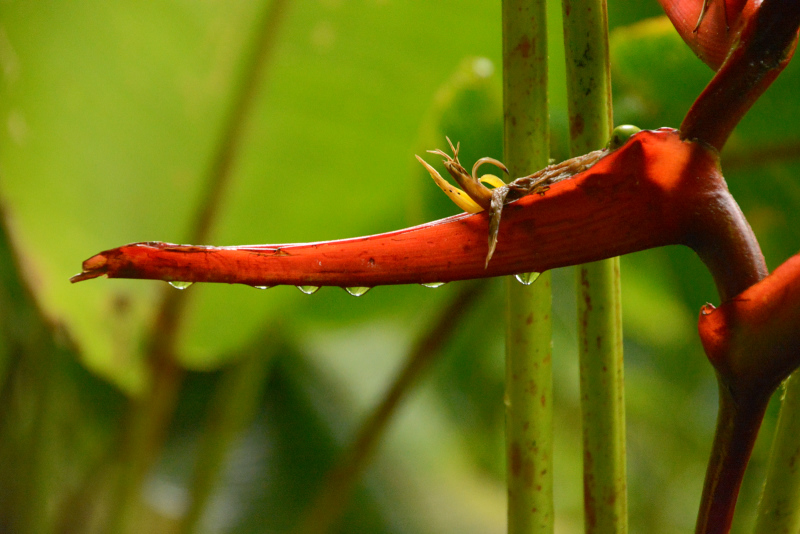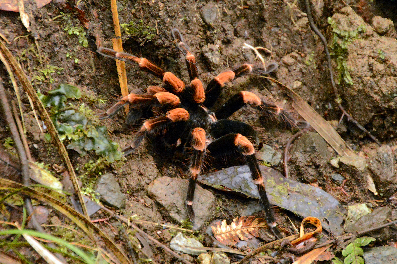 Vogelspinne mit orangefarbenen Kniescheiben. Hie und da sehen wir Tausendfüssler in gelb-schwarz. Es soll hier noch viele andere Tier geben, aber bei dem Trubel verziehen die sich natürlich. Wir sind auf etwa 1700m. Wir haben so etwa 20° und die Luftfeuchtigkeit ist bestimmt 100%. Wir kommen trotz Lichtmangel aus dem Fotografieren nicht mehr raus. Wir haben doch tatsächlich ein