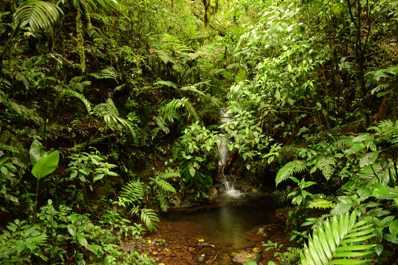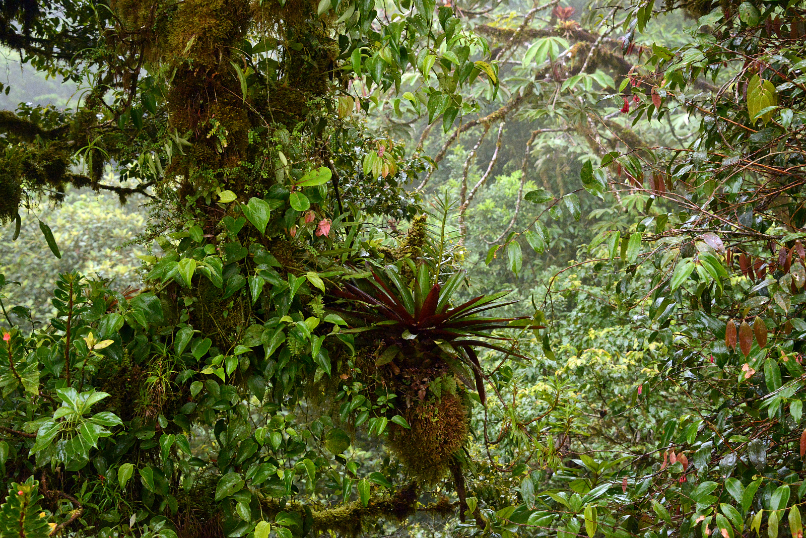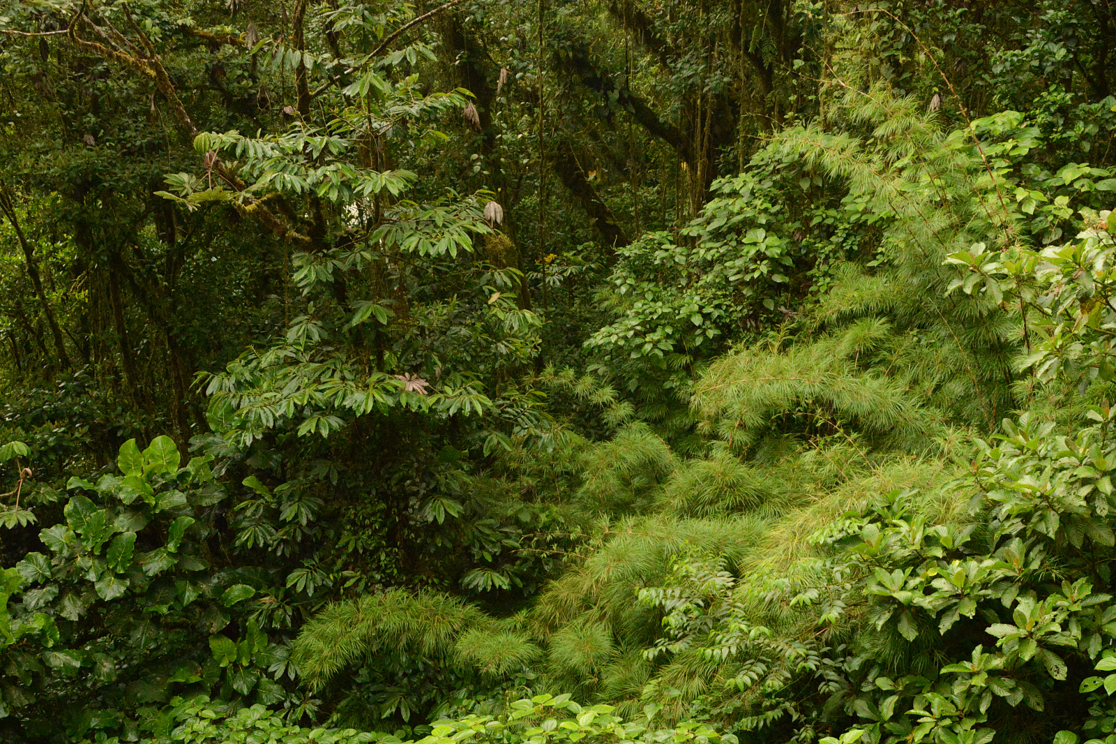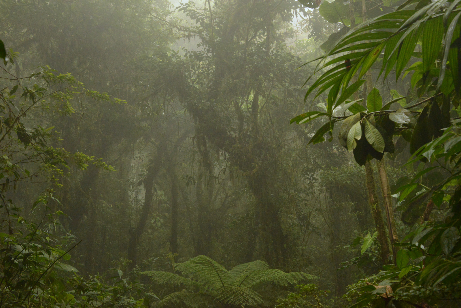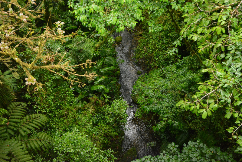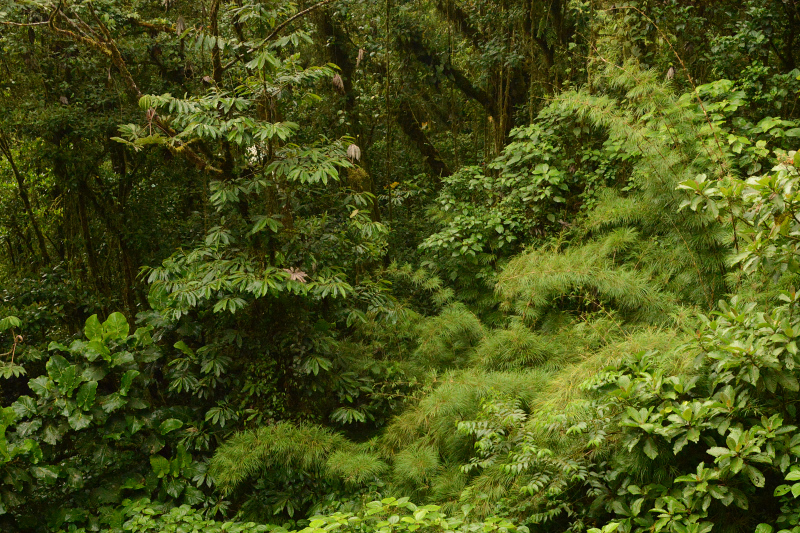 Es erwartet uns ein unvorstellbar schöner Nebelwald. Tolle Bäume, die über und über mit Bromelien, Farnen und weiss der Teufel was bewachsen sind. Wir wissen gar nicht wo wir zuerst hinsehen sollen. Leider ist es stockdunkel. Die Kamera ist auf die höchste Empfindlichkeit gestellt und trotzdem verwackeln wir viele Bilder. Der Wald ist undurchdringlich und nur über die angelegten Pfade zu laufen. An einer Kreuzug sieht jemand eine