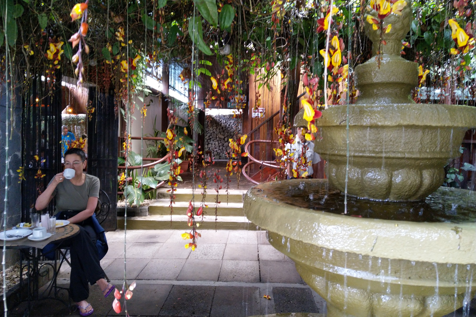 Im Restaurant ergattern wir keinen Platz mehr – so voll ist es. Zusätzlich auch noch Buffett mit Rennerei. Gott sei Dank ist am Springbrunnen unter den Orchideen noch ein Platz. Bestens. Ruhig ohne Gerenne. Der Café schmeckt sogar ohne Zucker und auf dem Buffett gibt es Costa-Ricanische Spezialitäten. So lassen wir uns das Frühstück gefallen.