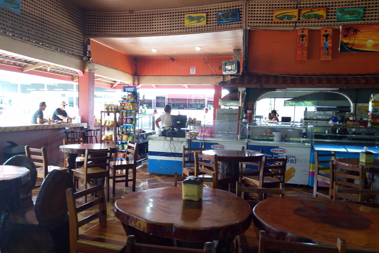 Nach halber Strecke halten wir an einer sehr belebten Kreuzung. Es gibt einen Café und im Supermarkt gönnen wir uns ein Eis. Die „Restaurants“ sind auf Trucker eingestellt. Rund um die Küche ist ein Tresen an dem man sitzt. Sehr praktisch wenn man die Strasse und seinen Laster im Auge behalten will. Hier kommen alle Laster aus oder von Nicaragua. Außerdem gibt es hier einige sehr große Leguane zu bestaunen.