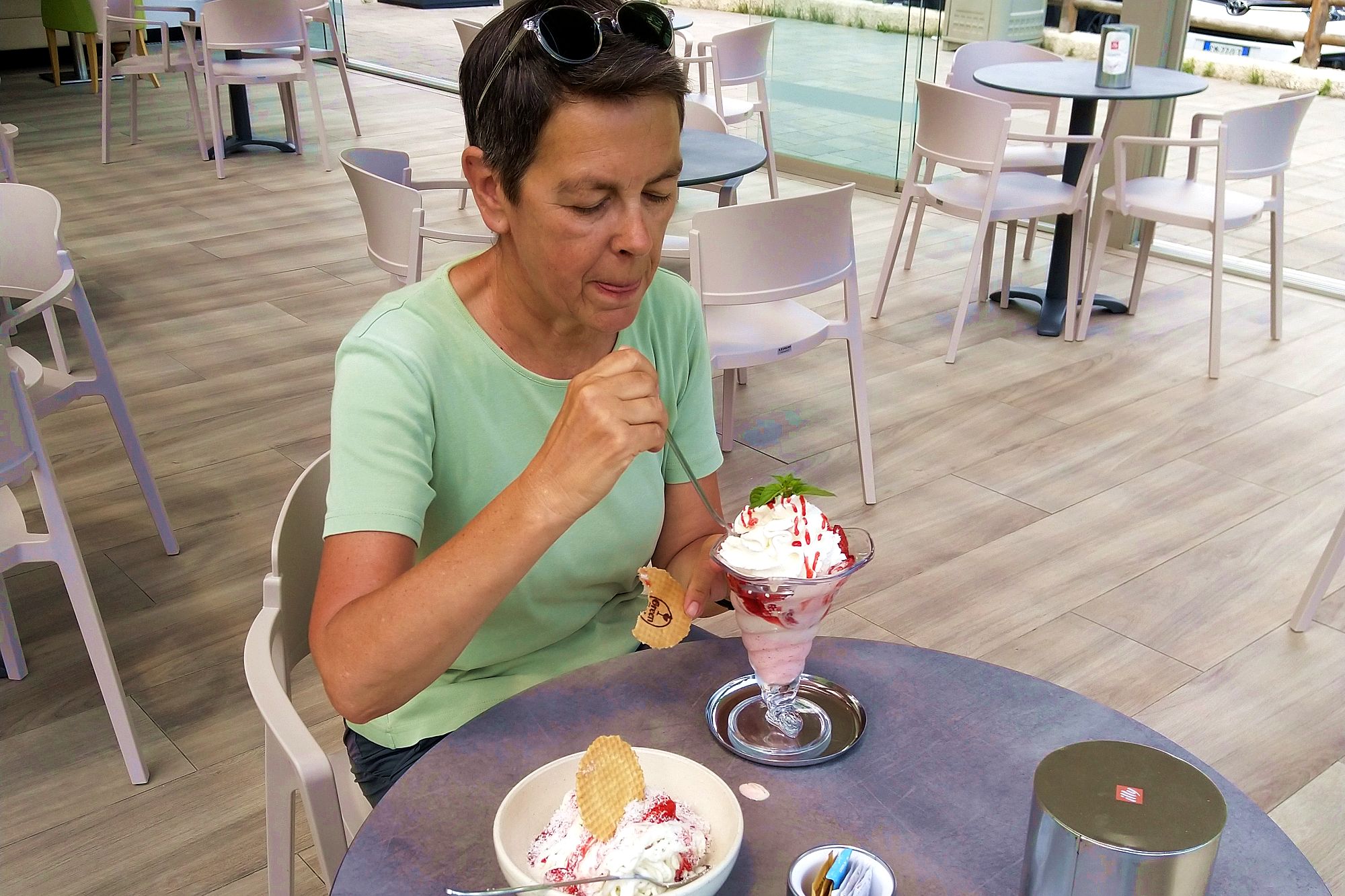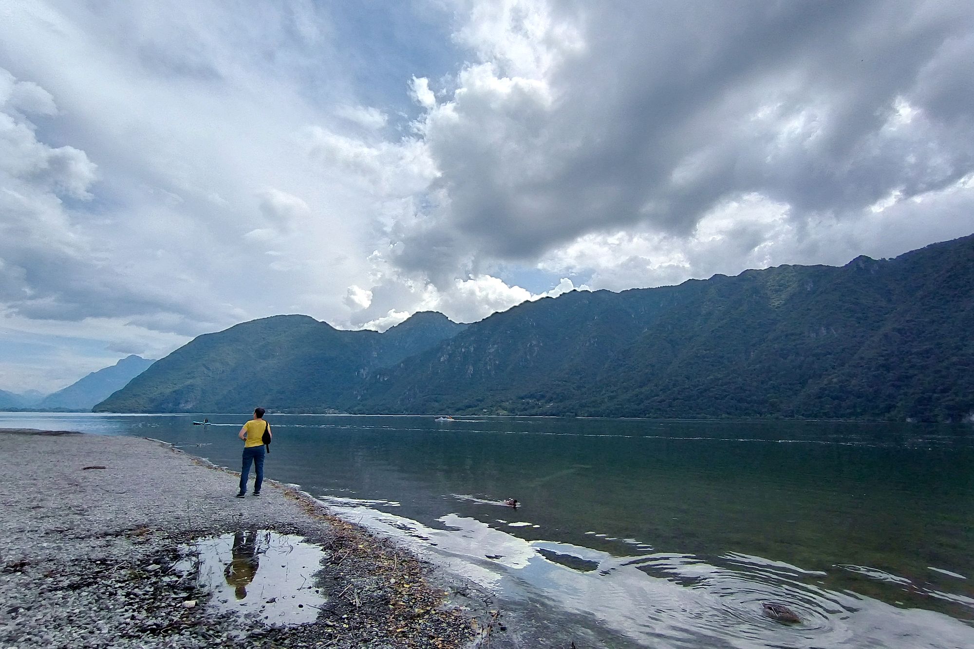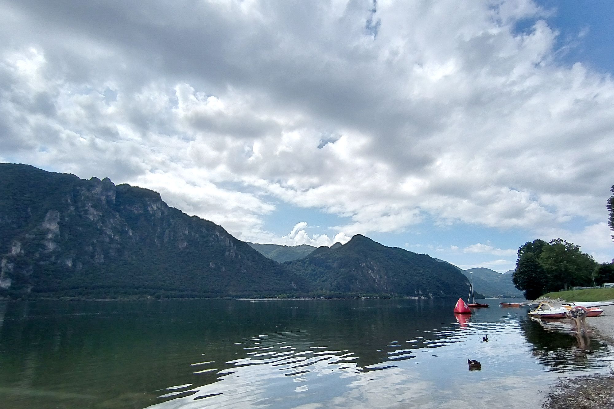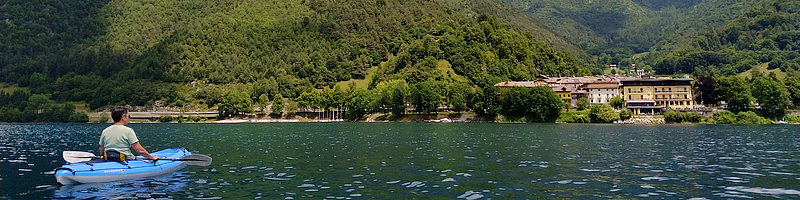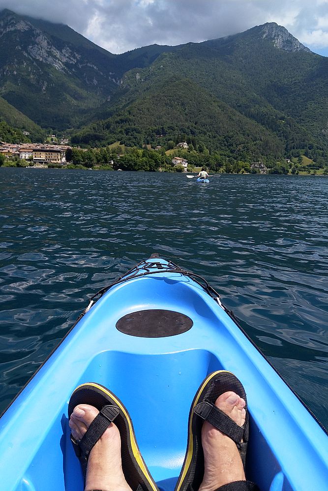 Das Wetter scheint zu halten, entgegen der Vorhersage, und so fahren wir ins Hotel zurück und ziehen uns um. Am Ledrosee mieten wir uns 2 Einerkajaks und los gehts. Wir paddeln bis etwa Pur und dann rüber nach Mezzolago und zurück. Nach fast genau einer Stunde sind wir in Pieve zurück. Auf Elkes Wunschzettel steht jetzt nur noch ein Eisbecher. Auch das wird prompt erledigt.