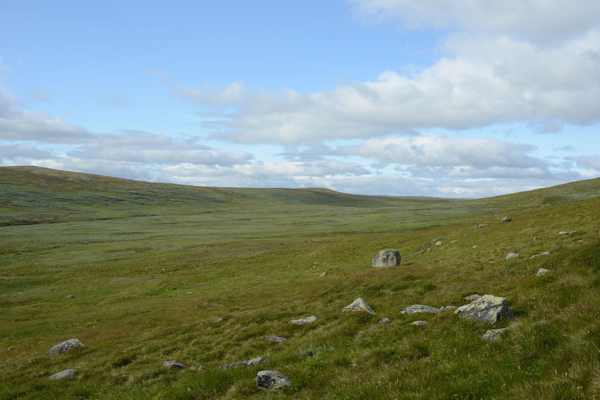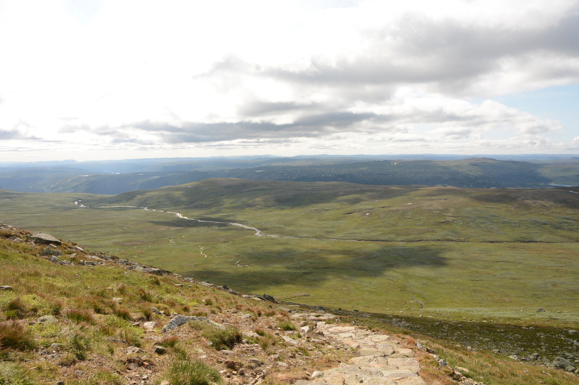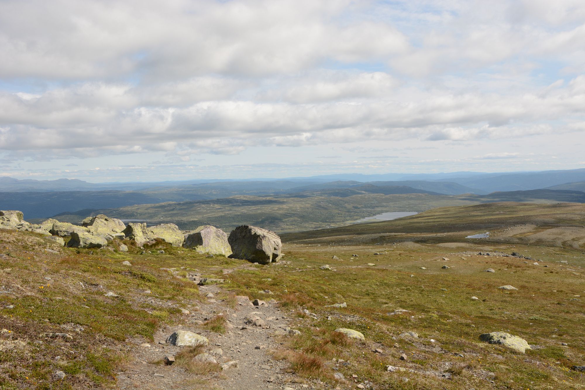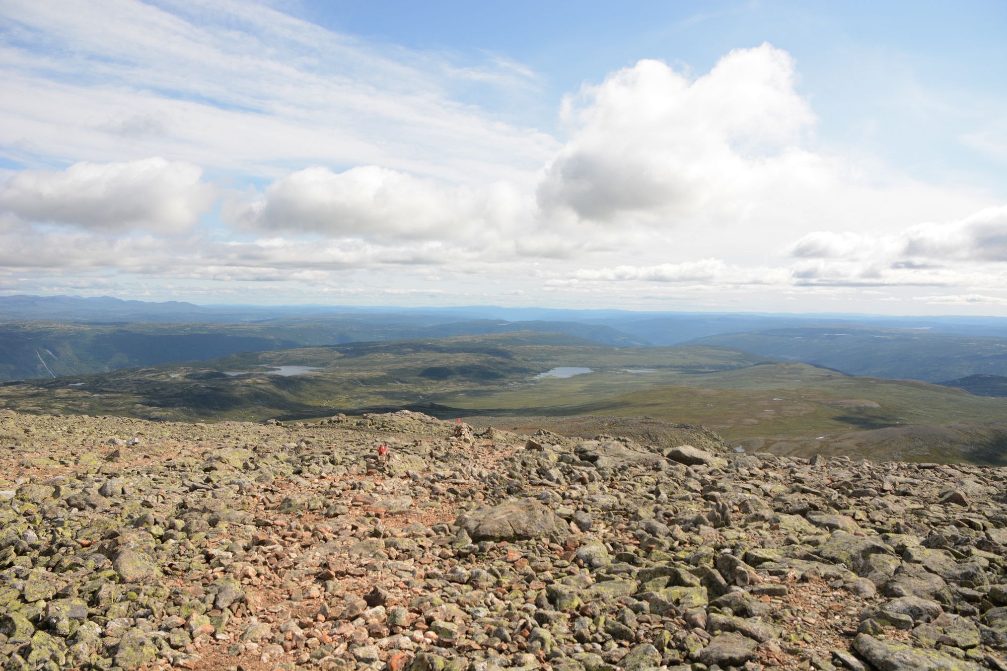Heute Morgen ist es schon wieder sonnig. Also beschliessen wir die Wanderung 'Prestholtseter-Runde' zu machen. 1240m auf 1705m (475 rauf und wieder runter in Summe), 6,6km über 3 Stunden. Anhand der Daten sieht man schon, daß es schwierig zu sein scheint. Die Wanderung beginnt 11km vom Hotel entfernt den Berg hoch.