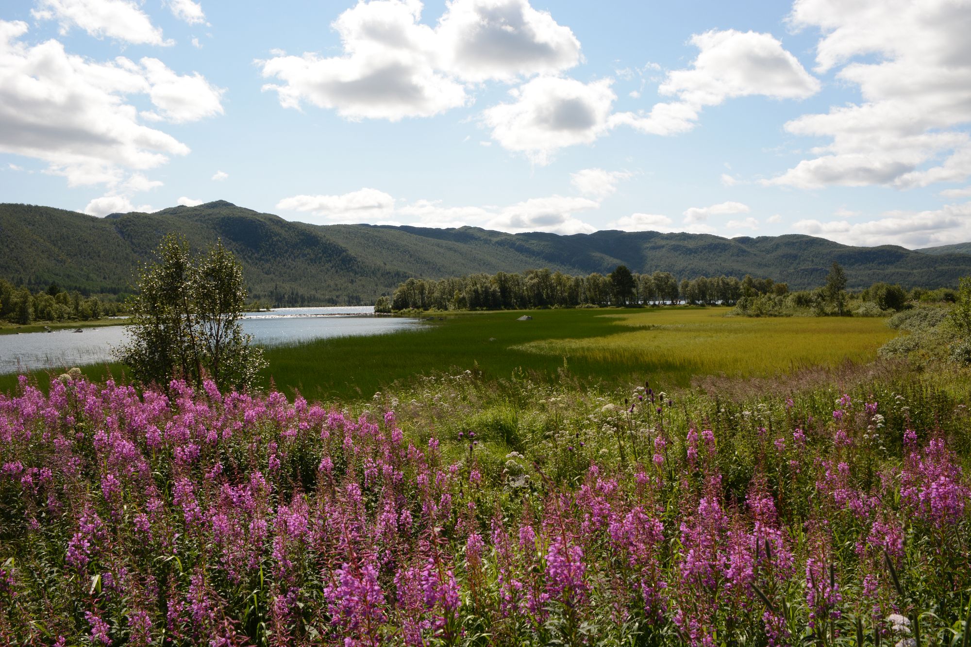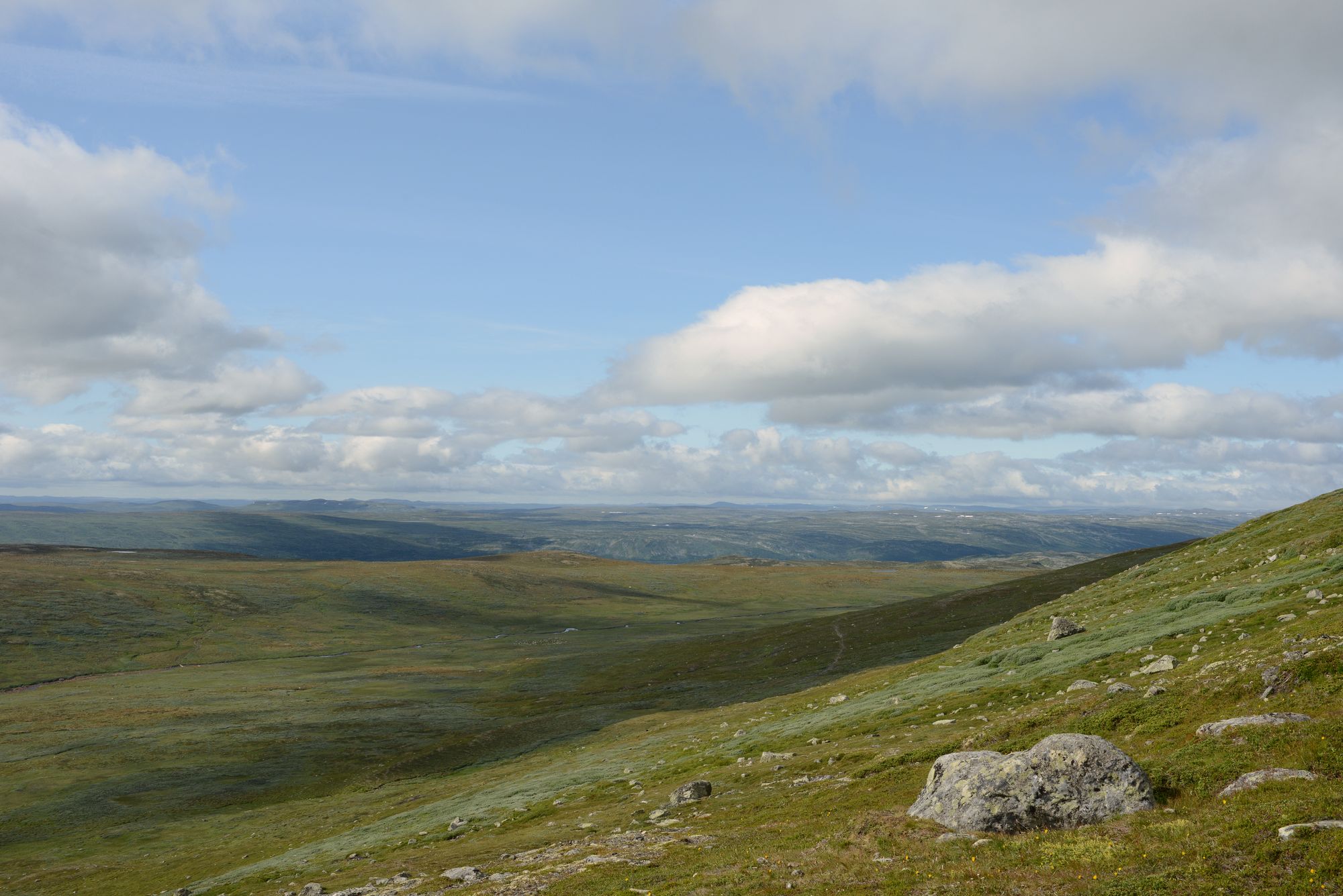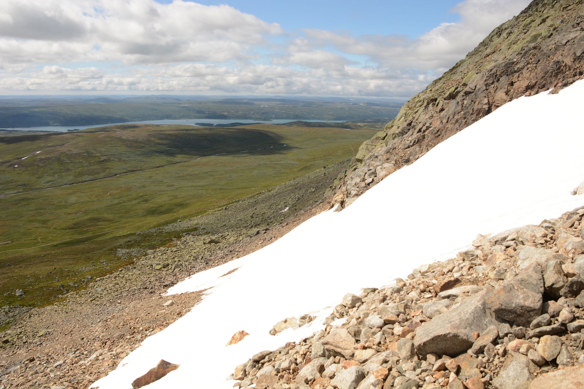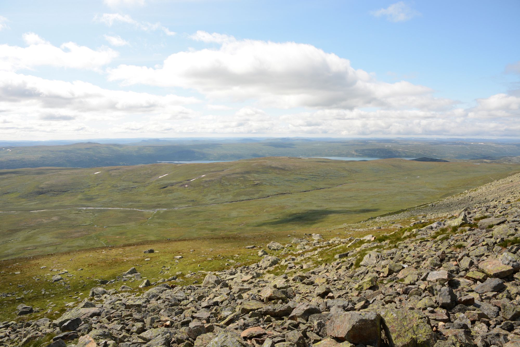 Heute Morgen ist es schon wieder sonnig. Also beschliessen wir die Wanderung 'Prestholtseter-Runde' zu machen. 1240m auf 1705m (475 rauf und wieder runter in Summe), 6,6km über 3 Stunden. Anhand der Daten sieht man schon, daß es schwierig zu sein scheint. Die Wanderung beginnt 11km vom Hotel entfernt den Berg hoch.