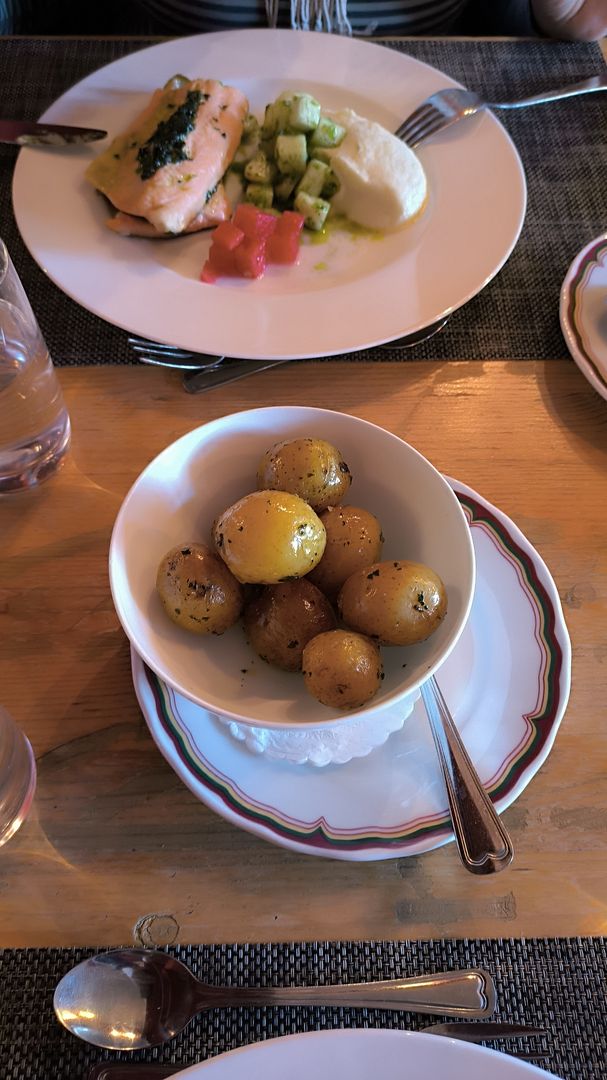 Zum Essen gibt es tatsächlich das Walcarpaccio, und dann zweimal Forelle. Einmal im Ofen gebacken und einmal gegrillt, jeweils mit Selleriepüree, wahrscheinlich Schmorgurken, Wassermelone! Und Pellkartöffelchen. Sehr sehr lecker. Der Wal hat überhaupt nicht nach Fisch geschmeckt - ist ja auch ein Säugetier 😀. Interessanterweise fast nach nichts, schwer zu beschreiben. Die Weinkarte umfasste 50! Seiten, meist doppelseitig und eng bedruckt!!!! Klasse. Wir wählen einen Riesling aus dem Elsass. Ein Aquavit rundet alles ab.