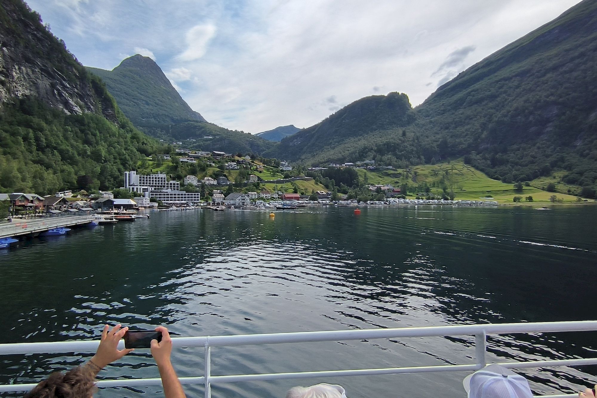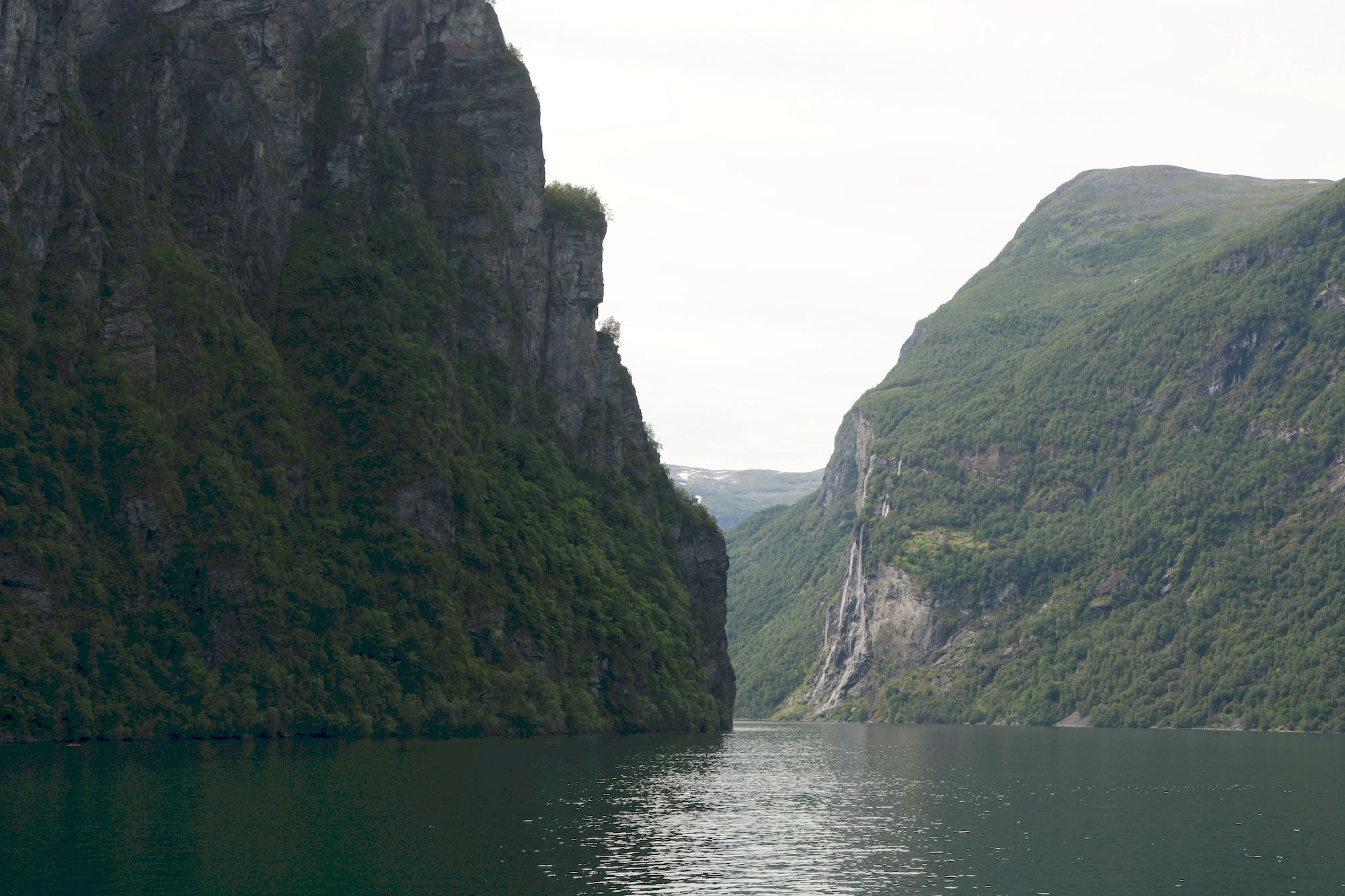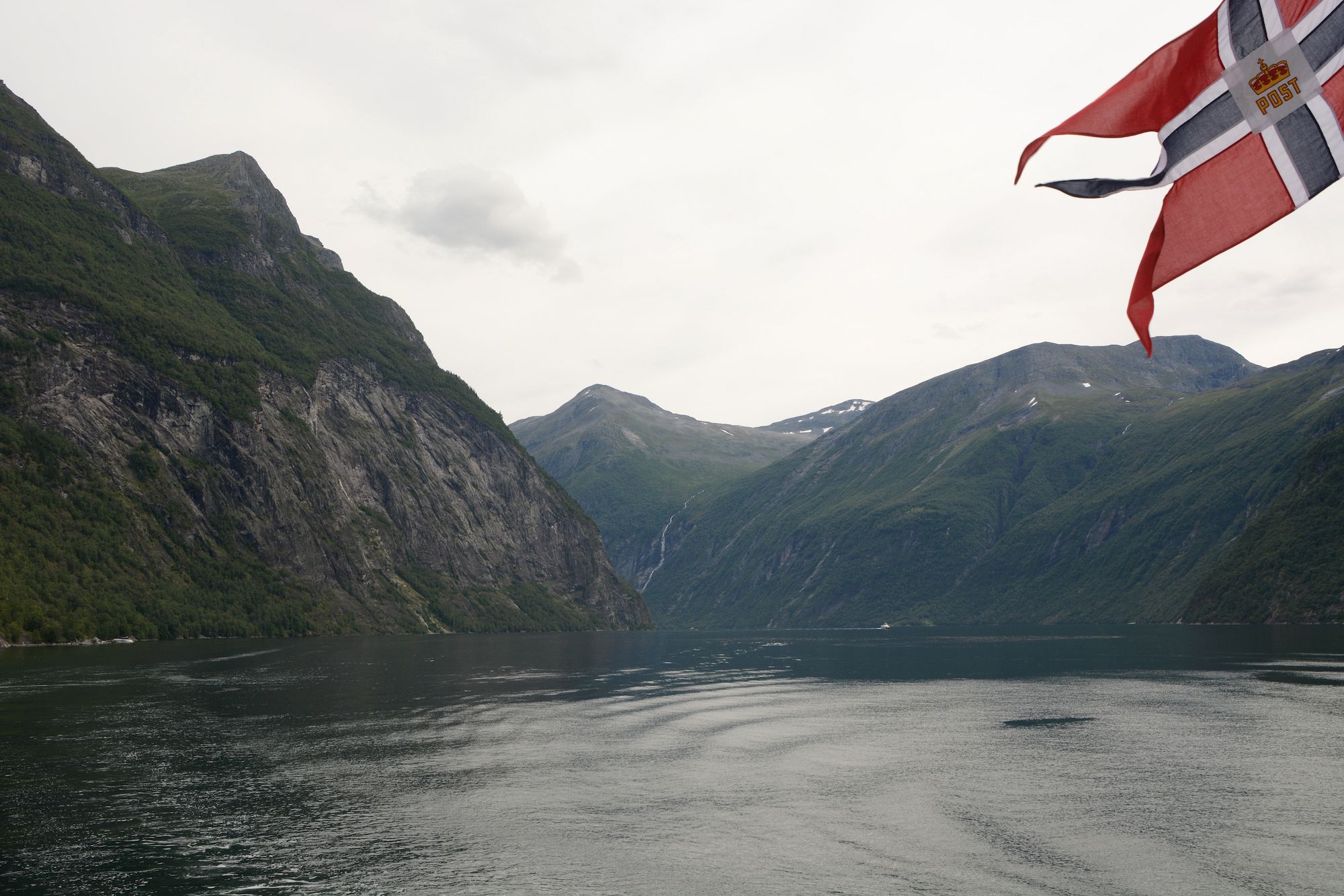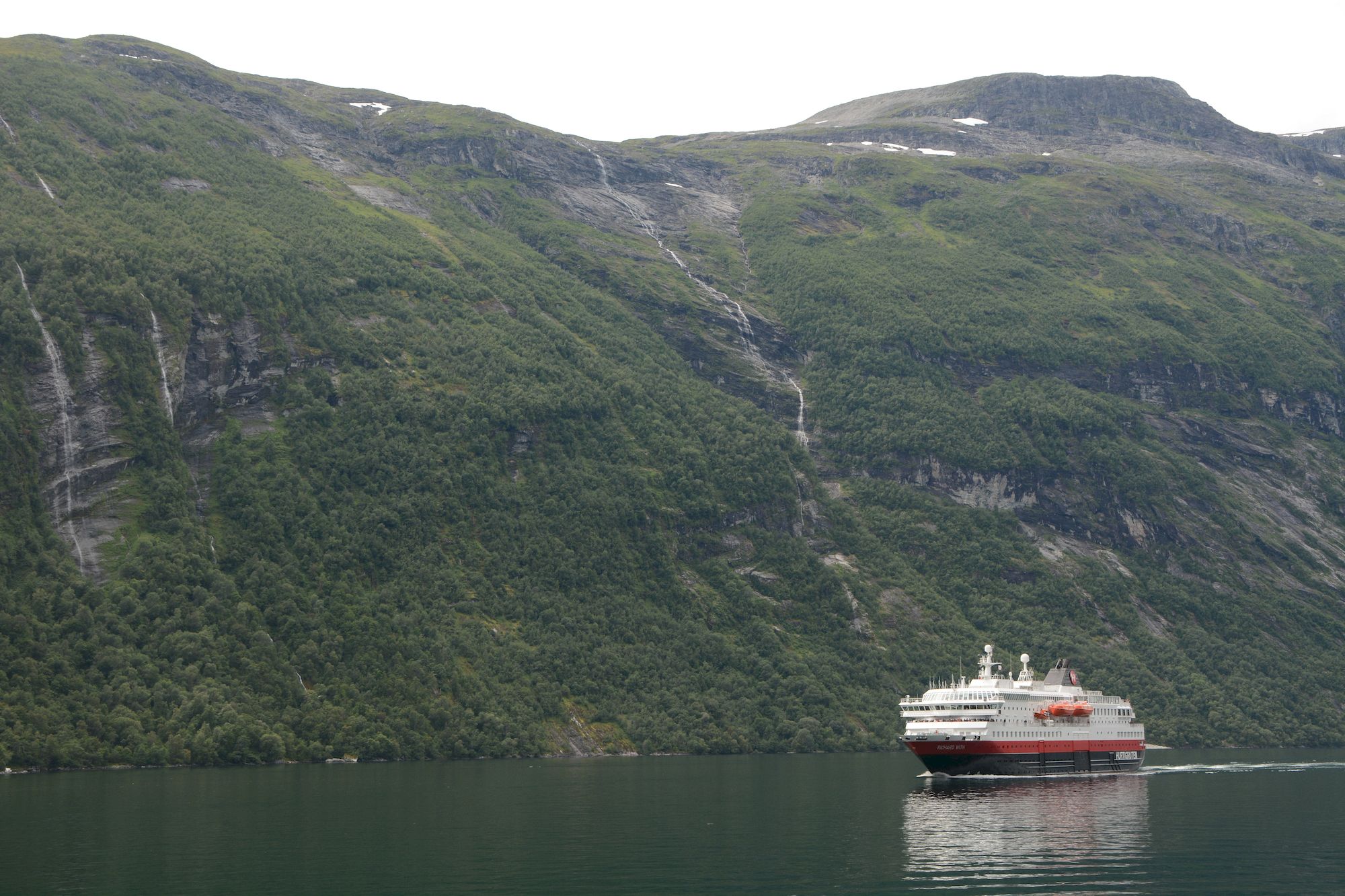 1095 NOK für etwas über eine Stunde, quasi eine Minikreuzfahrt. Leider ist auch ein Bus mit Asiaten auf der Fähre. Es ist immer wieder erstaunlich wie raumgreifend die sein können und einen versuchen von der Bank zu schubsen. Nach und nach natürlich, aber beharrlich. Wir können nicht so ganz nachvollziehen warum der Geirangerfjord als einer der Schönsten gilt. Als einer der Überlaufensden allemal. Um Loen rum die Fjorde und Seen stehen dem in nichts nach. Dummerweise zieht sich der Himmel etwas zu und das Licht ist nicht mehr so dolle. Ein Hurtigrutenschiff kommt uns entgegen. Ist tatsächlich nicht soo groß.
