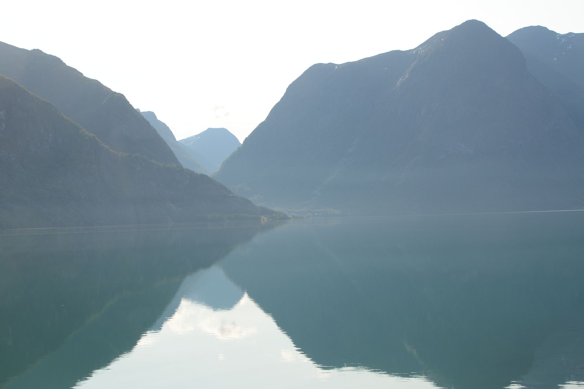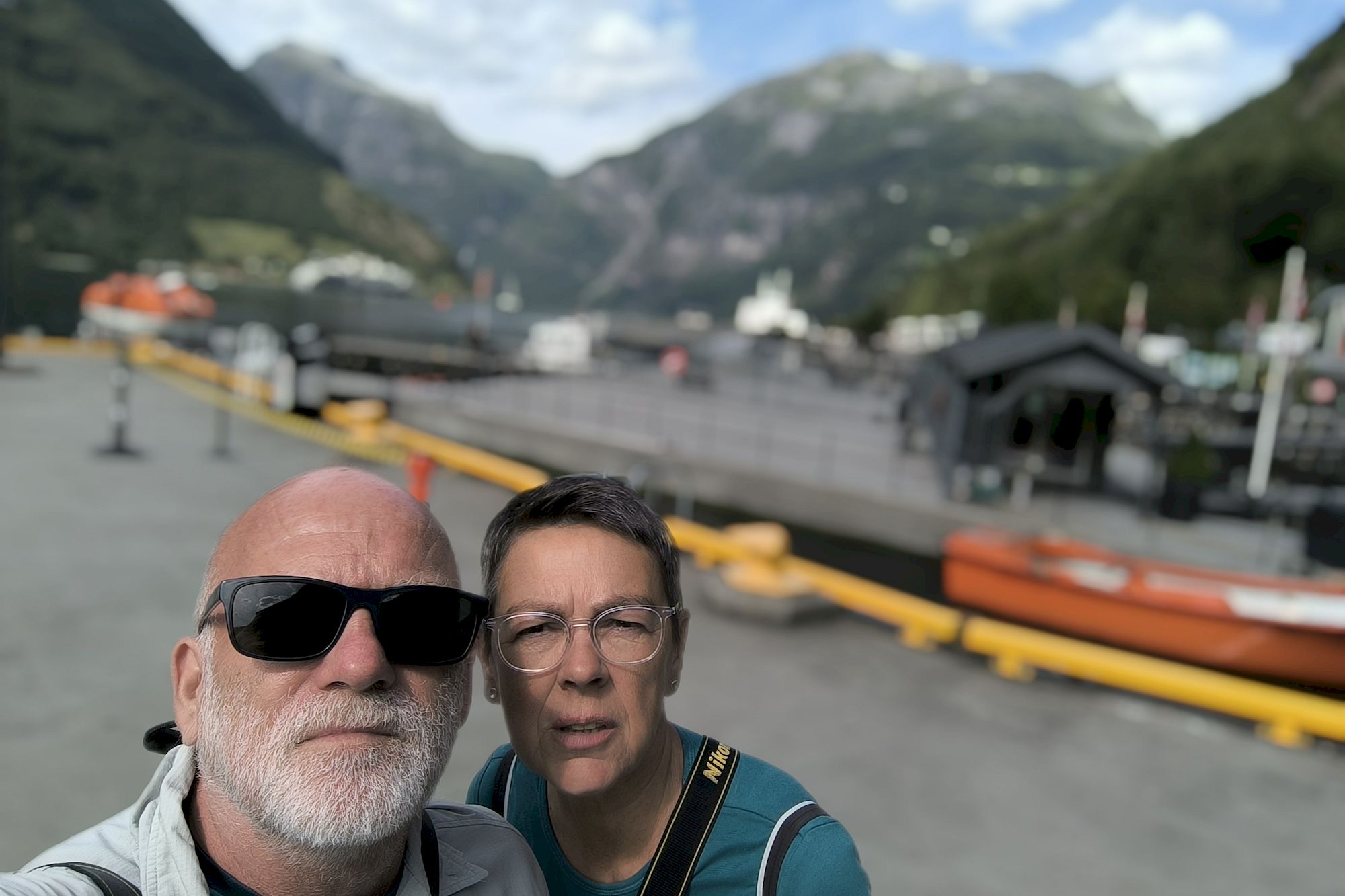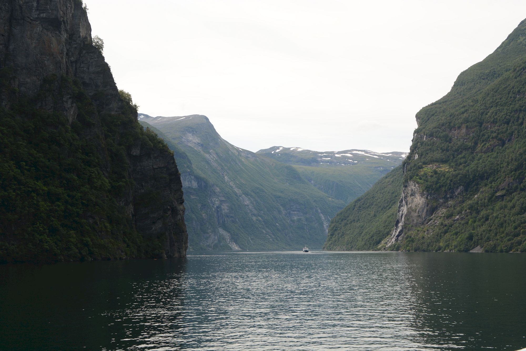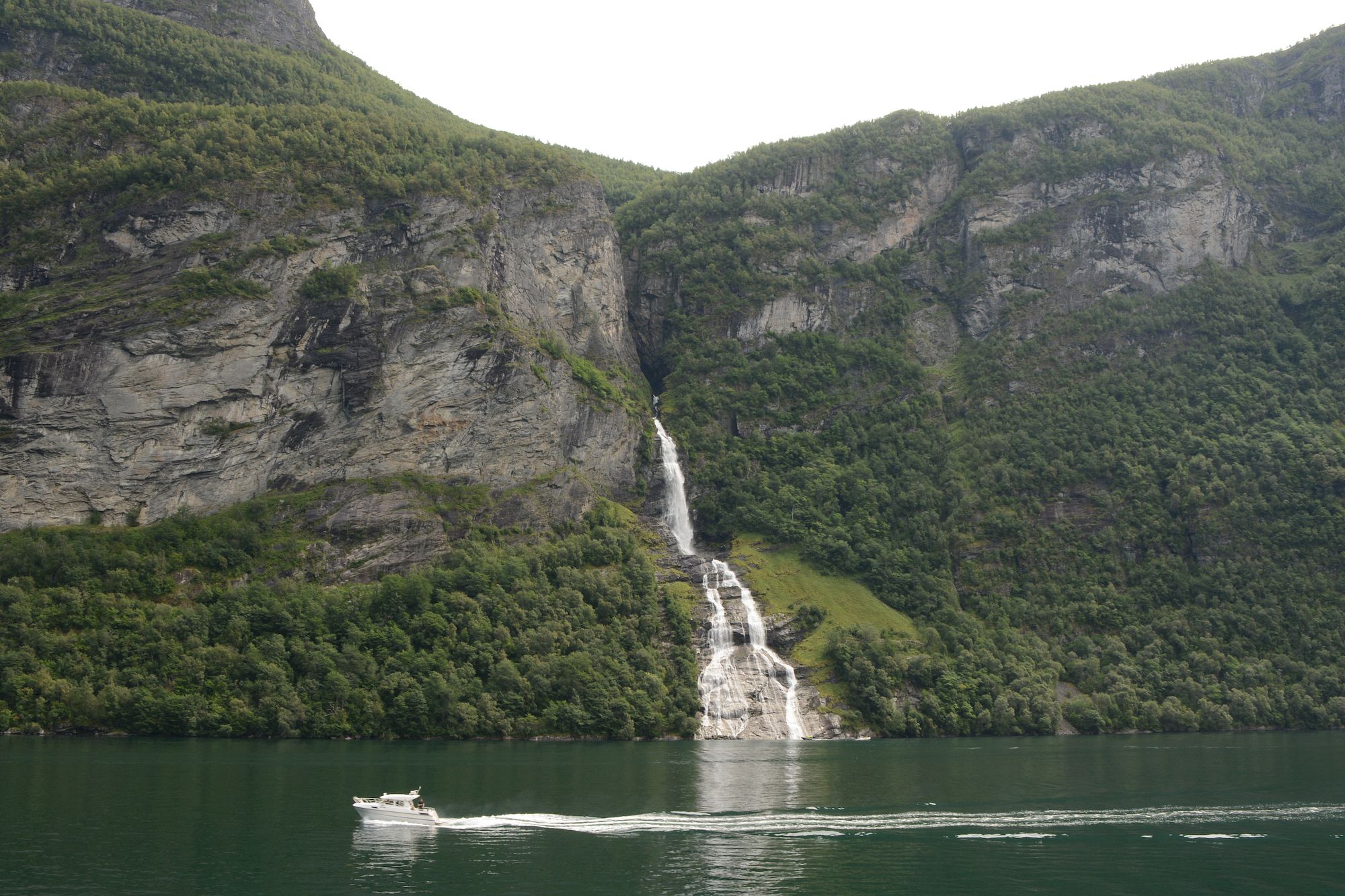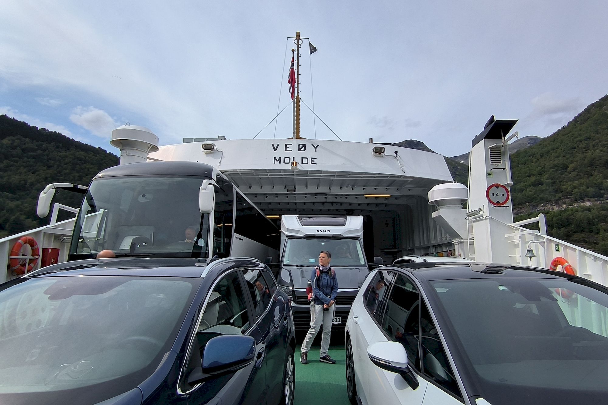 1095 NOK für etwas über eine Stunde, quasi eine Minikreuzfahrt. Leider ist auch ein Bus mit Asiaten auf der Fähre. Es ist immer wieder erstaunlich wie raumgreifend die sein können und einen versuchen von der Bank zu schubsen. Nach und nach natürlich, aber beharrlich. Wir können nicht so ganz nachvollziehen warum der Geirangerfjord als einer der Schönsten gilt. Als einer der Überlaufensden allemal. Um Loen rum die Fjorde und Seen stehen dem in nichts nach. Dummerweise zieht sich der Himmel etwas zu und das Licht ist nicht mehr so dolle. Ein Hurtigrutenschiff kommt uns entgegen. Ist tatsächlich nicht soo groß.