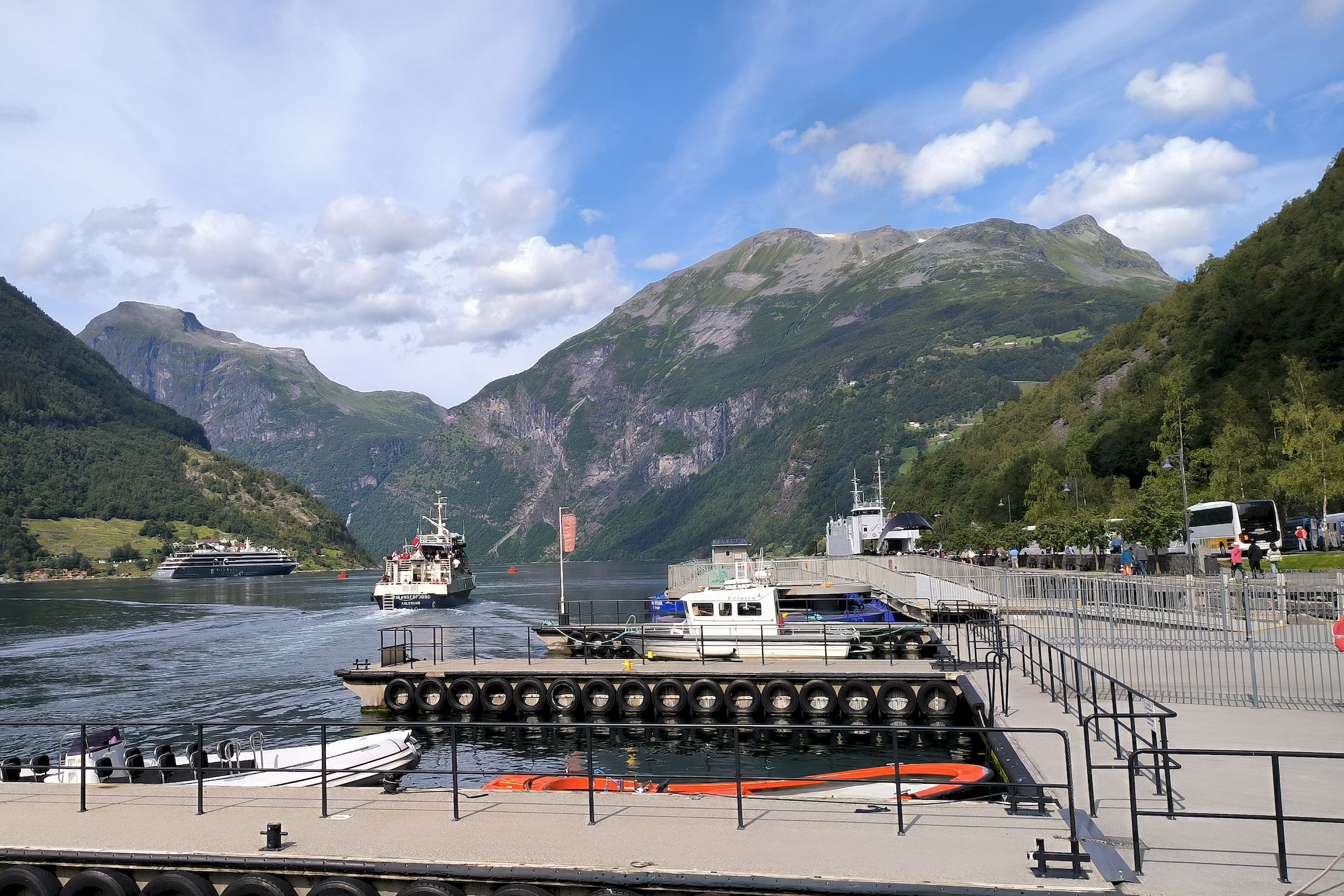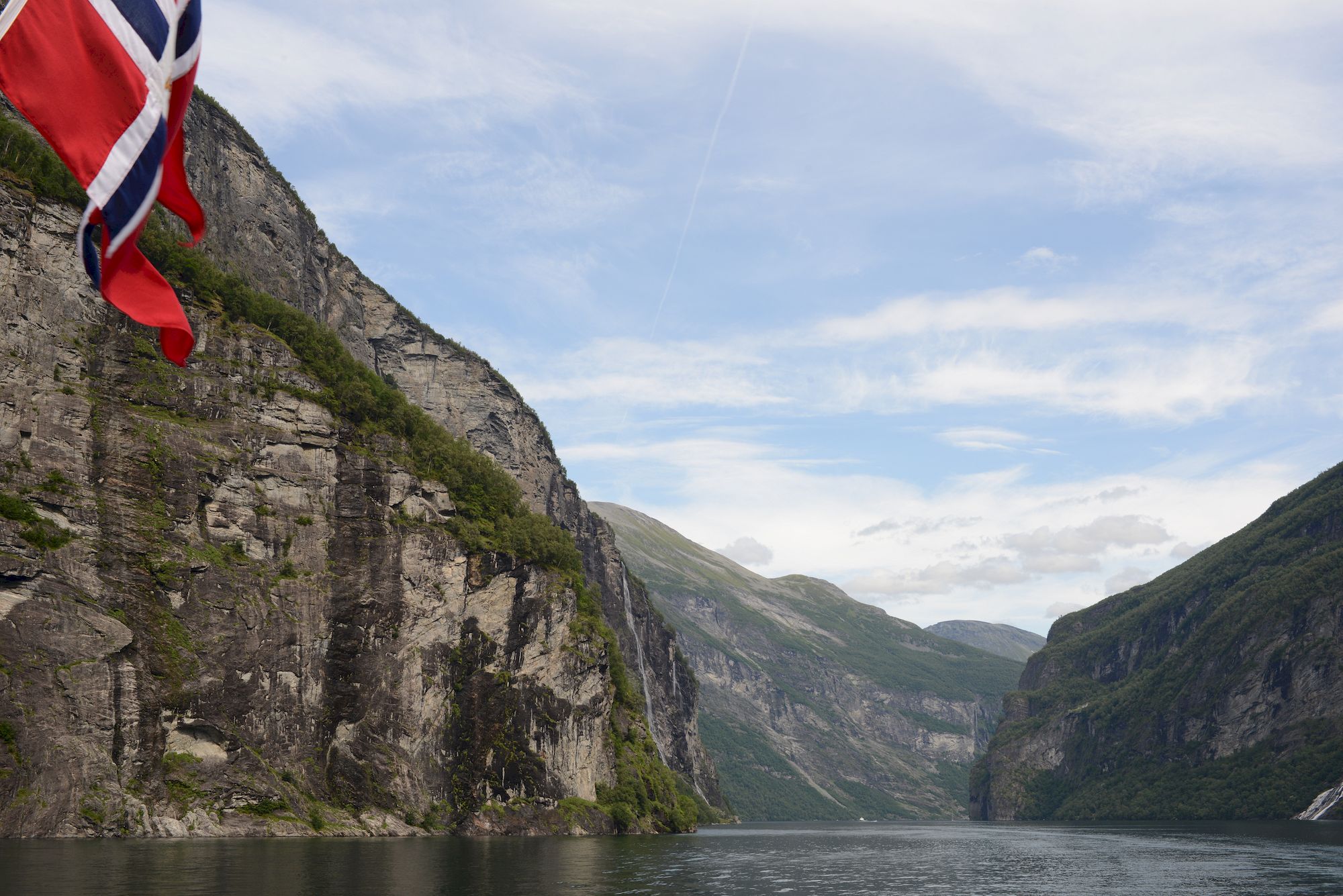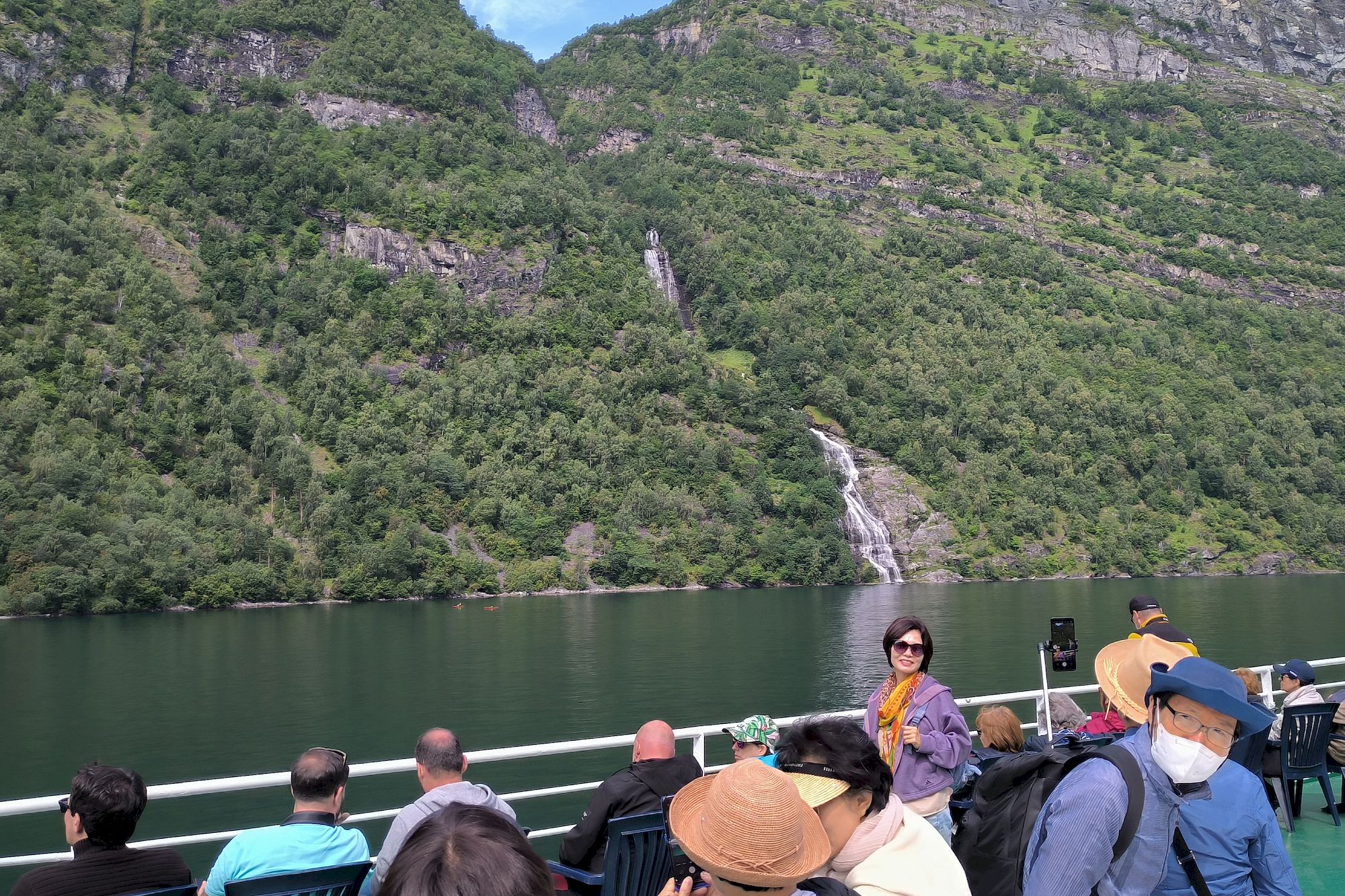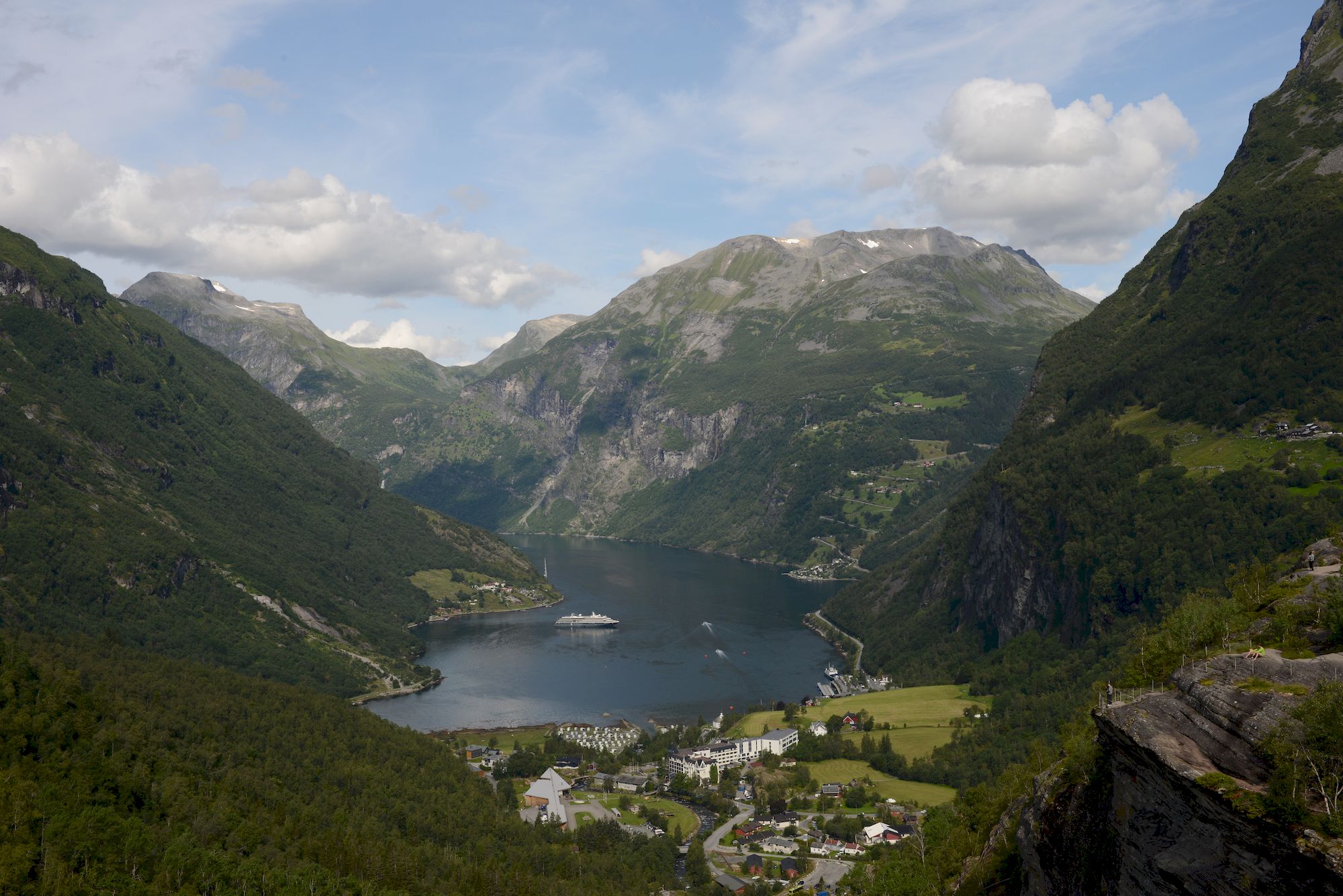 1095 NOK für etwas über eine Stunde, quasi eine Minikreuzfahrt. Leider ist auch ein Bus mit Asiaten auf der Fähre. Es ist immer wieder erstaunlich wie raumgreifend die sein können und einen versuchen von der Bank zu schubsen. Nach und nach natürlich, aber beharrlich. Wir können nicht so ganz nachvollziehen warum der Geirangerfjord als einer der Schönsten gilt. Als einer der Überlaufensden allemal. Um Loen rum die Fjorde und Seen stehen dem in nichts nach. Dummerweise zieht sich der Himmel etwas zu und das Licht ist nicht mehr so dolle. Ein Hurtigrutenschiff kommt uns entgegen. Ist tatsächlich nicht soo groß.