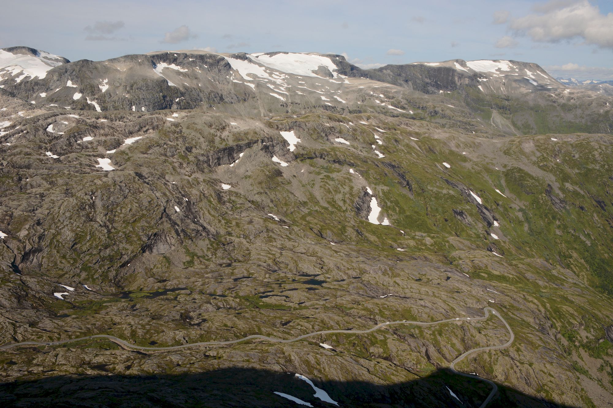 Wir biegen Richtung Geirangerfjord ab und die Landschaft wird zunehmend imposanter. So schön hatten wir uns das nicht vorgestellt. Wir schrauben uns auf 1500m hoch. Leider gibt es so gut wie keine Haltebuchten um Fotos zu machen, oder sie sind von Wohnmobilen blockert. Das letzte Stück zum