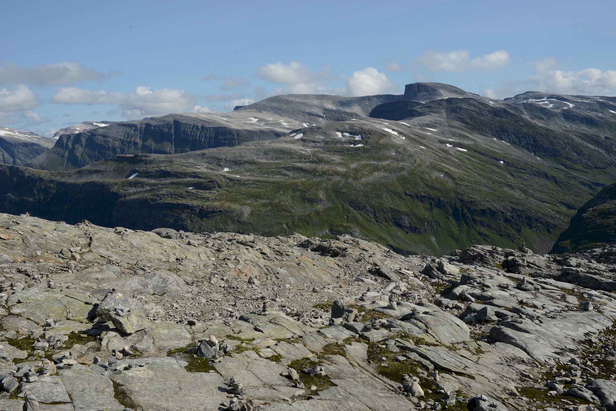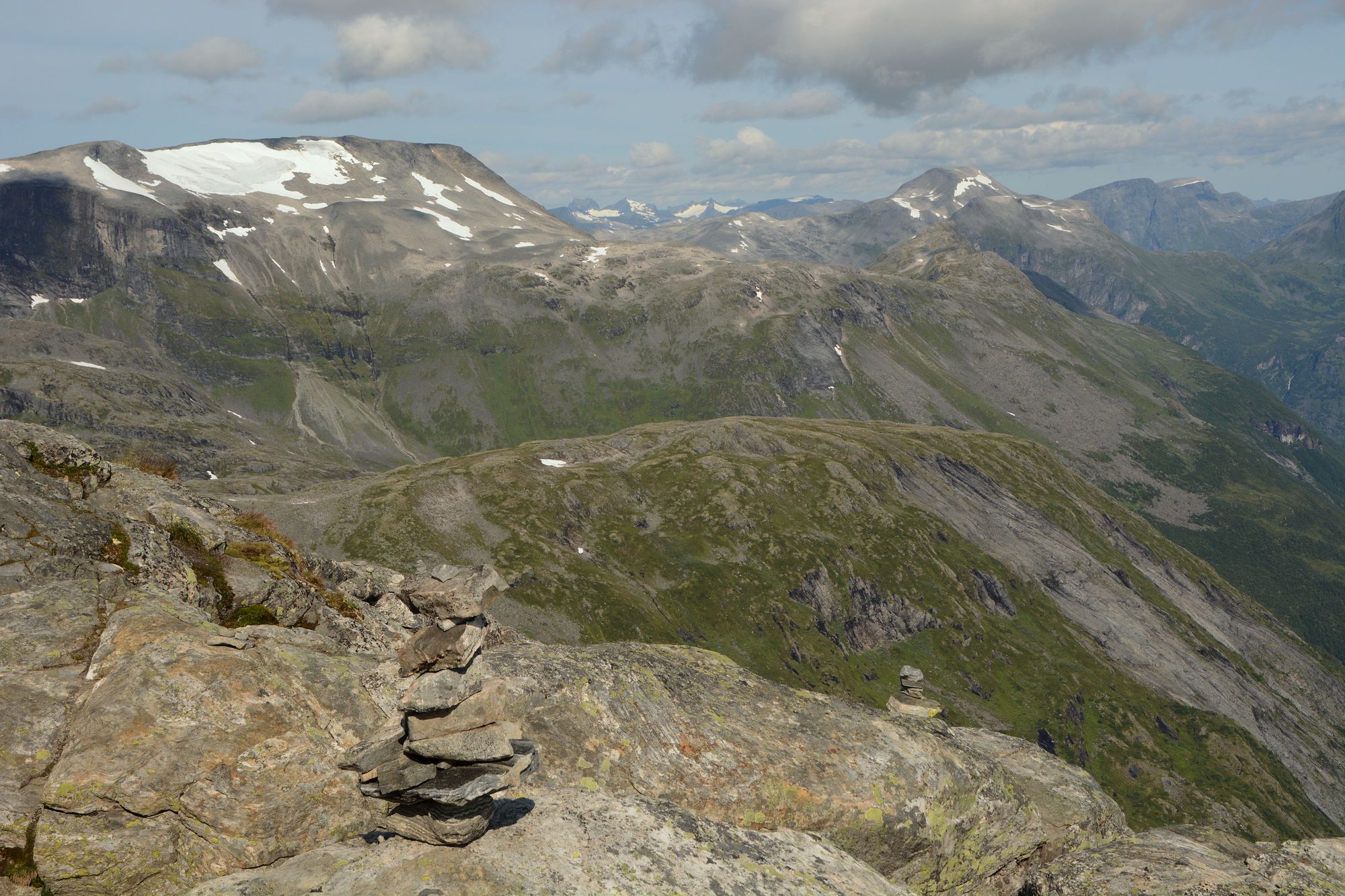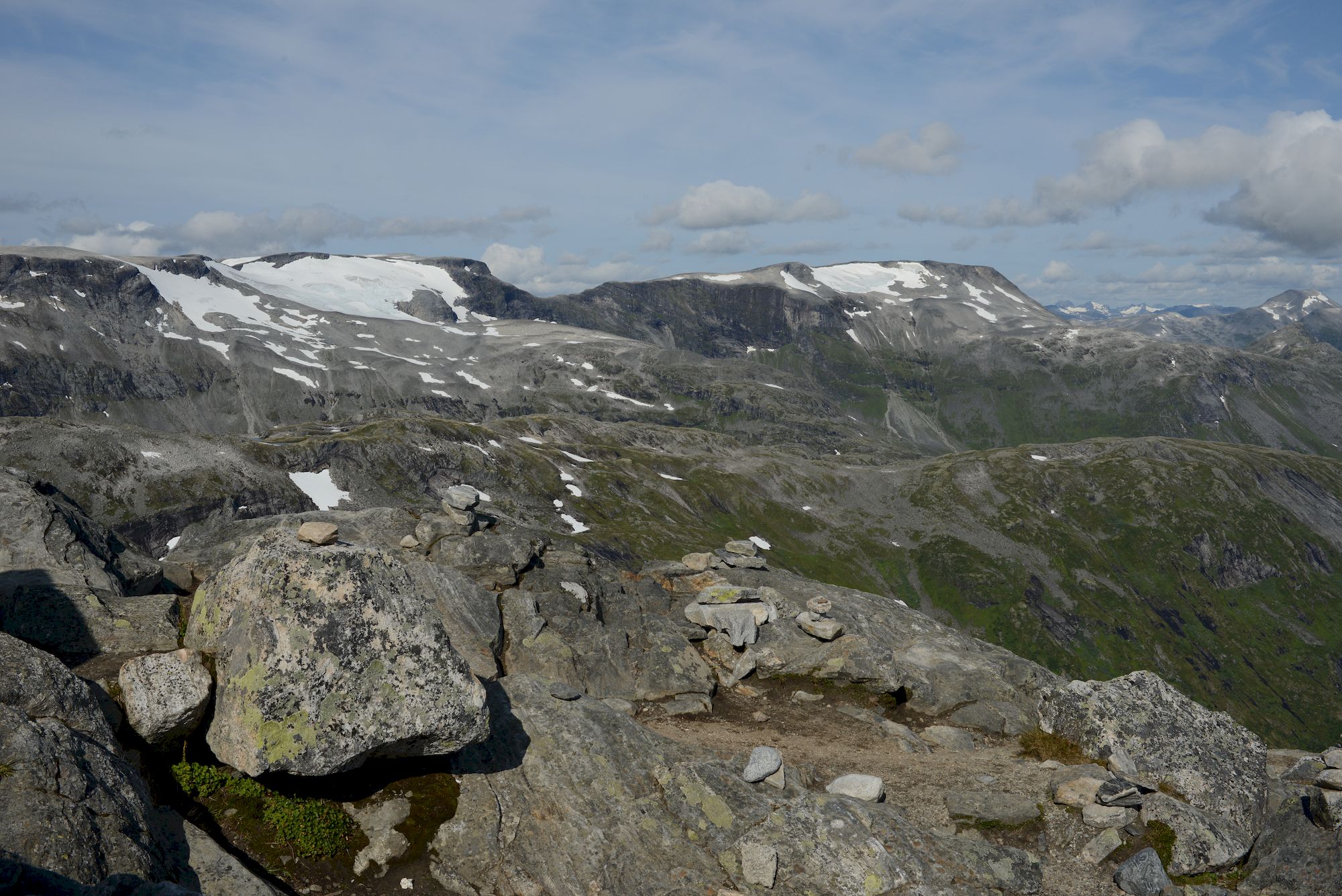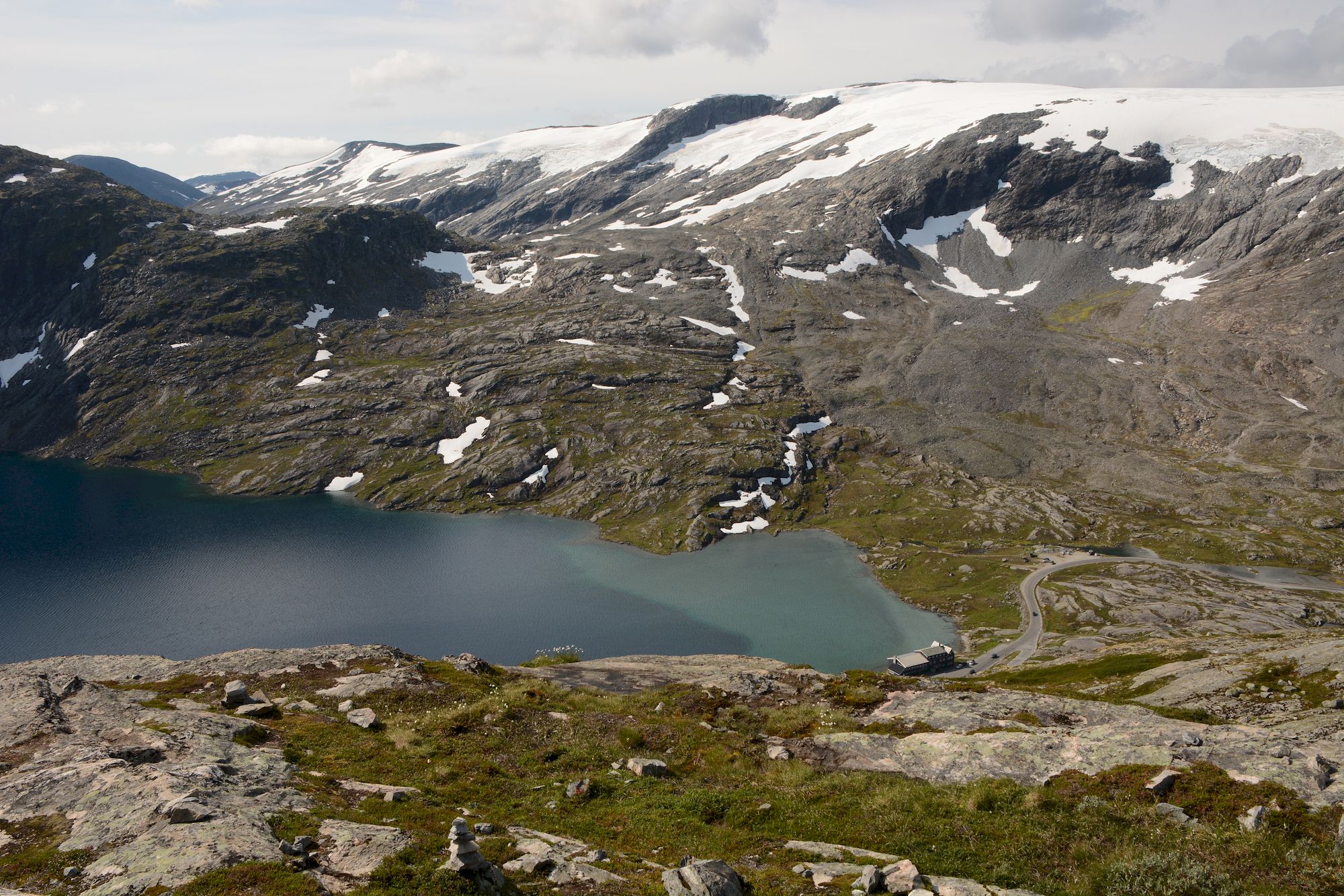 Dalsnibba (1476m) ist eine Mautstrasse und kostet 330NOK. Das ist es aber echt wert, denn der Ausblick von oben auf den Geirangerfjord, aber vor allem auf die grandiose Bergwelt, ist wirklich klasse. Nicht umsonst heisst das auch Skywalk. Wir drehen eine Runde und sind hin und weg. Ein einziges, kleines Kreuzfahrtschiff liegt heute unten im Fjord, obwohl es so beschrieben ist, dass da dauernd richtig viele ankern.