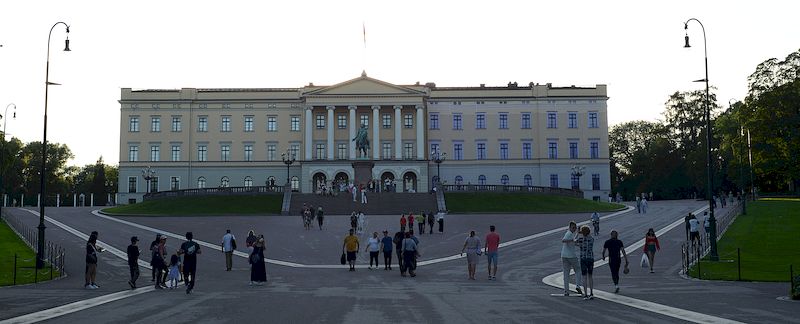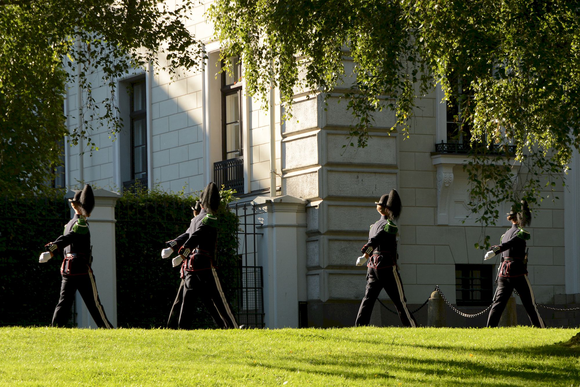 Wir wollen vor dem Auschecken noch etwas durch Oslo schlendern - einfach so wie uns der Wind treibt. Wir beginnen gegenüber dem Hotel im Schlosspark. Dort sehen wir zufällig wie die Wachen in den Minihäuschen abgelöst werden.