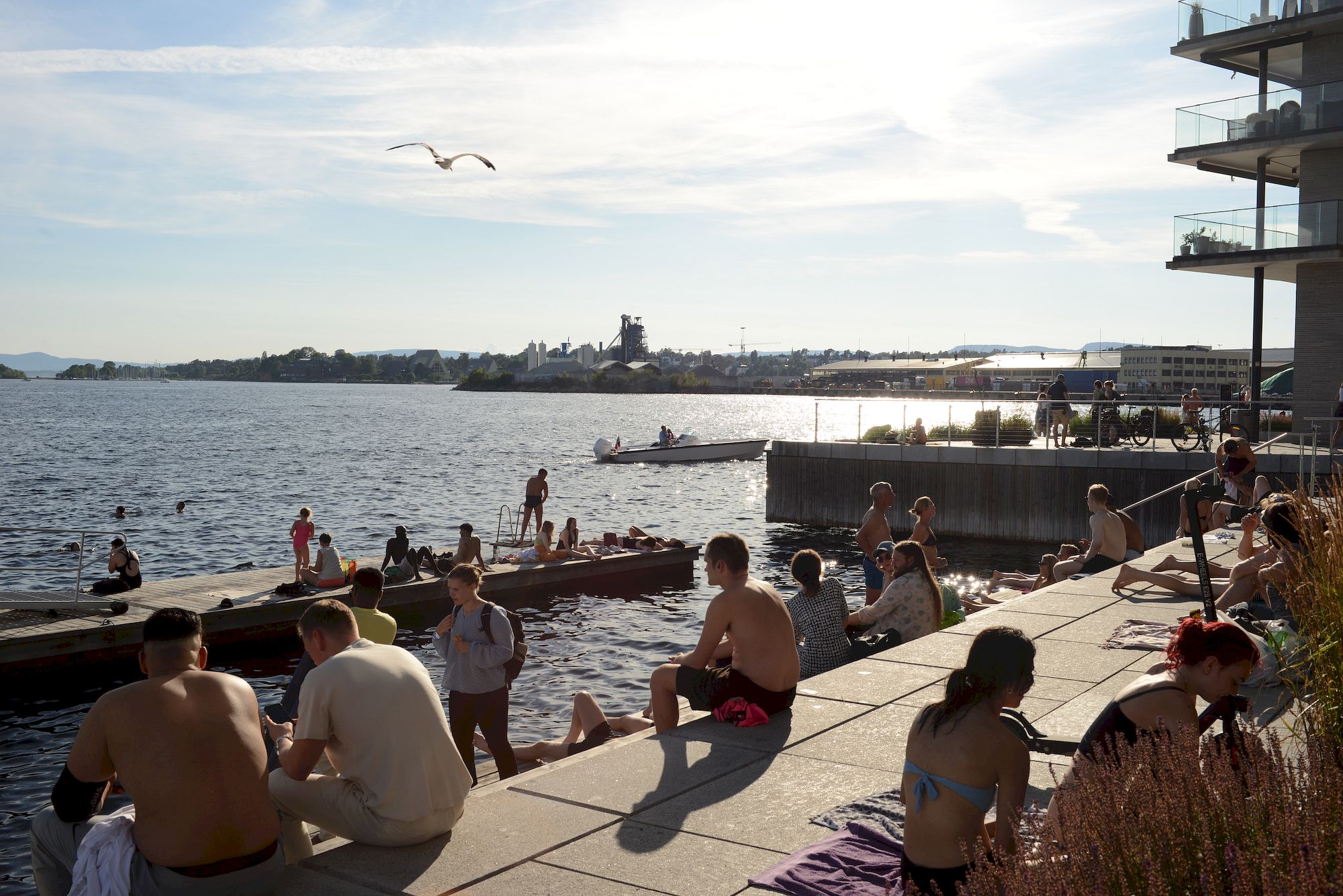 Am Meer angekommen halten wir uns rechts. Offensichtlich lieben die Norweger es am Meer zu sein. Einige sind am Schwimmen, sitzen in Booten (oder Jachten) und geniessen ein Glas Wein oder liegen dösend auf der Wiese. Das