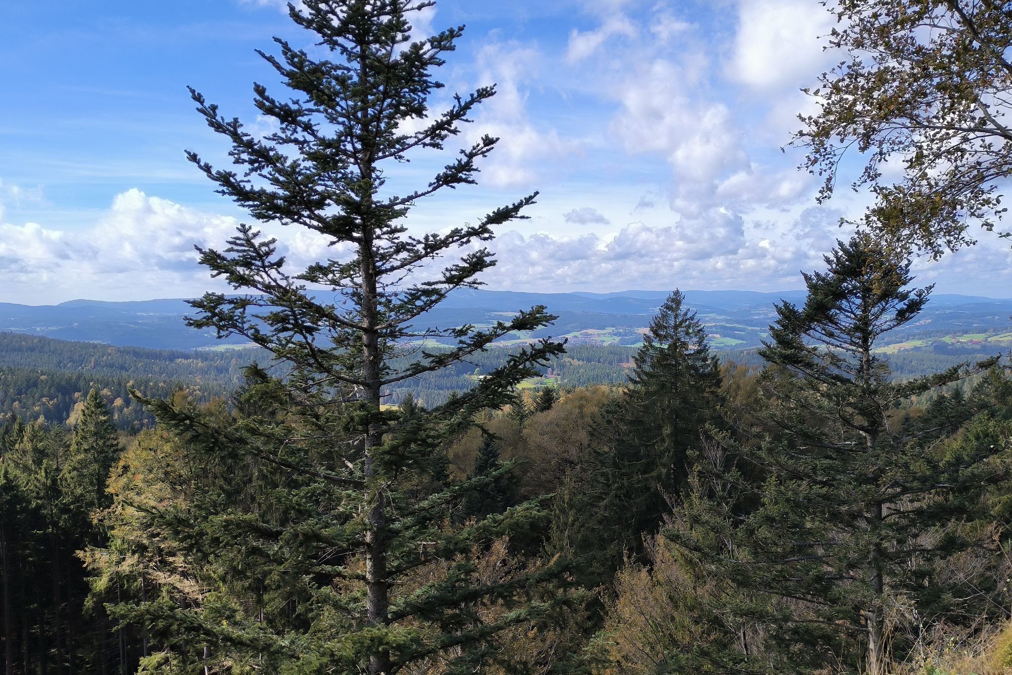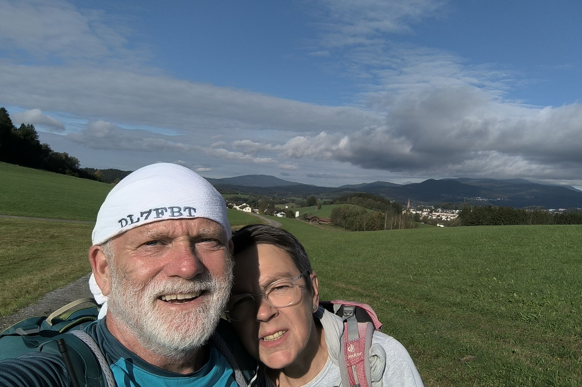 Die Straße geht sehr steil in einen Schotterweg über. Das hatten wir im Höhenprofil gesehen, aber auf Teer und Schotter.... Oben angekommen führt der mittlerweile bessere Weg horizontal weiter. Zurück sehen wir Zwiesel, den großen Arber und den Falkenstein. Beide noch im Nebel.