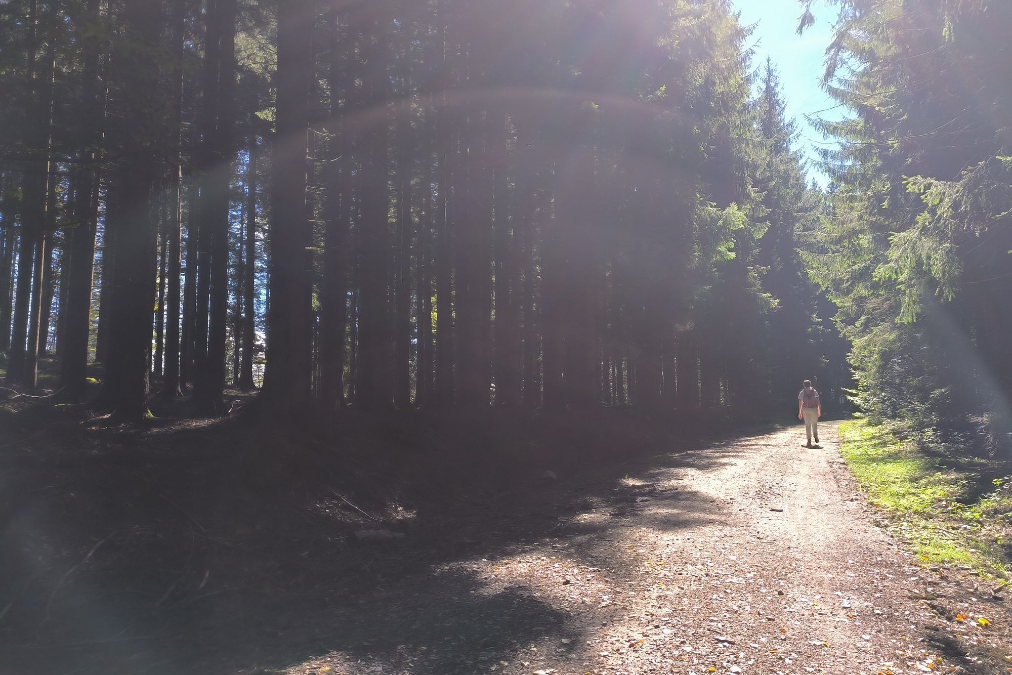 Spiegelau. 22,7km. Nach den Erfahrungen der beiden letzten Tage erwägen wir mit dem Bus zu verkürzen. Das Wetter ist aber so toll, daß wir doch den ganzen Weg laufen wollen. Das Hotel bietet uns an, statt nur die Koffer, das Auto nach Spiegelau zum Hotel zu bringen. Toll. Das erspart uns am Abreisetag mit dem Bus oder Bahn nach Zwiesel zurück zufahren.
