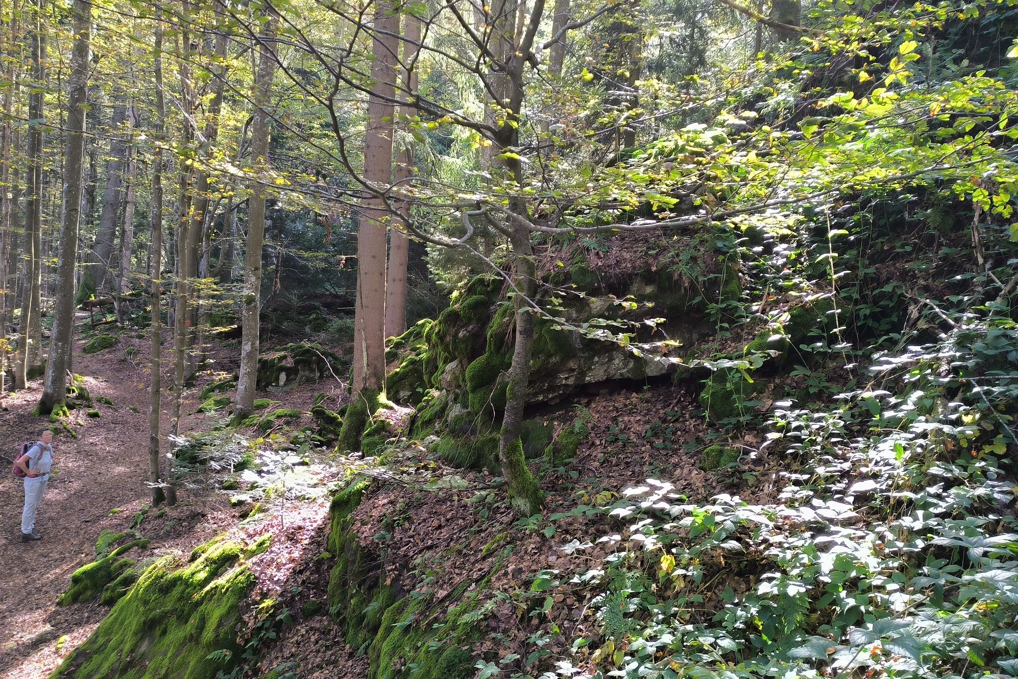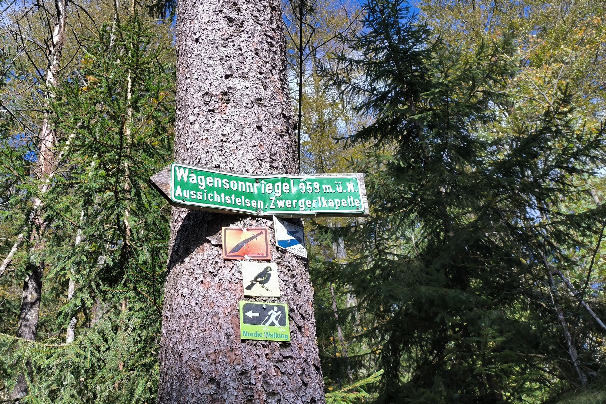 Wir steigen durch einen tollen Wald immer weiter hoch bis zum Wagensonnriegel auf 959m. Das ist ein sehr schöner Aussichtspunkt, wenn auch eine lautschwätzende E-Bikefahrergruppe gerade hier ist und die Idylle stört.